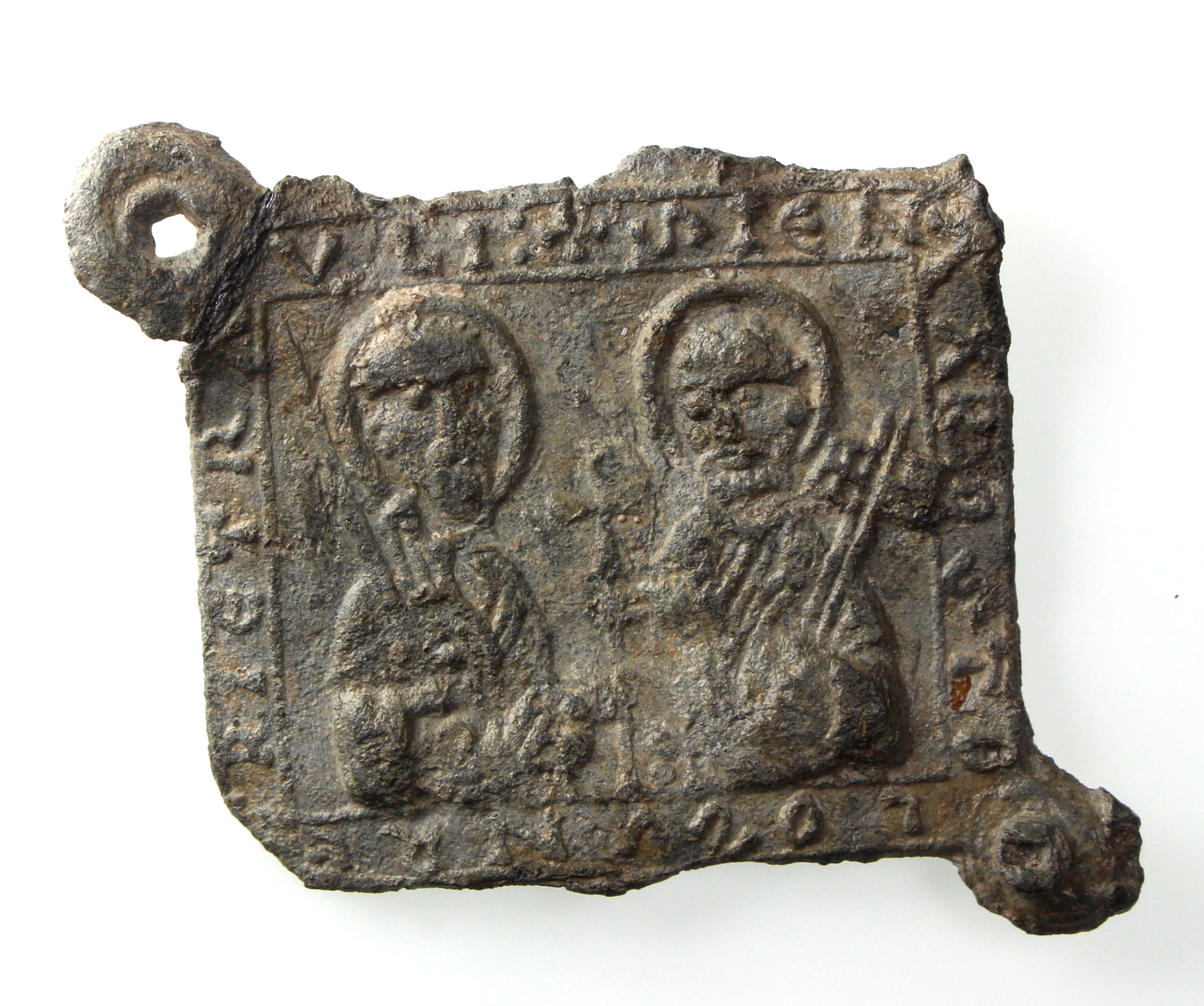 Pilgrims badge, lead. Rectangular plaque depicting Saint Peter and Saint Paul in moulded relief within an inscribed border. The plaque is complete with the exception of two sewing loops (one missing and the other is present but has broken off). The motif comprises St Paul on the left (with a pointed beard and bald head) and St Peter on the right (with a rounded beard and hair on his head). Both saints are depicted nimbate and dressed in robes and both hold their symbols in their outer hand. St Paul holds a sword (a symbol of martyrdom by beheading) and St Peter holds a cross on a staff (a symbol of his martydom by crucifixion) and a key (a symbol of the keys of heaven). The inscription starts half way along the upper border and reads [+] SIGNA APOSTOLORVM PETRI ET PAVLI The underside is flat and plain. Date c.early 13th/14th century. Width of panel 35mm (47mm including sewing loops). Height: 30mm (37mm Inc. sewing hoops). Wgt: 14.8g