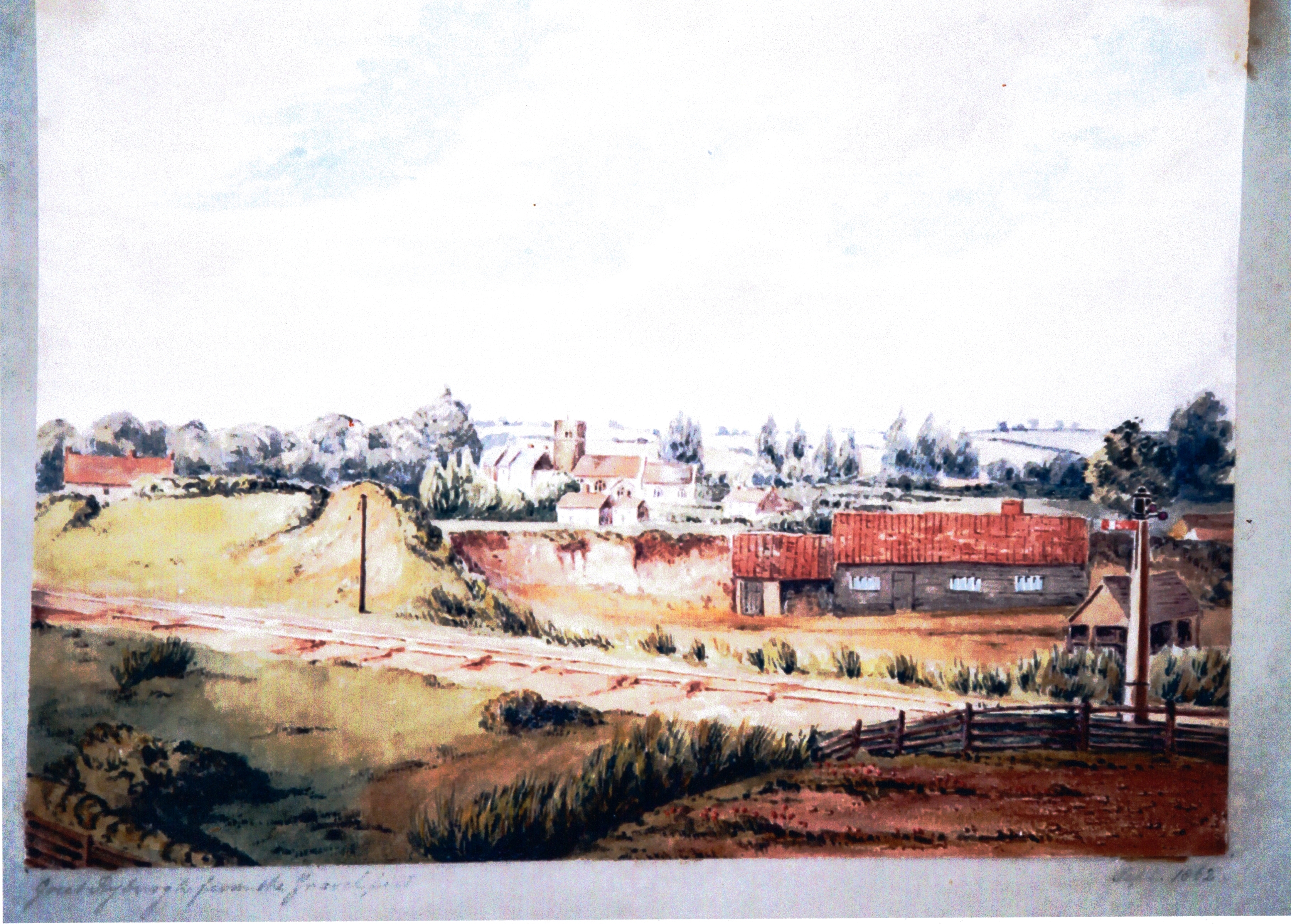 There is no doubt where in the village to find the Parish Church of St. Andrew! By way of a view that is not so frequently seen, this watercolor was made in 1862 by Emily Jane Sweet wife of the Rector of Colkirk and Stibbard Revd. James Bradby Sweet from 1857 - 1870. It was painted from the gravel pits above the railway line, looking North across Mill Road .