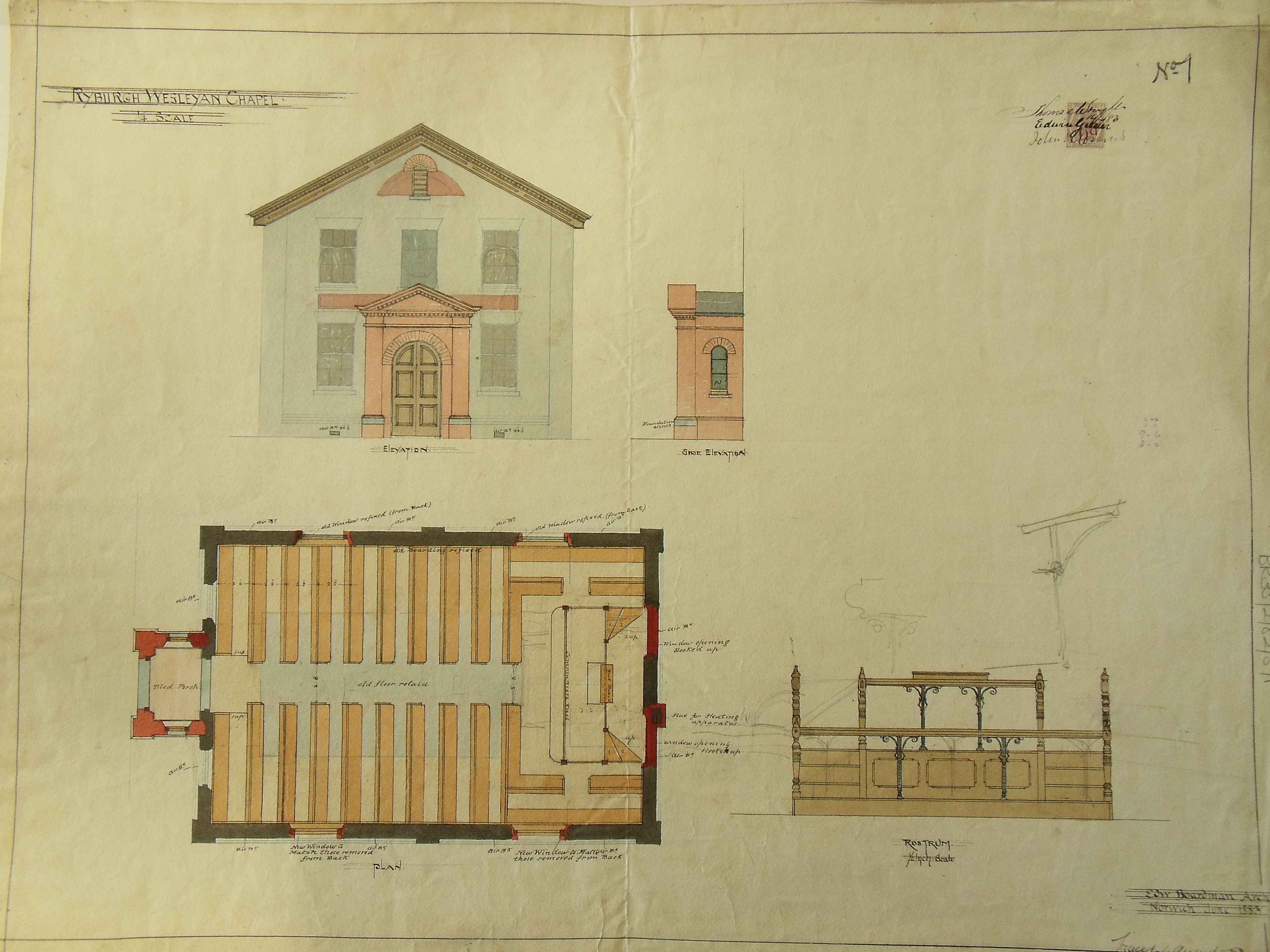 The Sunday Census returns tell a different story however and we must begin with the building we knew as the Methodist Chapel built in 1845 and lately purchased by Crisp Malt as additional office space. At the time of the Census the building presented a very different facade, with large stone signage prominently across the building at first floor height proclaiming “Ryburgh Wesleyan Chapel” as seen on the plan below associated with the 1883 restoration. The proposed outline of the windows that we see today can be discerned on the plan along with upper and ground floor sash windows. It is not clear from this whether the windows were existing or a proposal later superseded by the existing tall windows. They certainly look in keeping with the 1845 date of construction and suggest that the chapel also had a gallery at that time. What is also unclear is whether the underfloor heating boiler that was housed centrally near to the front doors and was connected to the flue at the rear, was original to this restoration. It is certainly associated with the insertion of the two tall windows on the South gable either side of the porch; the reason being that the stone signage sections were used to roof the horizontal flue under the floor. This was uncovered during Crisp’s renovations and a section of it was recovered from disposal in the skip and is now incorporated into the William Martin Building that was under construction at the time.
