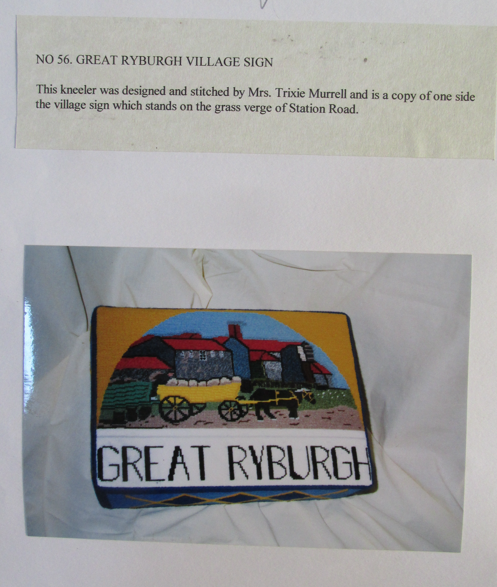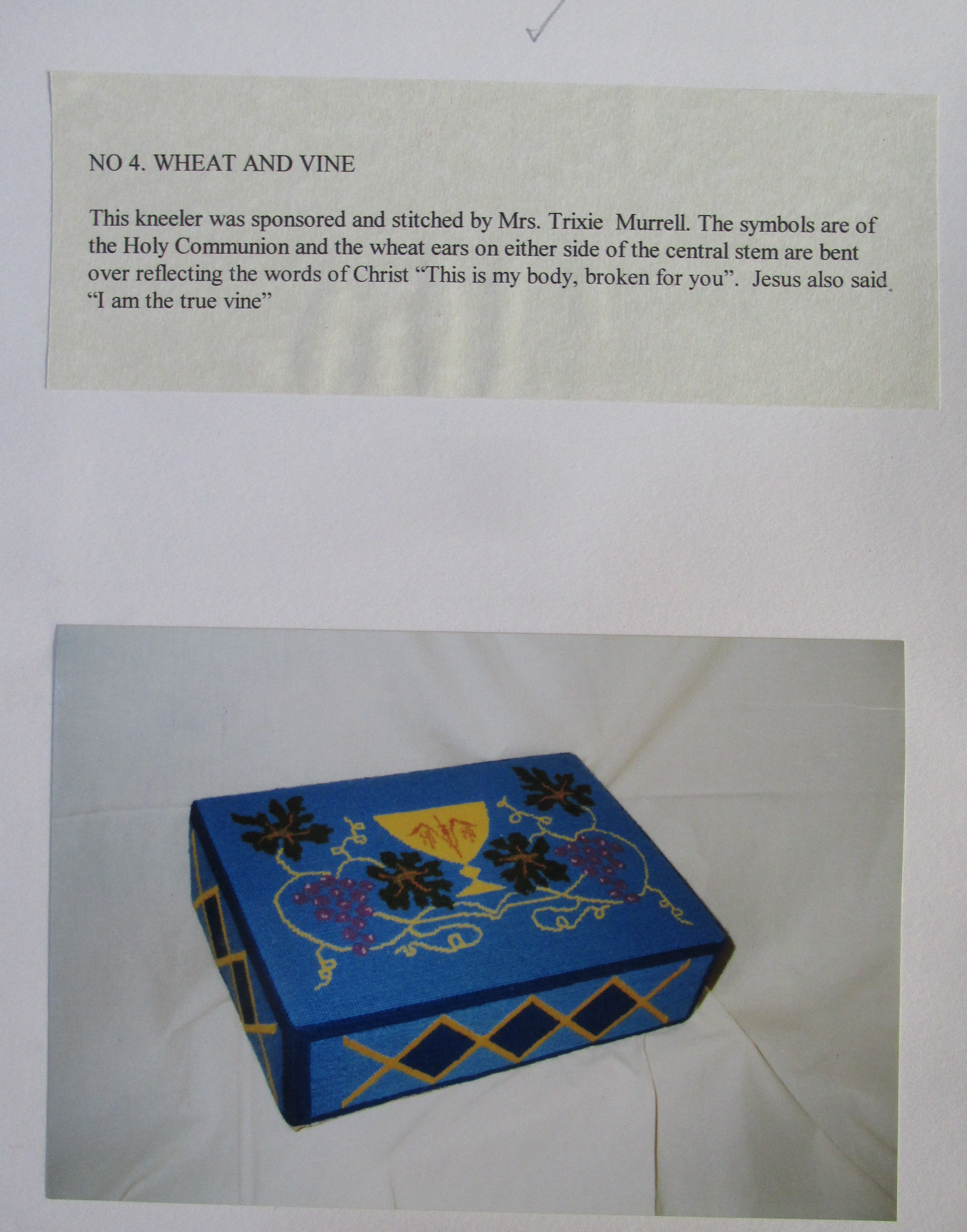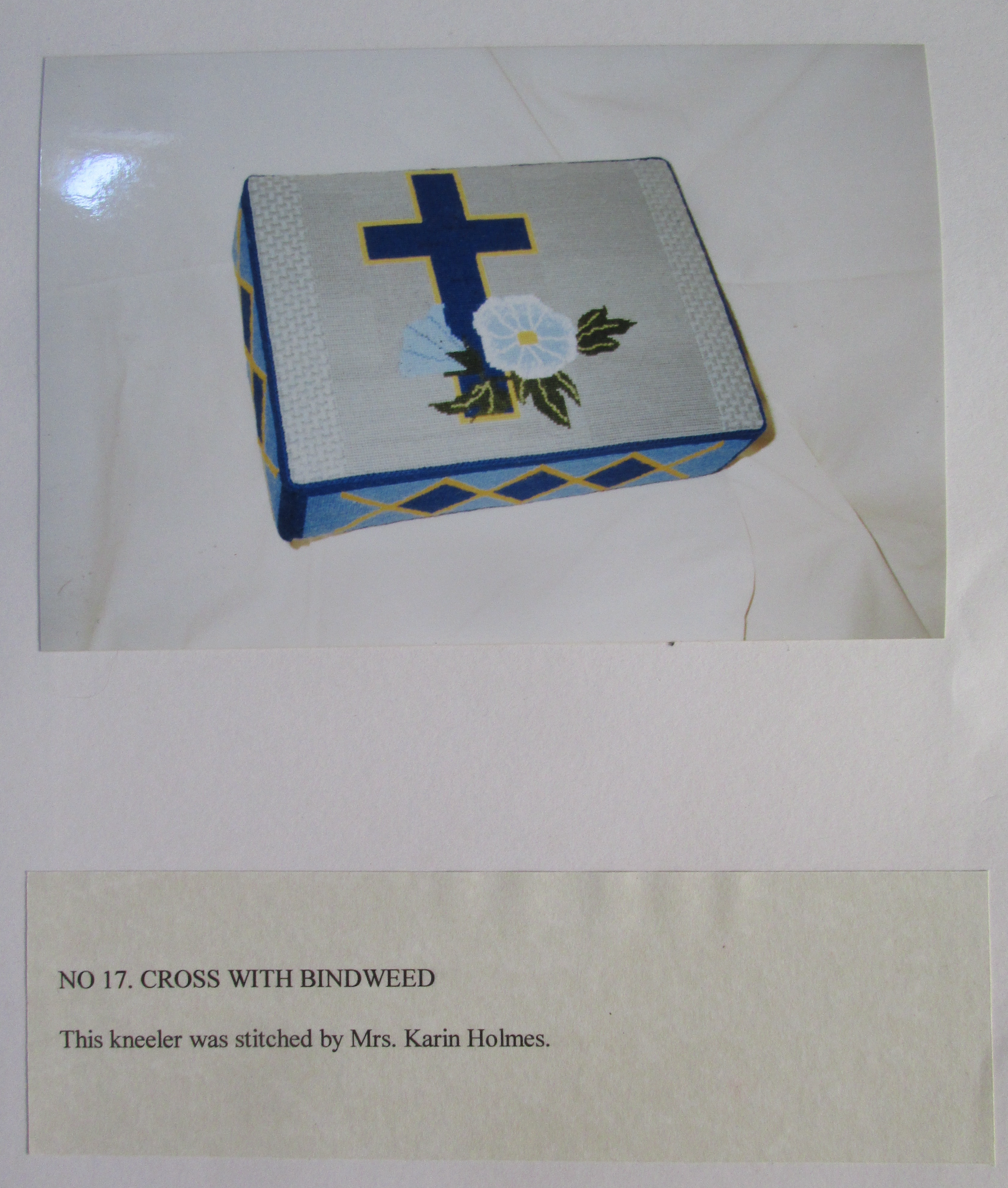 The colourful kneelers in the church as well as being strikingly impressive, hold a special place in the memories and hearts of those that took part in the project. There has long been a boxed book in the church with photographs and details of subject, stitcher and dedicatee. Because the "real thing" occupies the attention, this photographic record is frequently overlooked and so before the photos deteriorate those pages are now reproduced here to perhaps reach a wider audience?