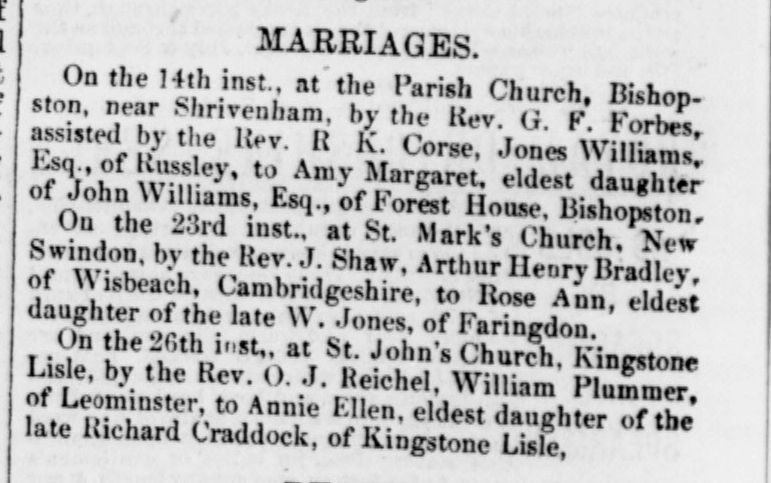 He went away a single man probably to Great Coxwell in Berkshire where he met and married Rose Ann Jones. She was the daughter of William Jones, a tailor from Faringdon. They were married in the Parish Church of New Swindon on November 23rd.1878.