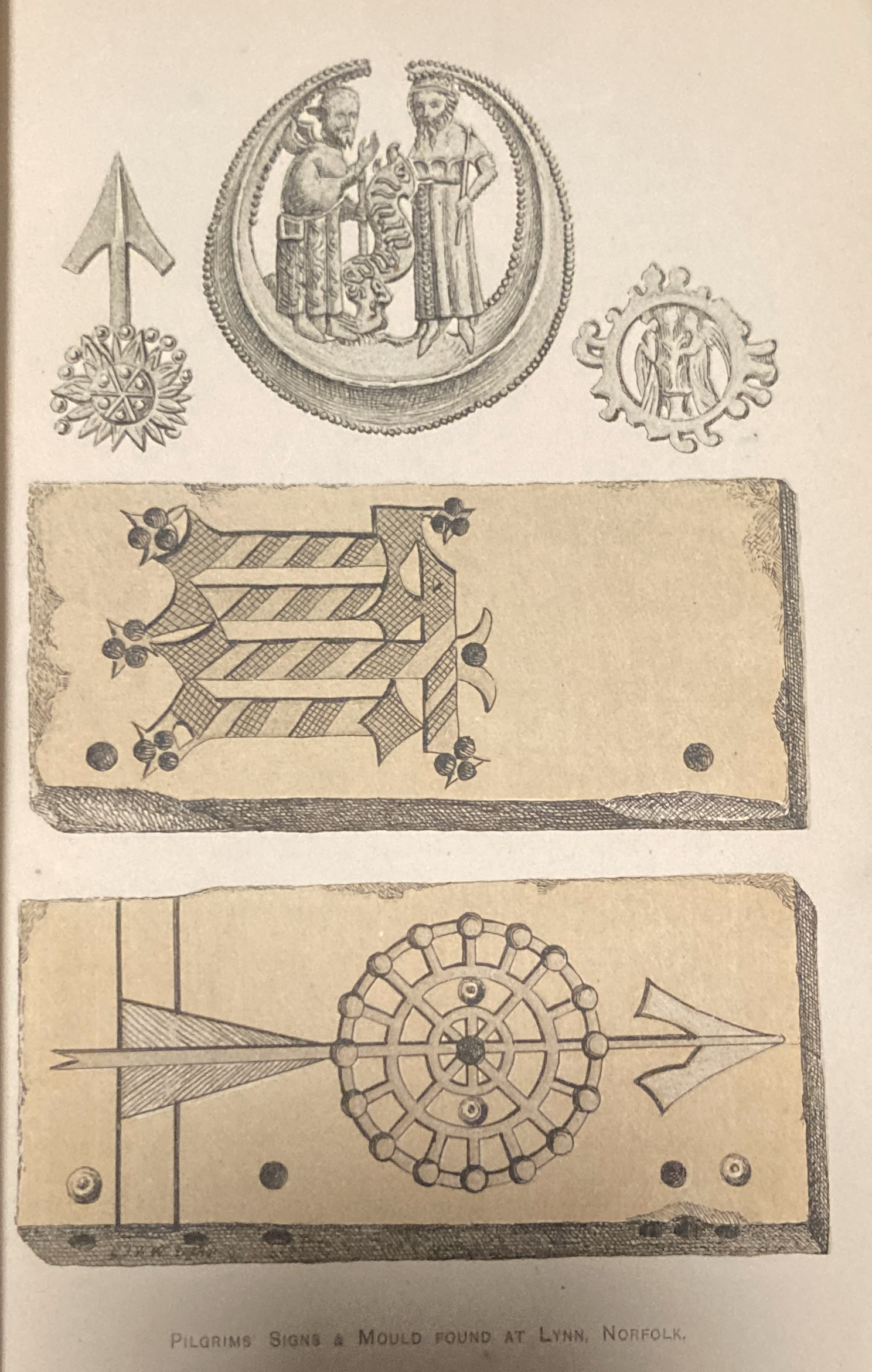 by an arm. These when cast in lead would form a “broche” to be worn on the dress or on the hat, as signs that the wearer had visited