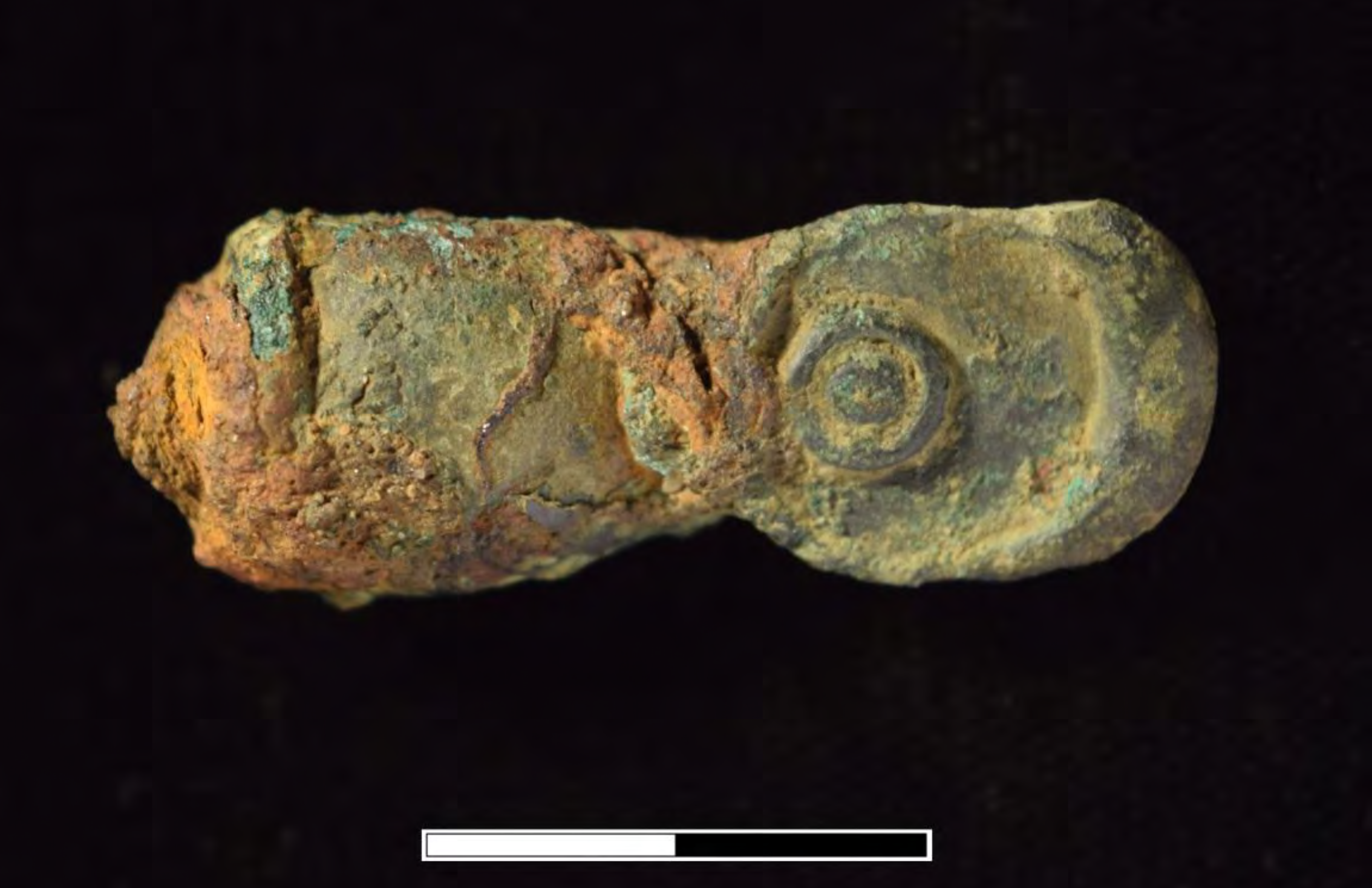 Terminal of lynch pin with vestige of square shaft surviving in socket, copper alloy/iron.