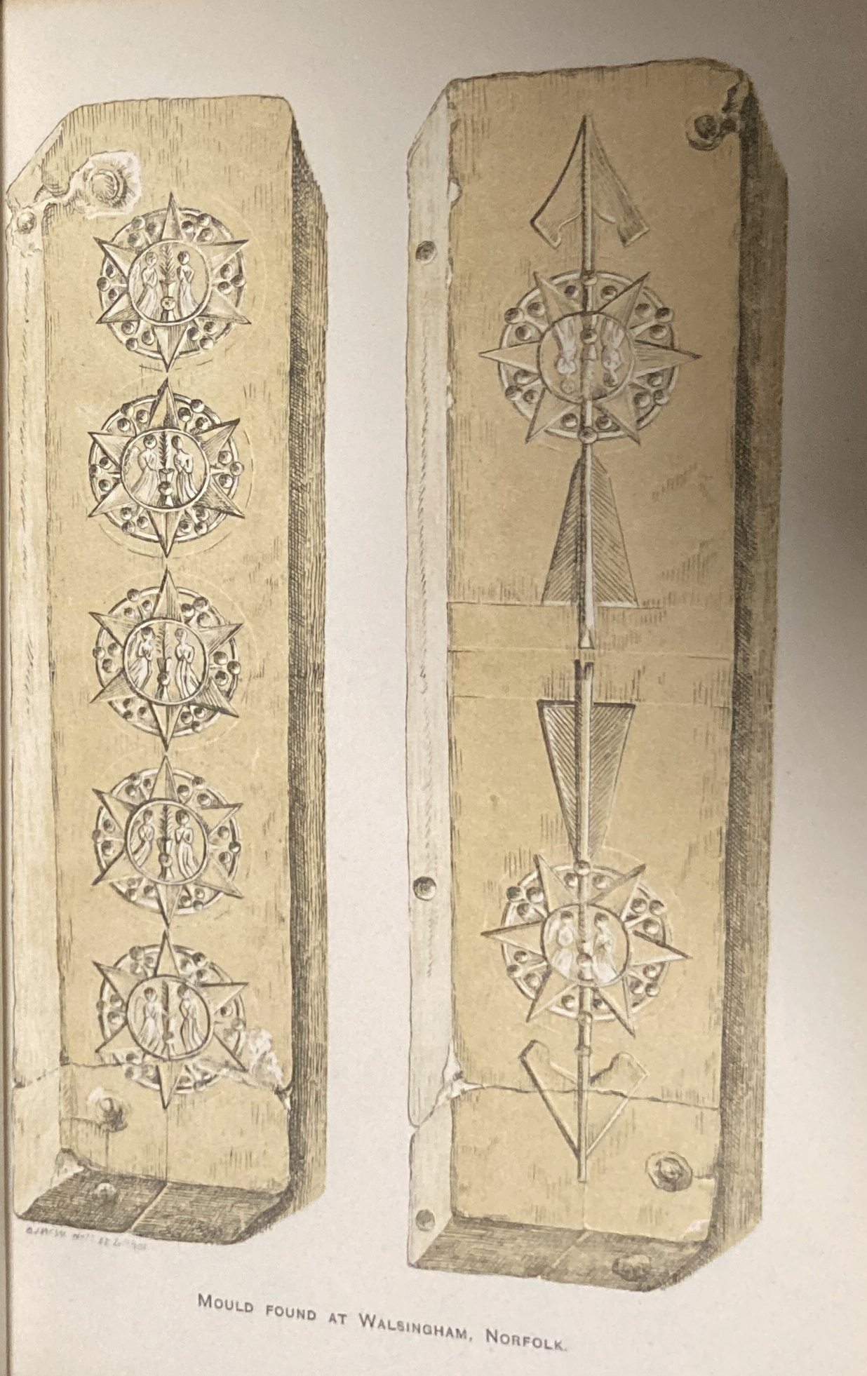 As a postscript I think that I must make amends for something that Morris Fuller omitted to do at the time. What he doesn’t say is that he “cut and pasted” the entire information regarding the pilgrim badges from an article by the Rev Charles Manning from Diss, found in Volume lX of Norfolk Archaeology from 1884, two years earlier than the above article. His edition of Manning's longer text is also muddled and consequently misleading. I also take the opportunity to add the two illustrations from that volume of the white lias moulds that accompanied the Revd. Manning’s original text.