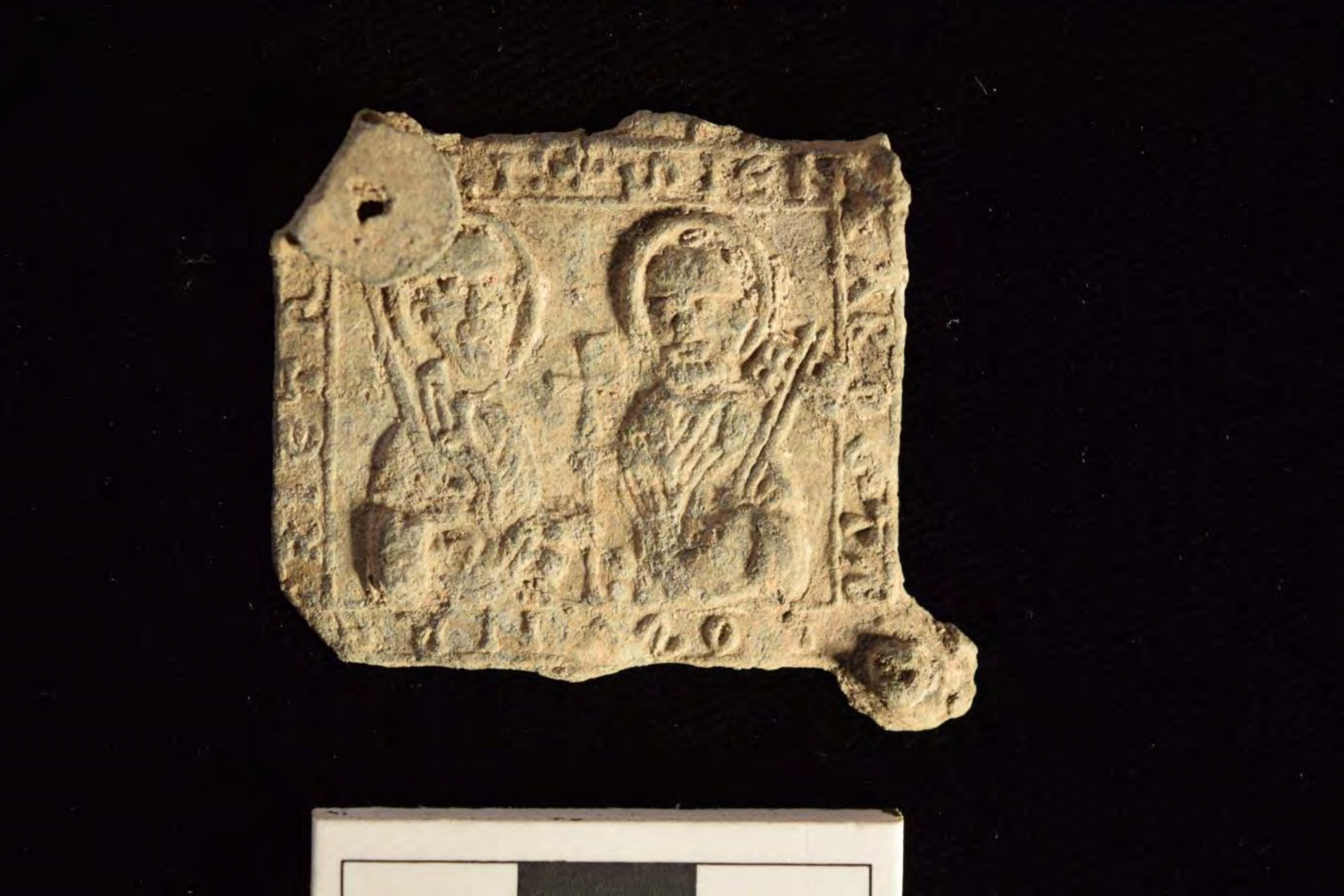Pilgrims badge, lead. Rectangular plaque depicting Saint Peter and Saint Paul in moulded relief within an inscribed border. The plaque is complete with the exception of two sewing loops (one missing and the other is present but has broken off). The motif comprises St Paul on the left (with a pointed beard and bald head) and St Peter on the right (with a rounded beard and hair on his head). Both saints are depicted nimbate and dressed in robes and both hold their symbols in their outer hand. St Paul holds a sword (a symbol of martyrdom by beheading) and St Peter holds a cross on a staff (a symbol of his martydom by crucifixion) and a key (a symbol of the keys of heaven). The inscription starts half way along the upper border and reads [+] SIGNA APOSTOLORVM PETRI ET PAVLI The underside is flat and plain. Date c.early 13th/14th century. Width of panel 35mm (47mm including sewing loops). Height: 30mm (37mm Inc. sewing hoops). Wgt: 14.8g