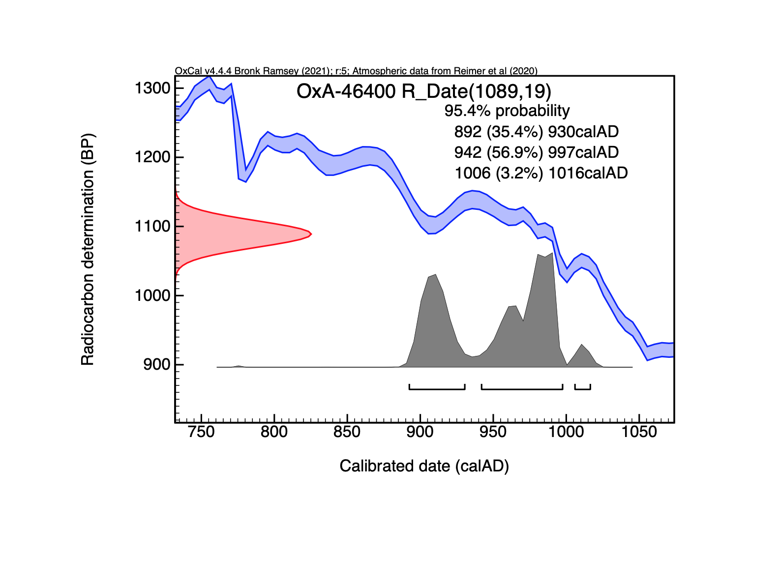 The range of possible ages is also shown at a 95.4% confidence. We can be 95.4% sure that the sample dates to between AD892 and AD1016 but the values given within the brackets give the relative likelihood of the individual ranges. The most likely that your sample dates to AD942 to AD997."