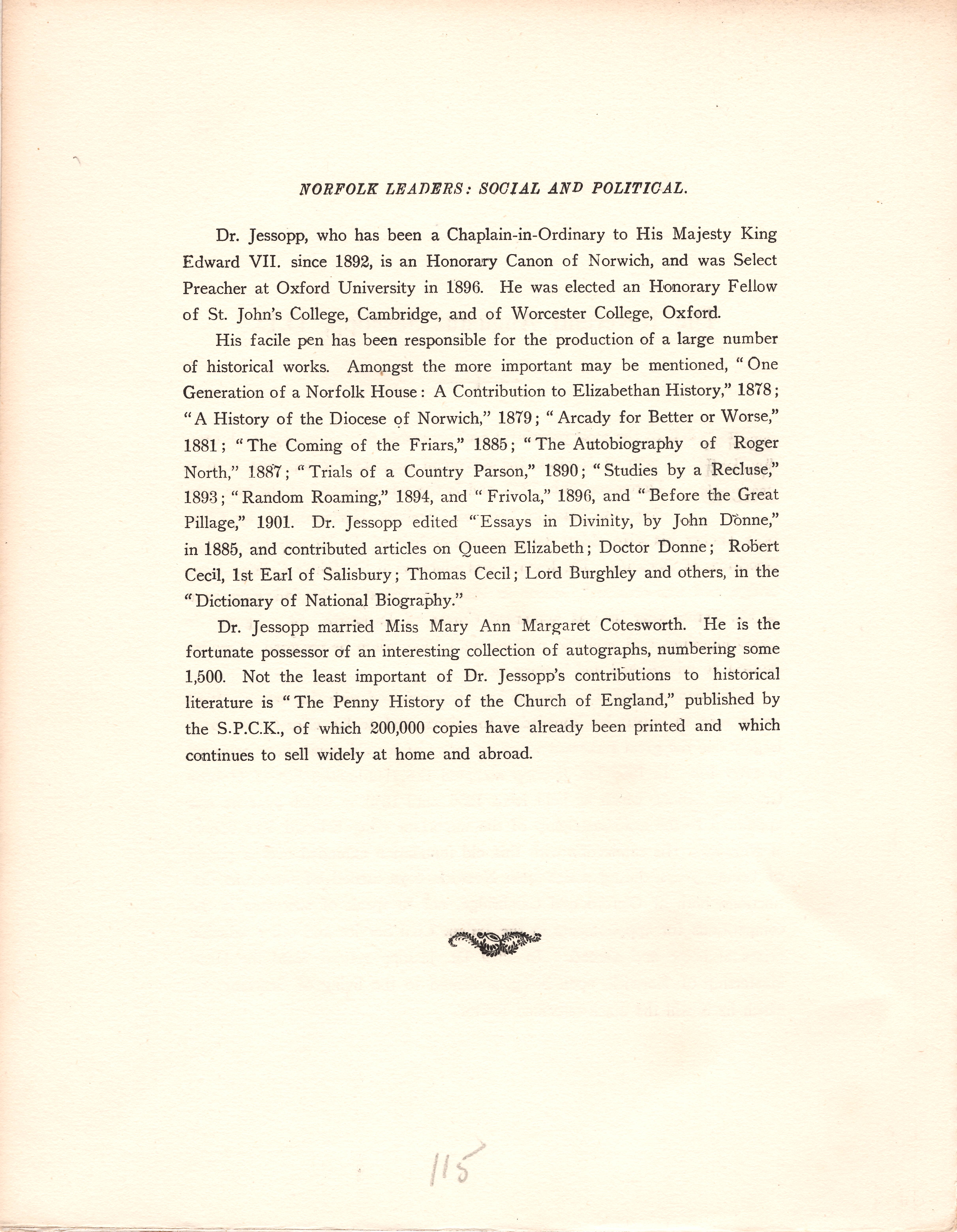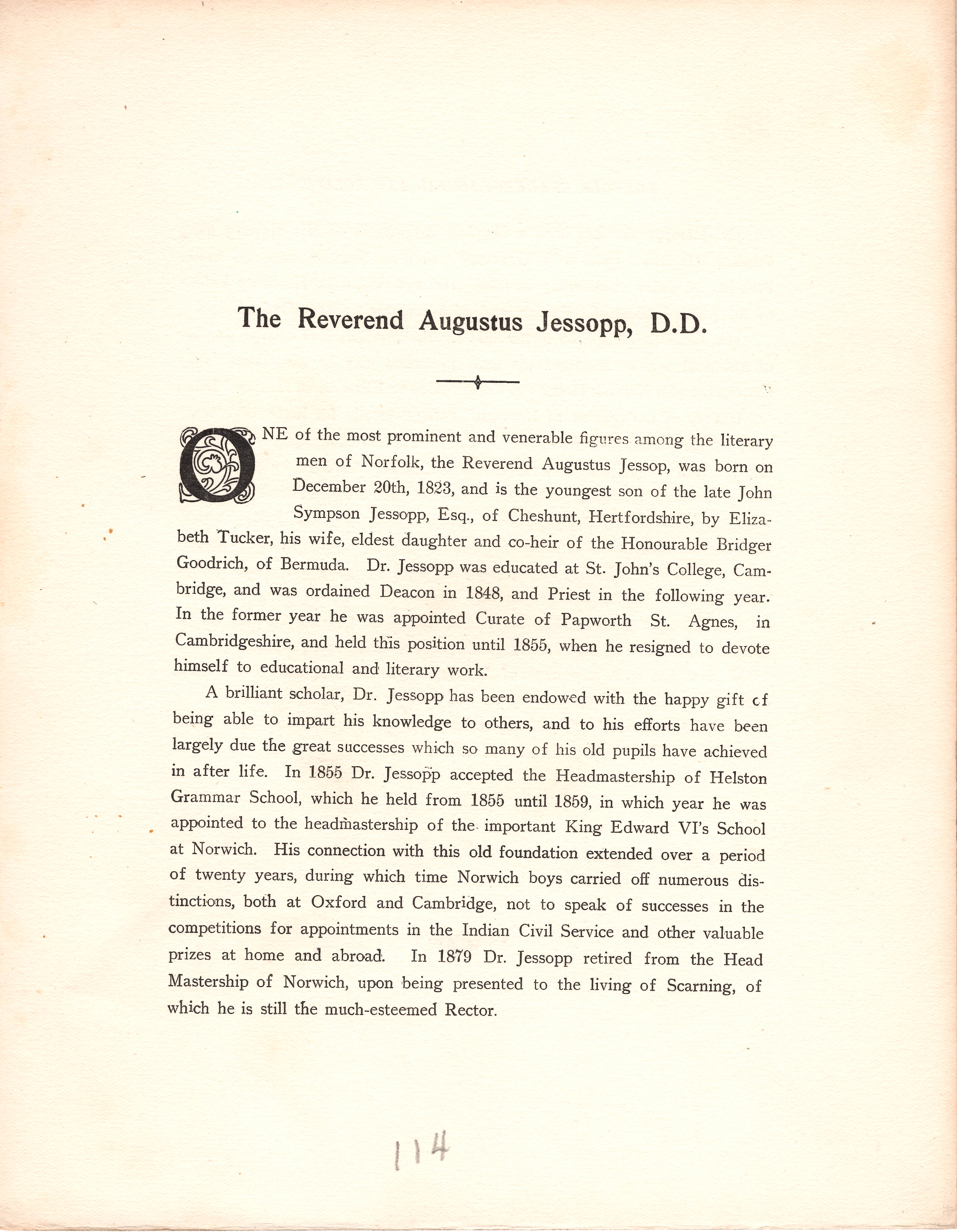 As for the good Doctor Jessopp, I first encountered him as being the headmaster of Norwich School when reserching Percy Everitt and for which he is well known as the man who established the reputation of that institution that continues today. The following comes from a publication entitled Norfolk Leaders, a privately printed book for private circulation only at a cost of 3 Guineas: