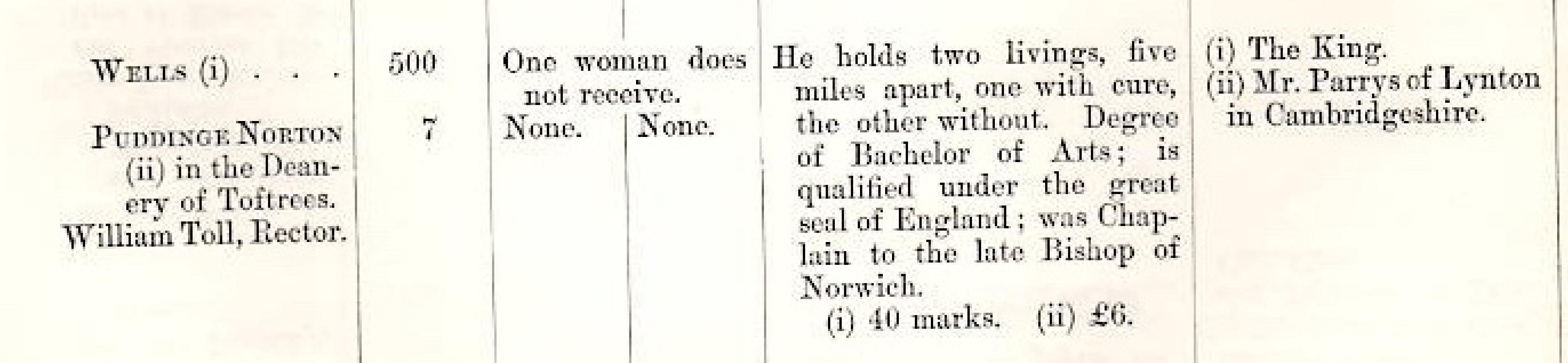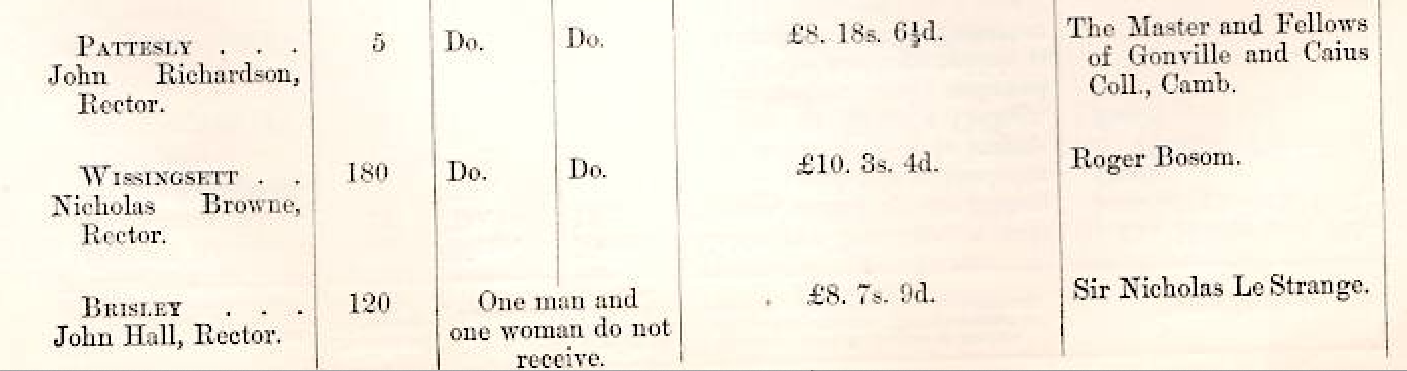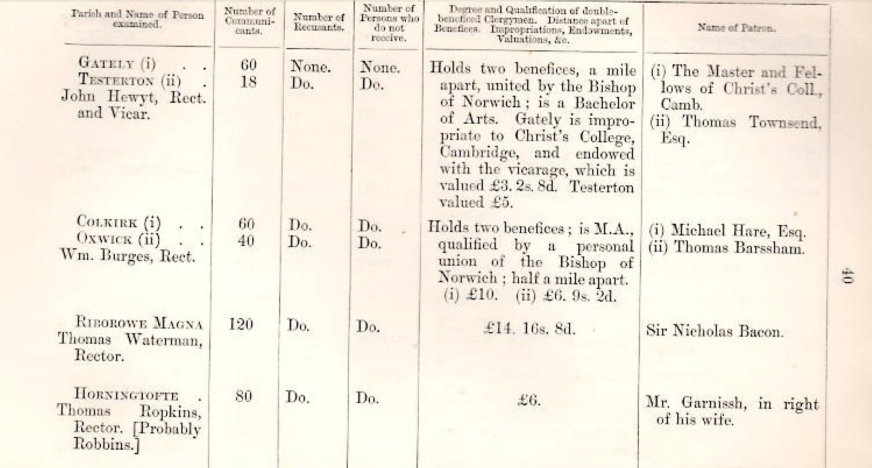 Upon reading this I consulted the table of results drawn from the questionnaires that were, in most cases, returned to the then Bishop of Norwich, John Jecon. My first port of call was Riborowe Magna which provides the following information, given minimally by Thomas Waterman, Rector: He had 120 communicants, no recusants and no persons who did not receive [communion] The valuation of the living was given as £14.16s. 8d. with Sir Nicholas Bacon as Patron. With that valuation it was then the most valuable of those churches that are now within our Benefice. It was however only in joint second place with Brisley in regard to the number of communicants as Whissonsett had the greater number with 180 persons.Gately and Colkirk were both pluralist livings as was Pudding Norton (with Wells). I could find neither Dunton or Little Ryburgh in the returns, and assumed that they were part of the Norfolk Archdeaconry that was not part of Jessopp’s paper: