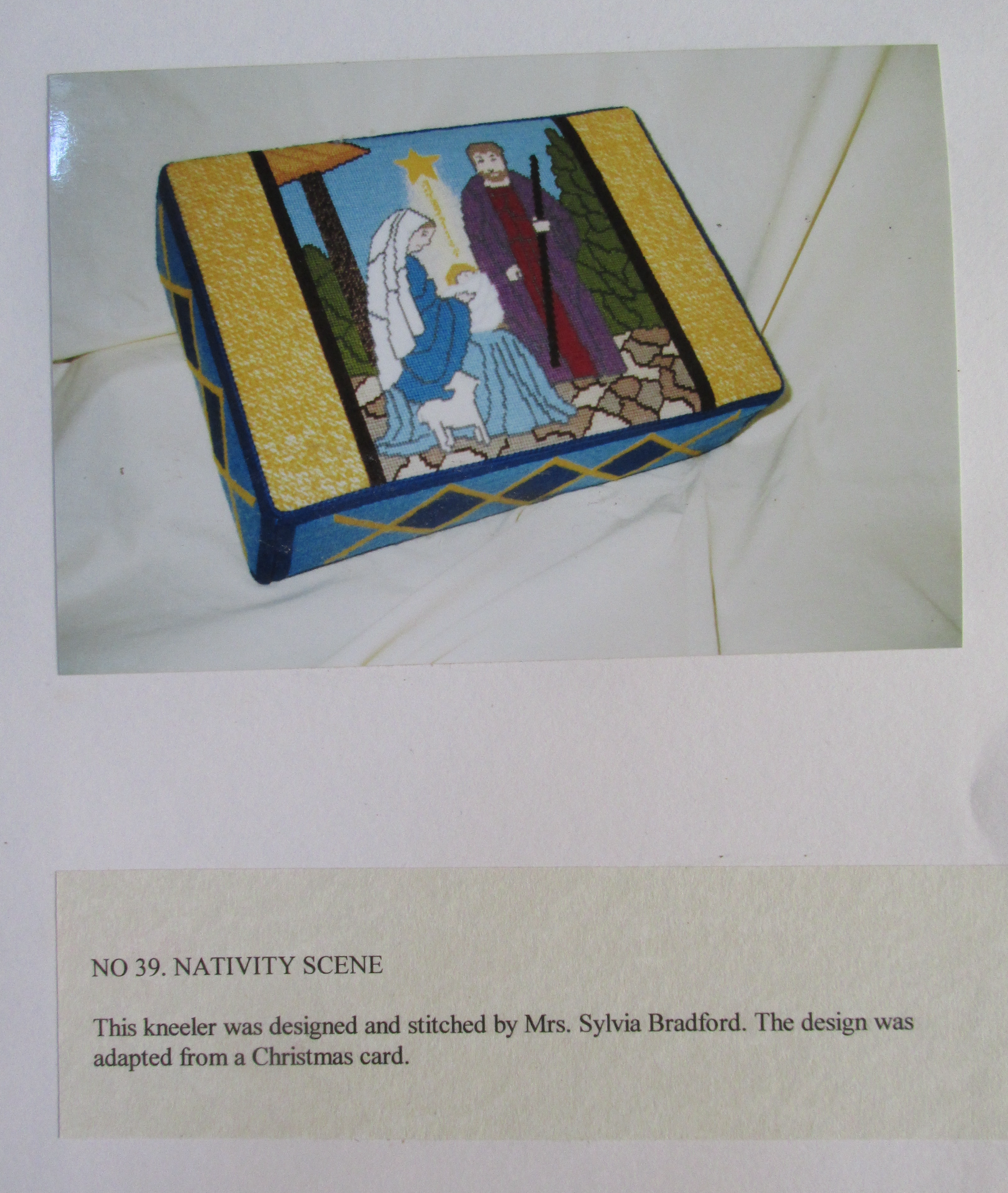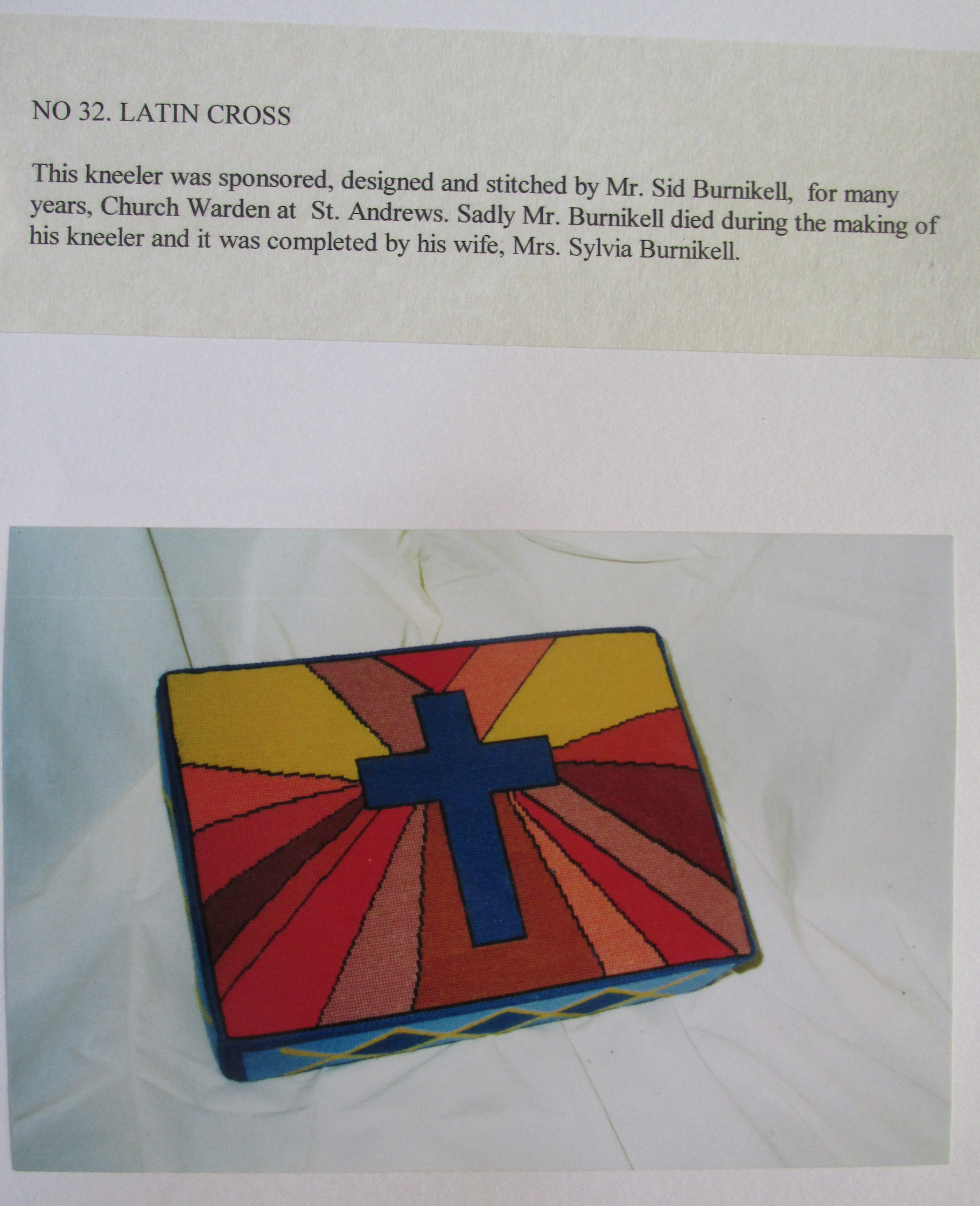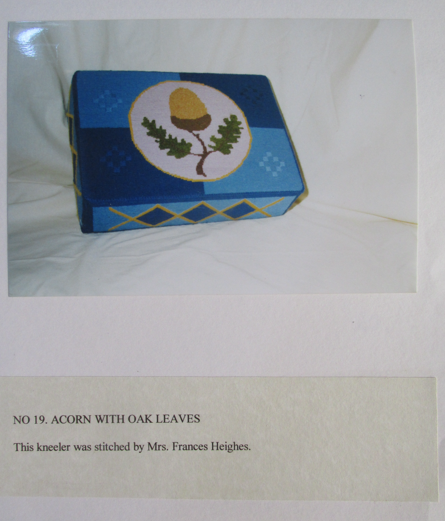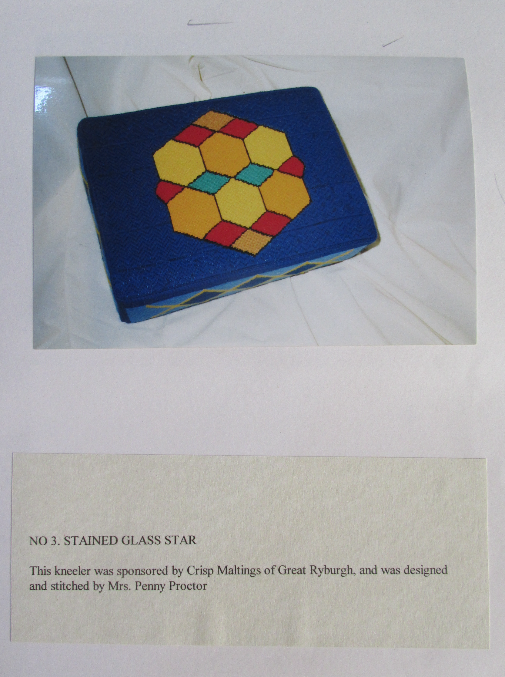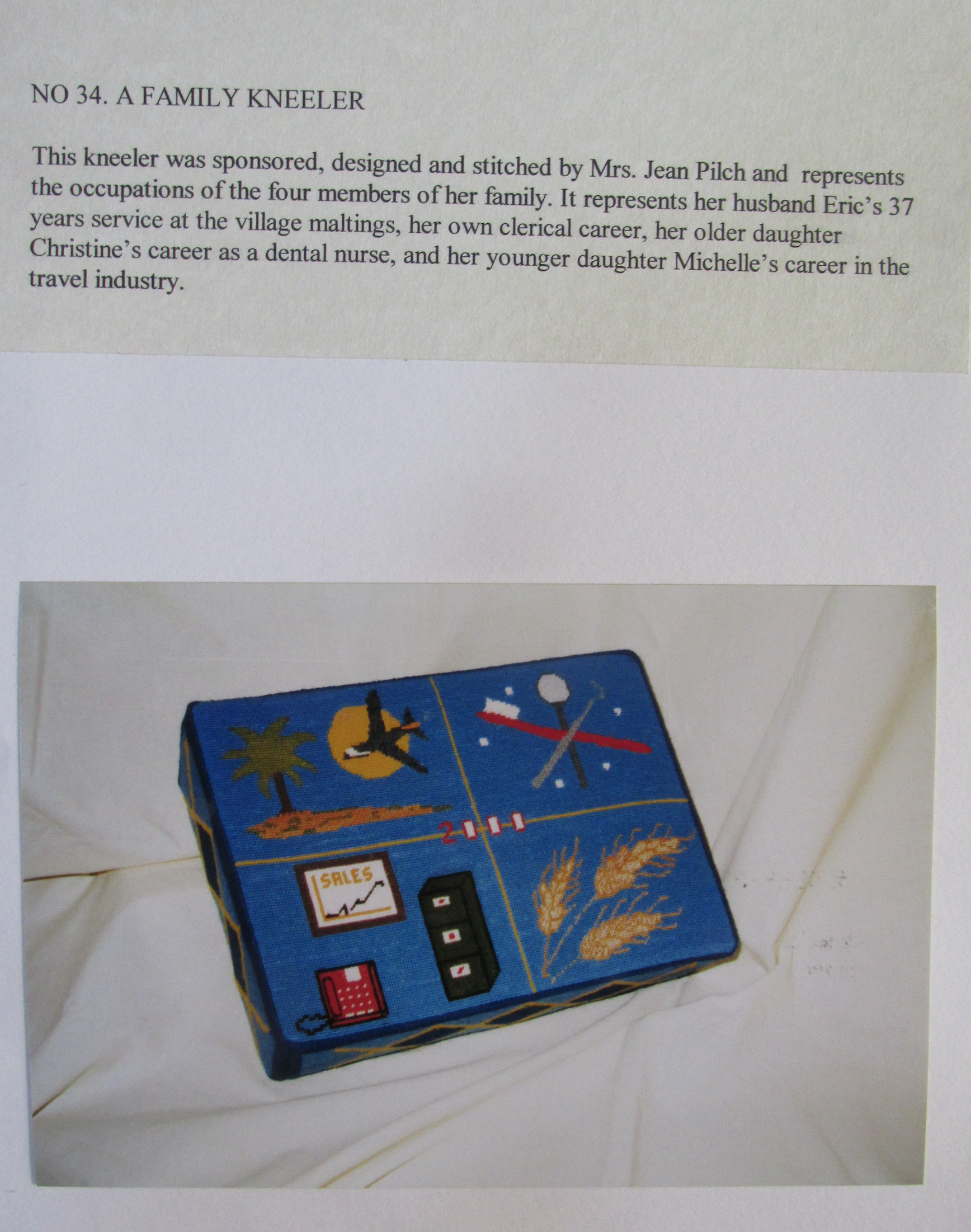The colourful kneelers in the church as well as being strikingly impressive, hold a special place in the memories and hearts of those that took part in the project. There has long been a boxed book in the church with photographs and details of subject, stitcher and dedicatee. Because the "real thing" occupies the attention, this photographic record is frequently overlooked and so before the photos deteriorate those pages are now reproduced here to perhaps reach a wider audience?