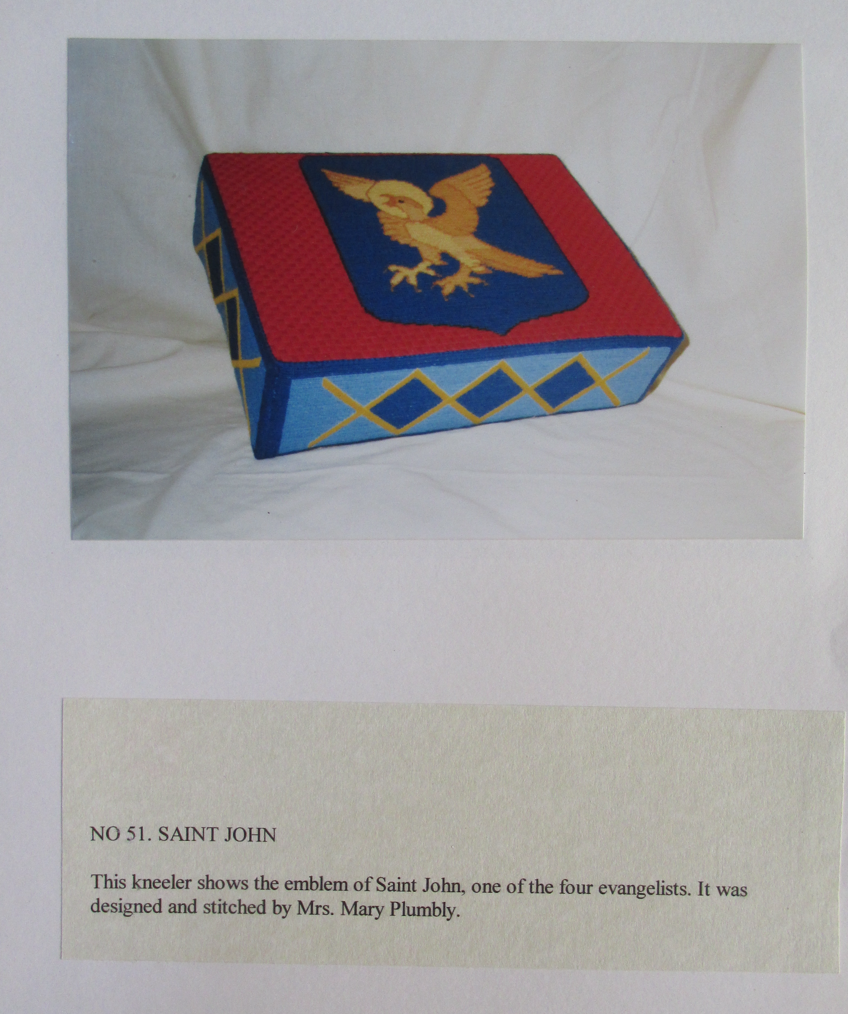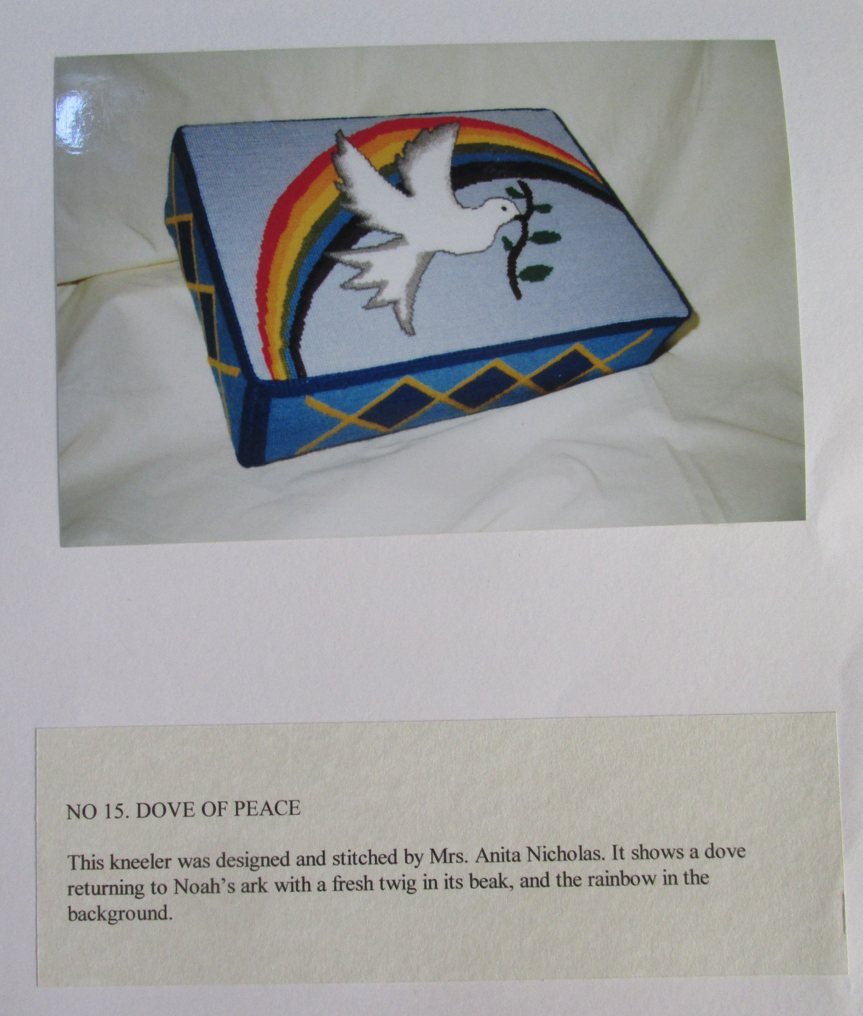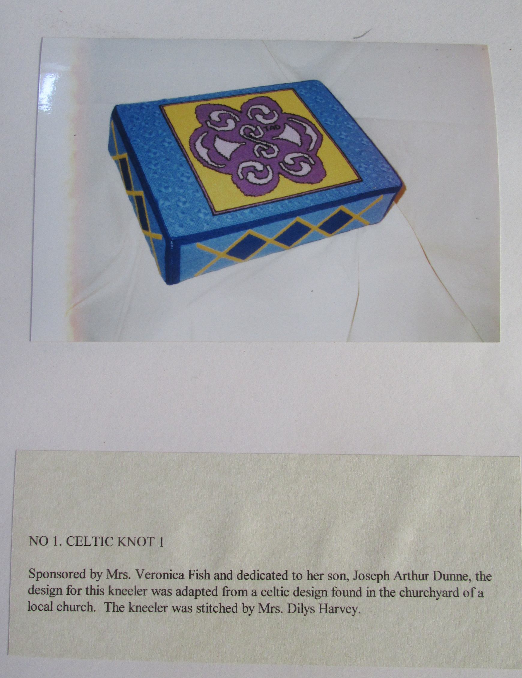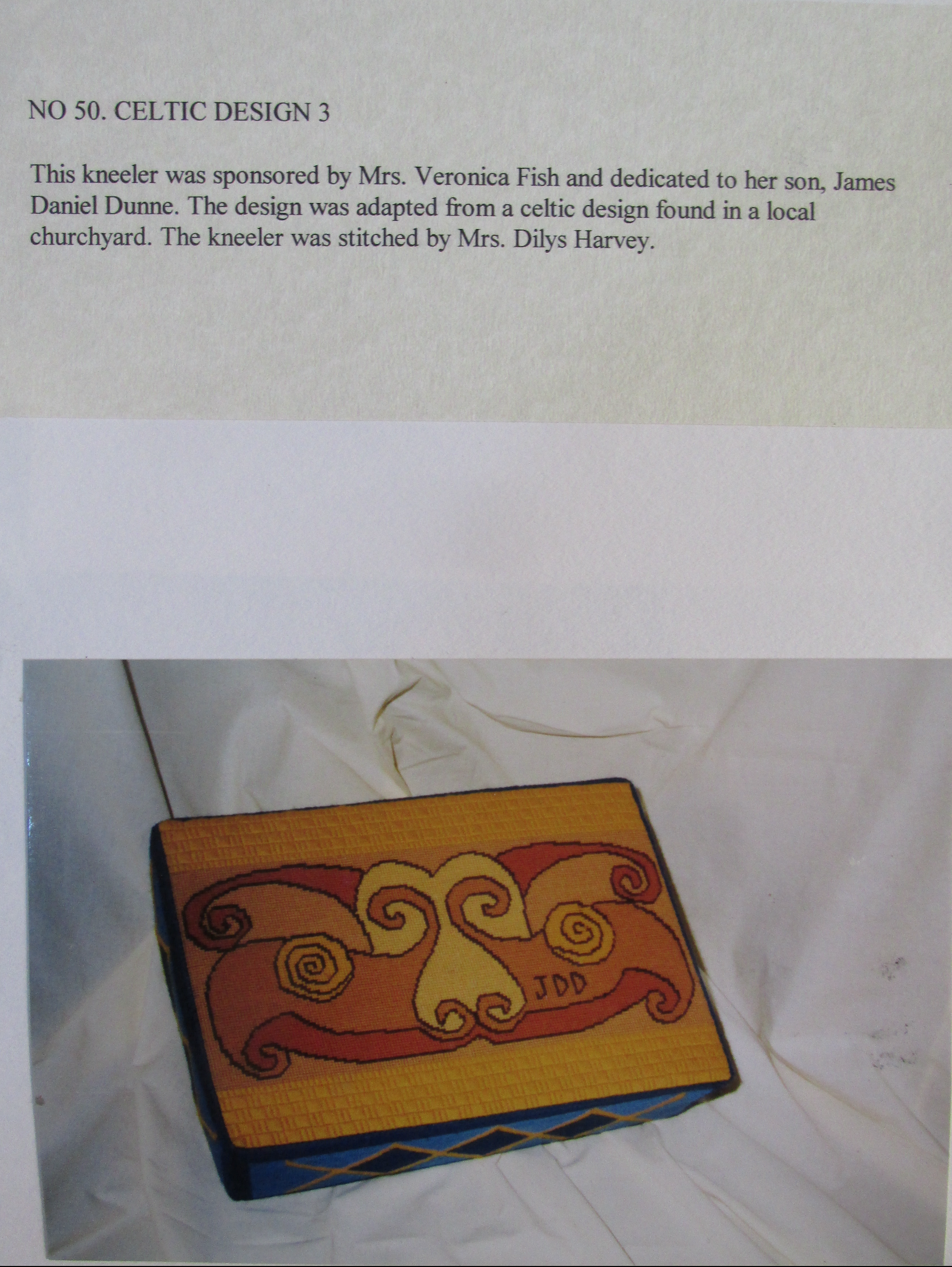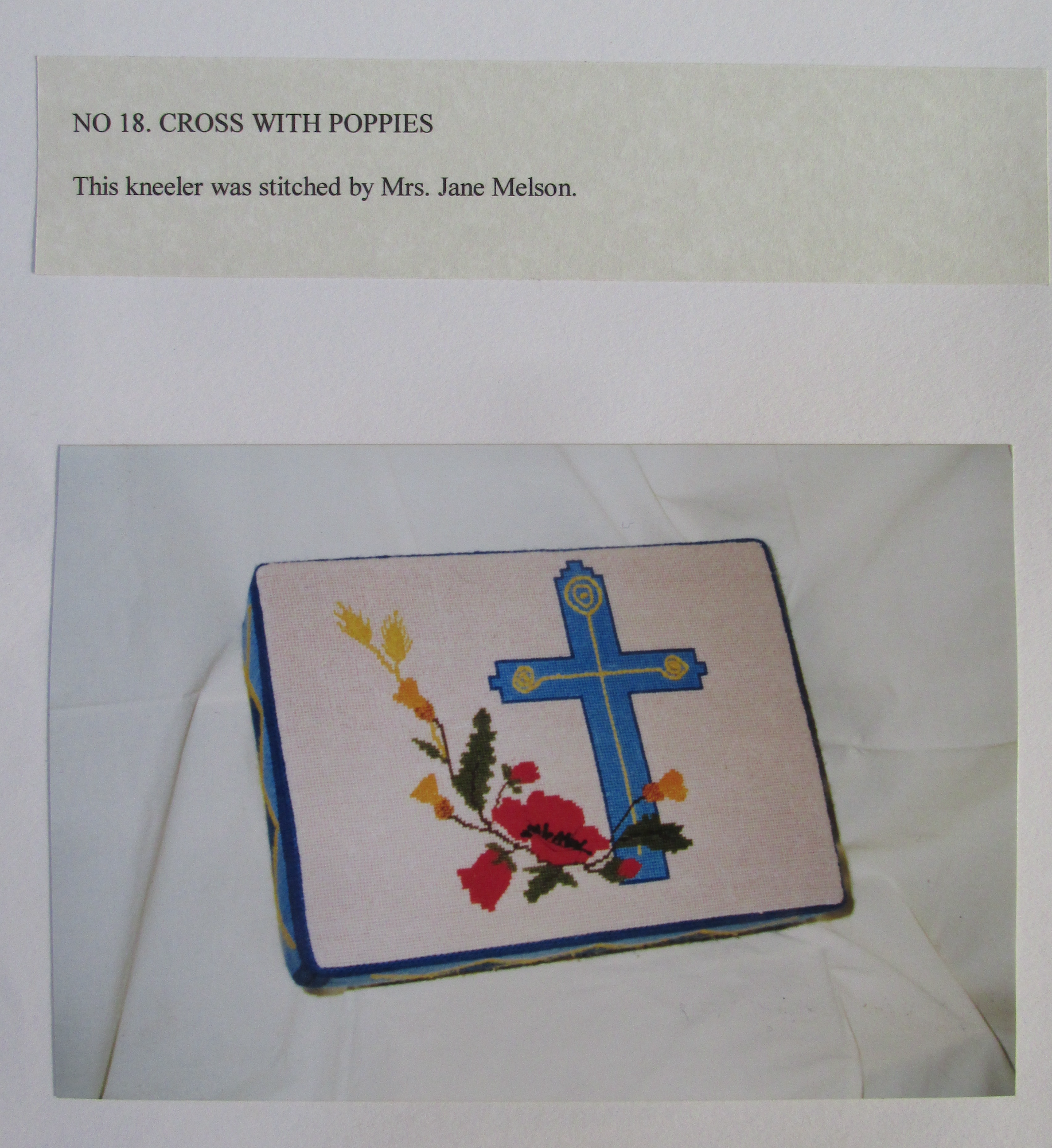 The colourful kneelers in the church as well as being strikingly impressive, hold a special place in the memories and hearts of those that took part in the project. There has long been a boxed book in the church with photographs and details of subject, stitcher and dedicatee. Because the "real thing" occupies the attention, this photographic record is frequently overlooked and so before the photos deteriorate those pages are now reproduced here to perhaps reach a wider audience?