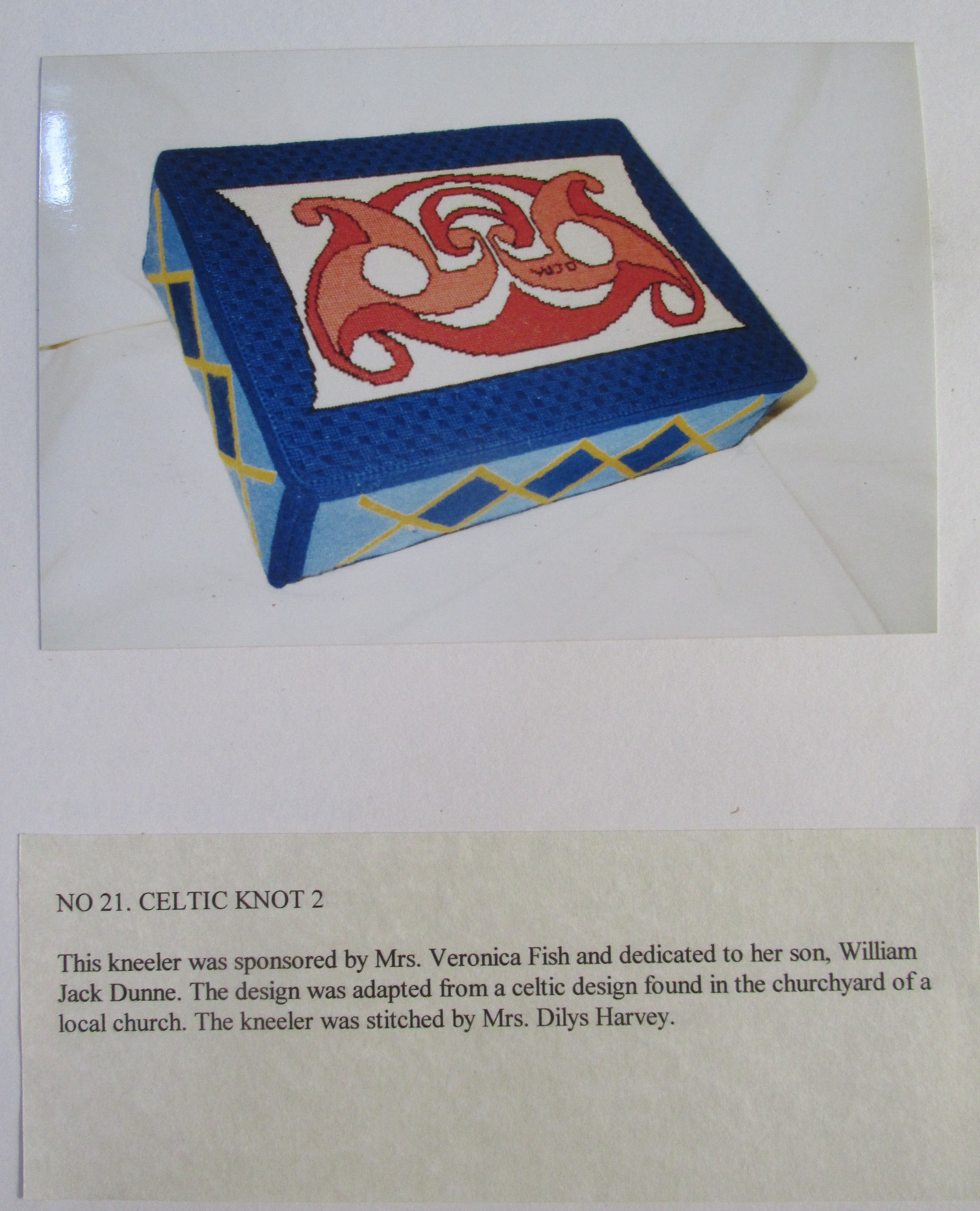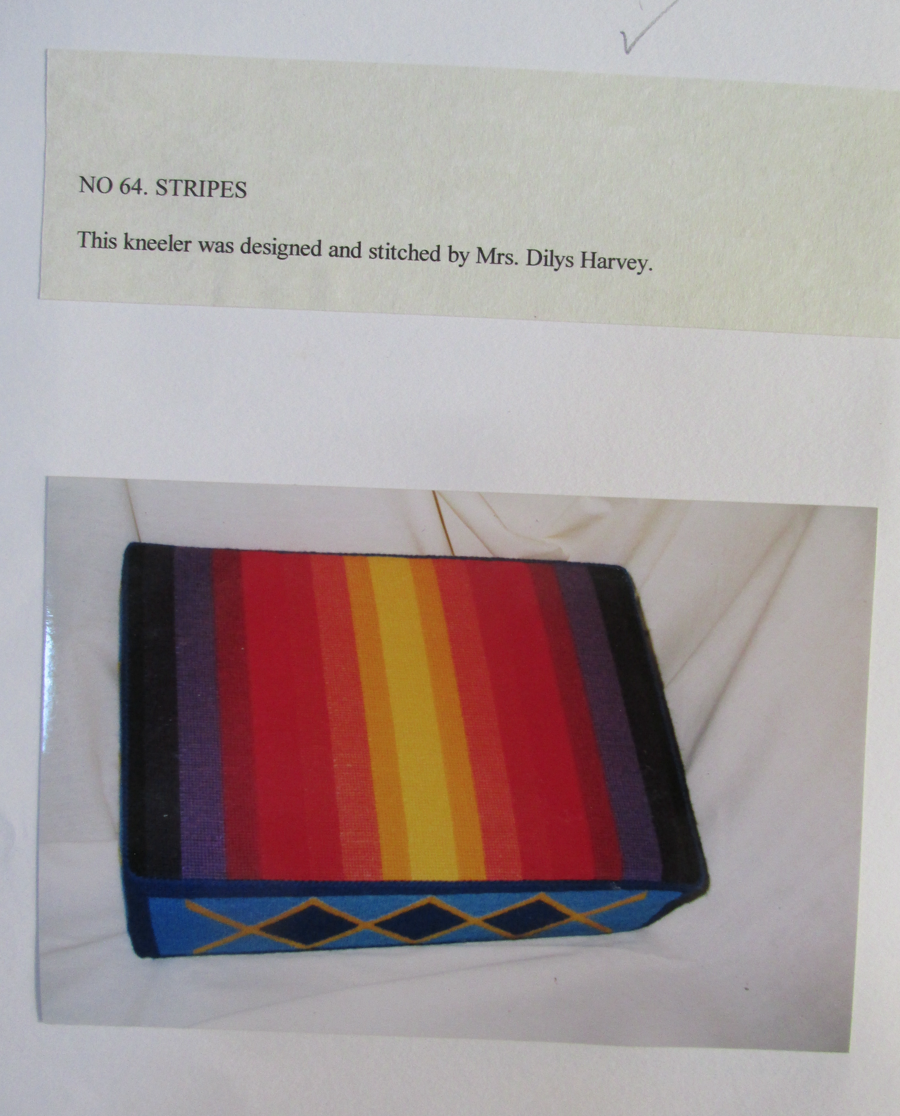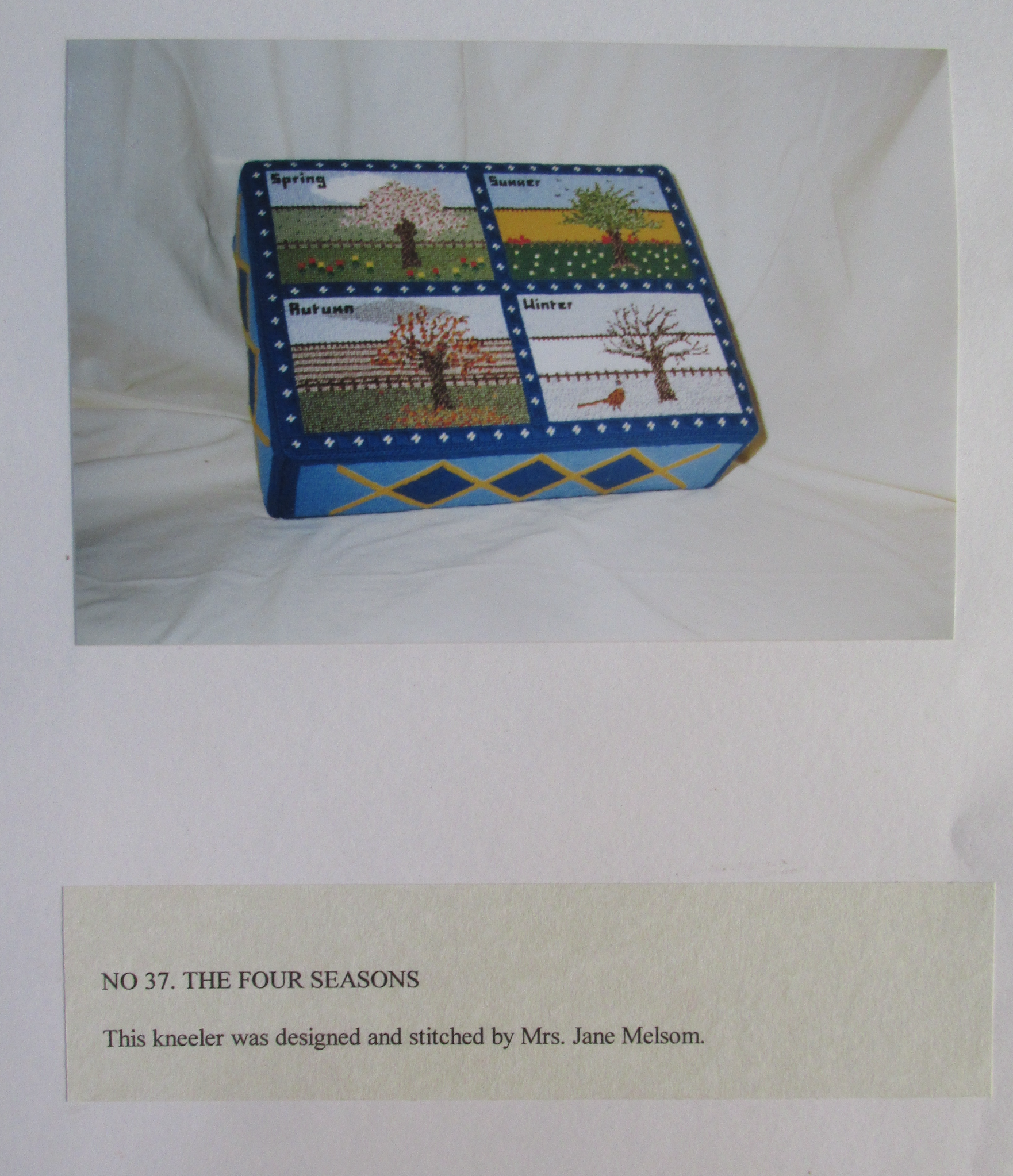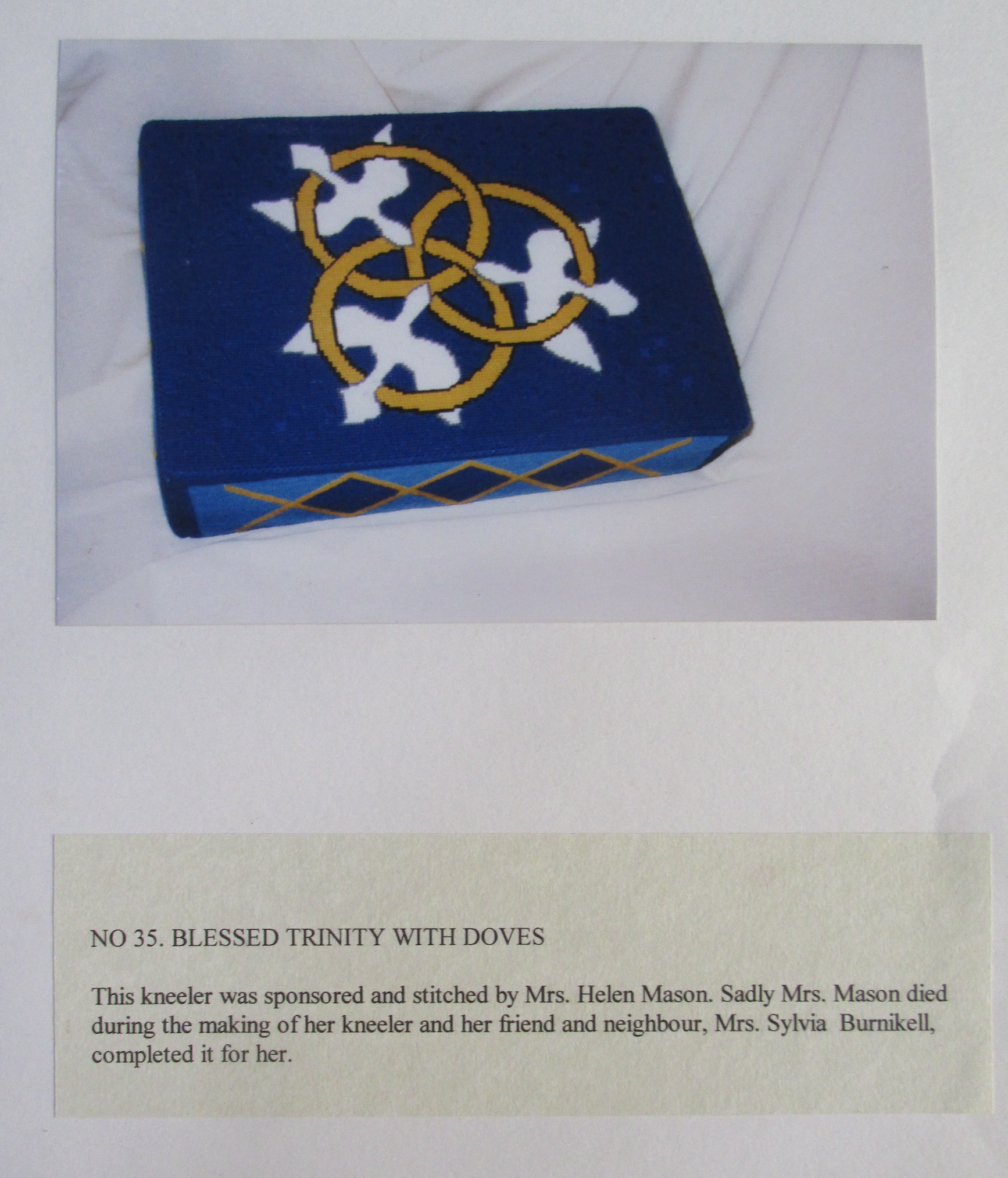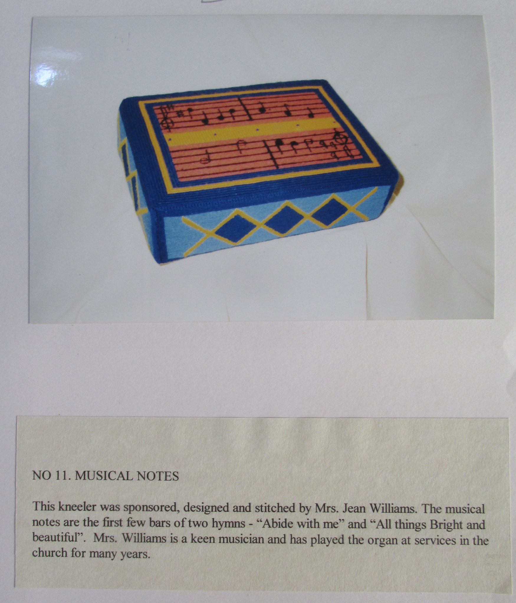 The colourful kneelers in the church as well as being strikingly impressive, hold a special place in the memories and hearts of those that took part in the project. There has long been a boxed book in the church with photographs and details of subject, stitcher and dedicatee. Because the "real thing" occupies the attention, this photographic record is frequently overlooked and so before the photos deteriorate those pages are now reproduced here to perhaps reach a wider audience?