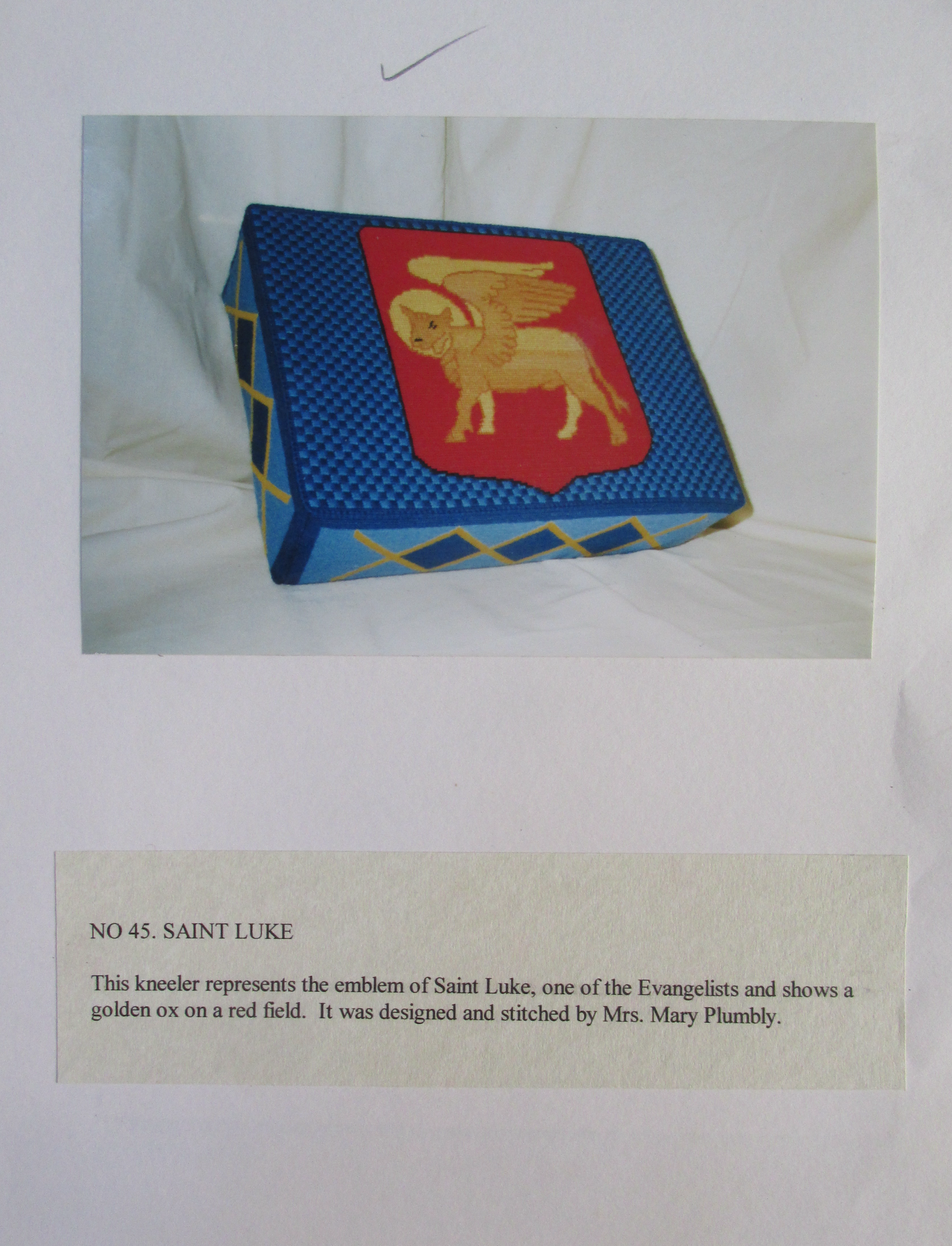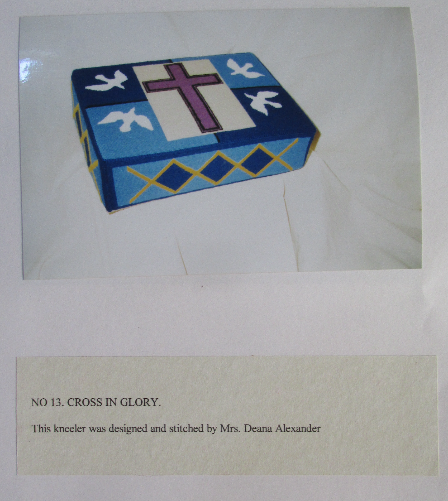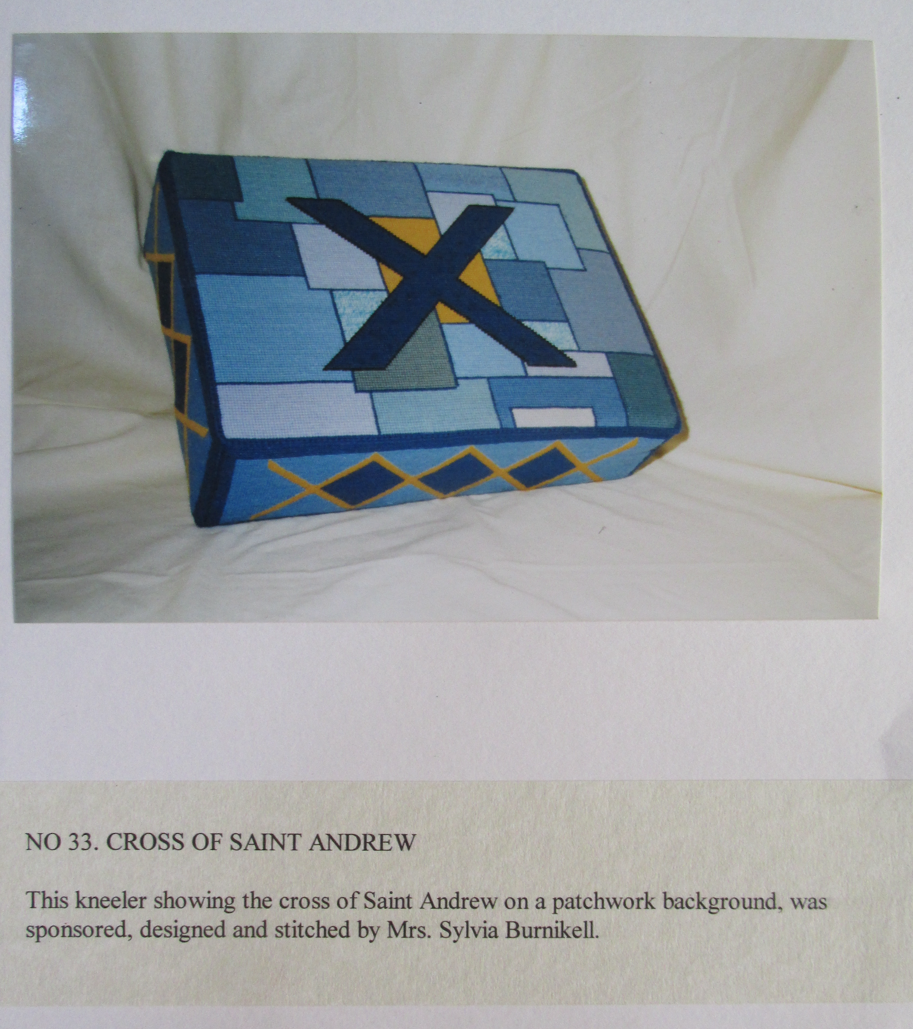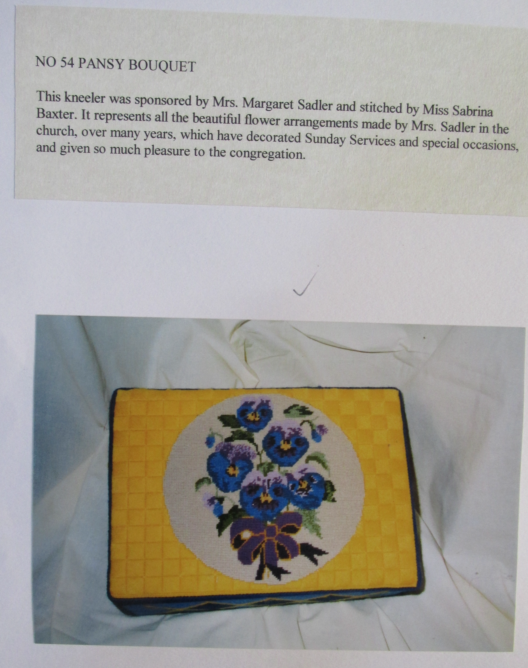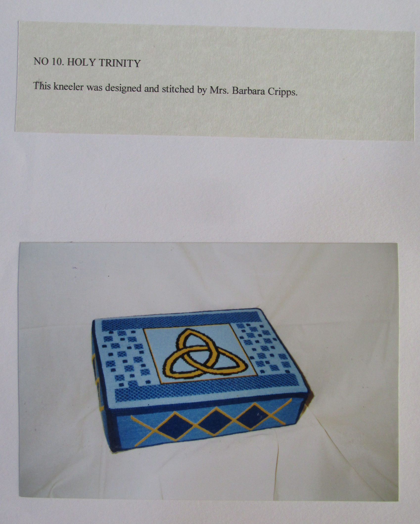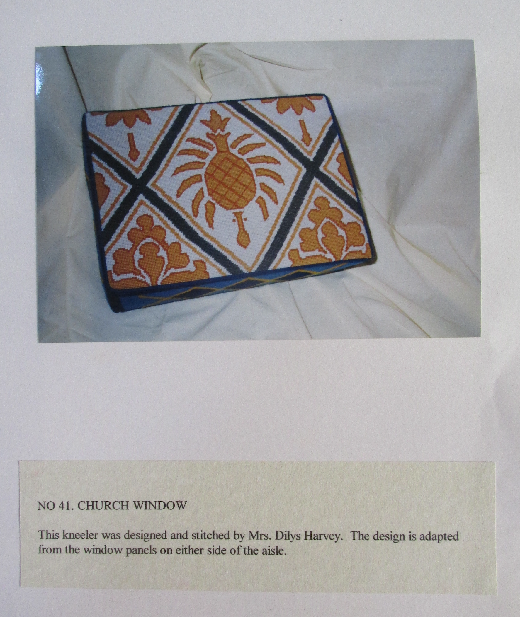 The colourful kneelers in the church as well as being strikingly impressive, hold a special place in the memories and hearts of those that took part in the project. There has long been a boxed book in the church with photographs and details of subject, stitcher and dedicatee. Because the "real thing" occupies the attention, this photographic record is frequently overlooked and so before the photos deteriorate those pages are now reproduced here to perhaps reach a wider audience?