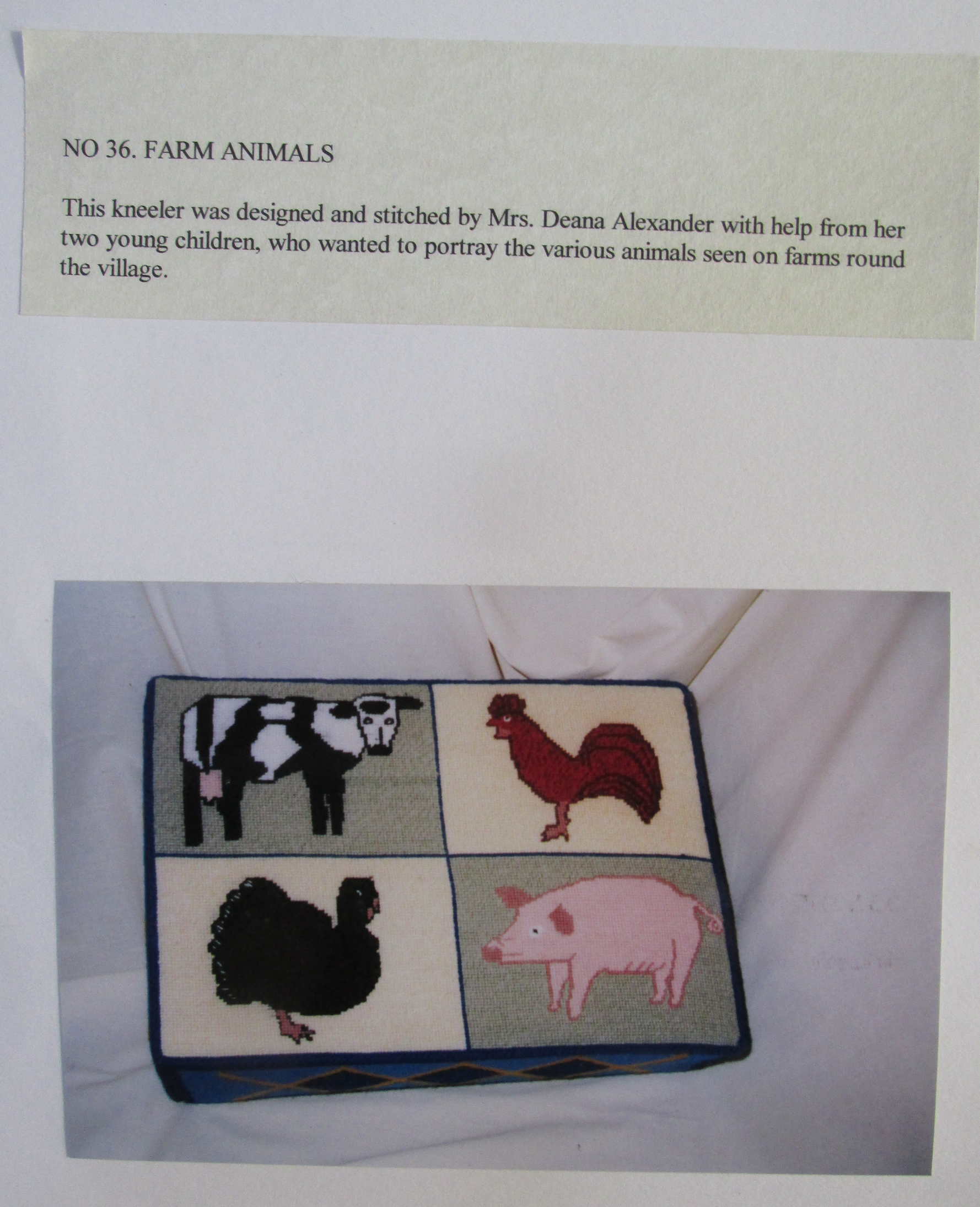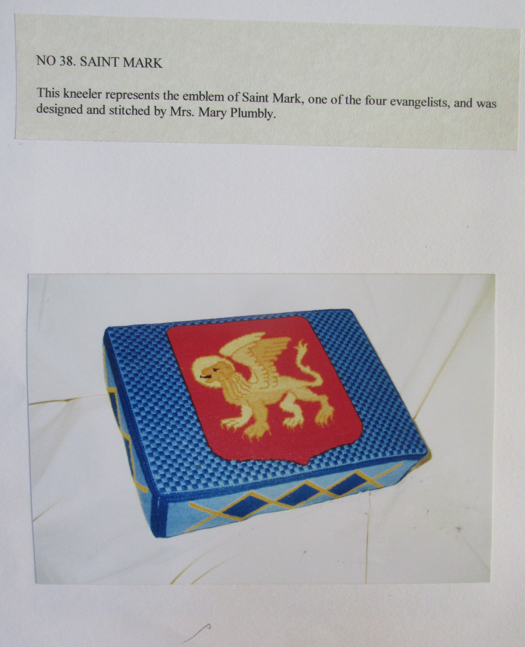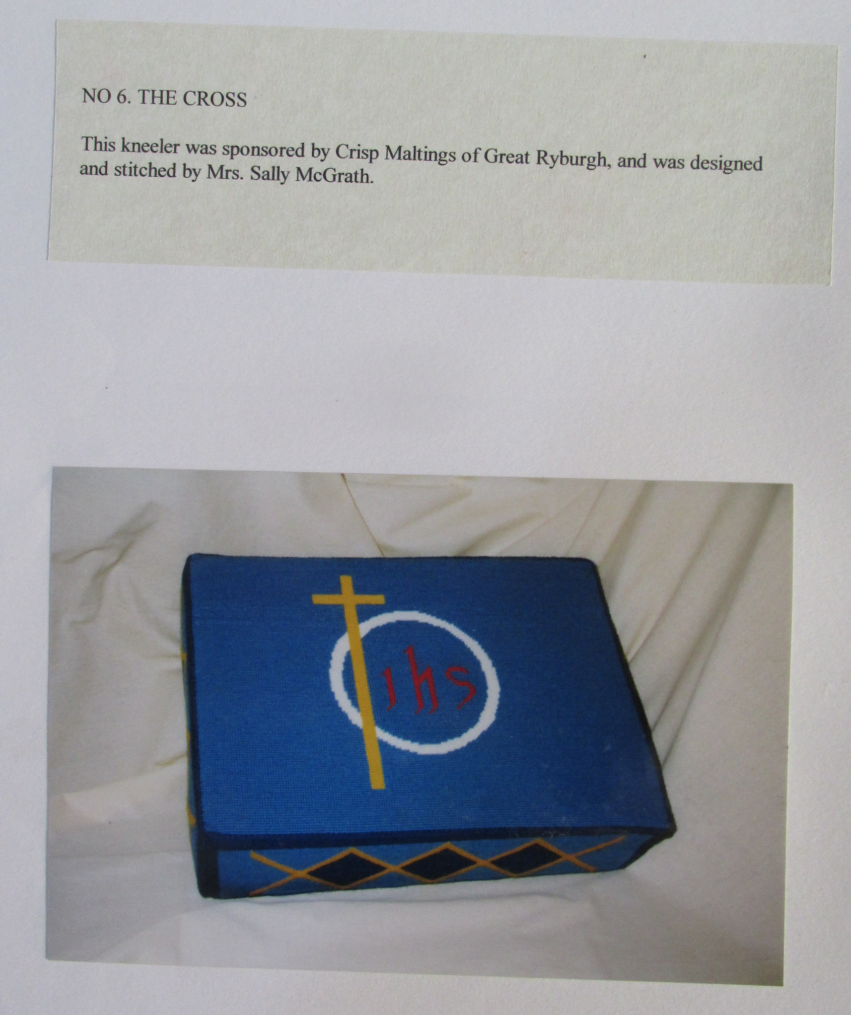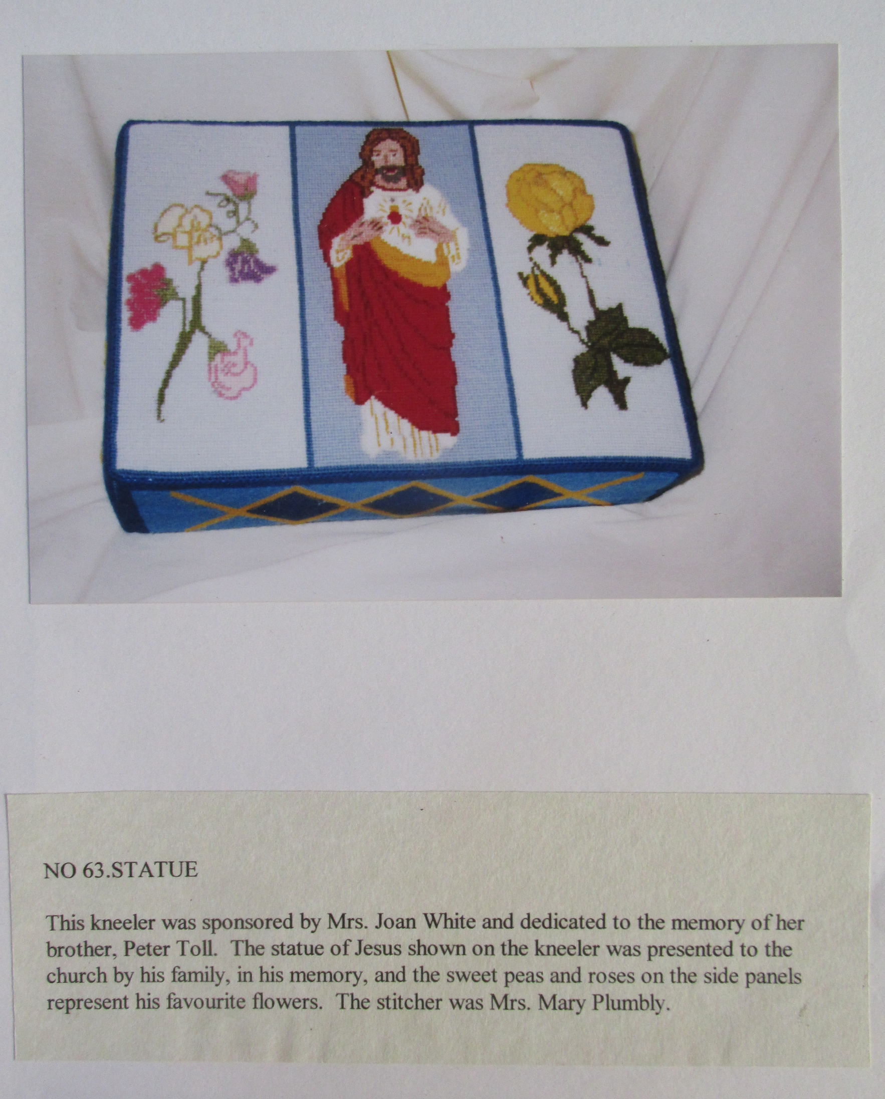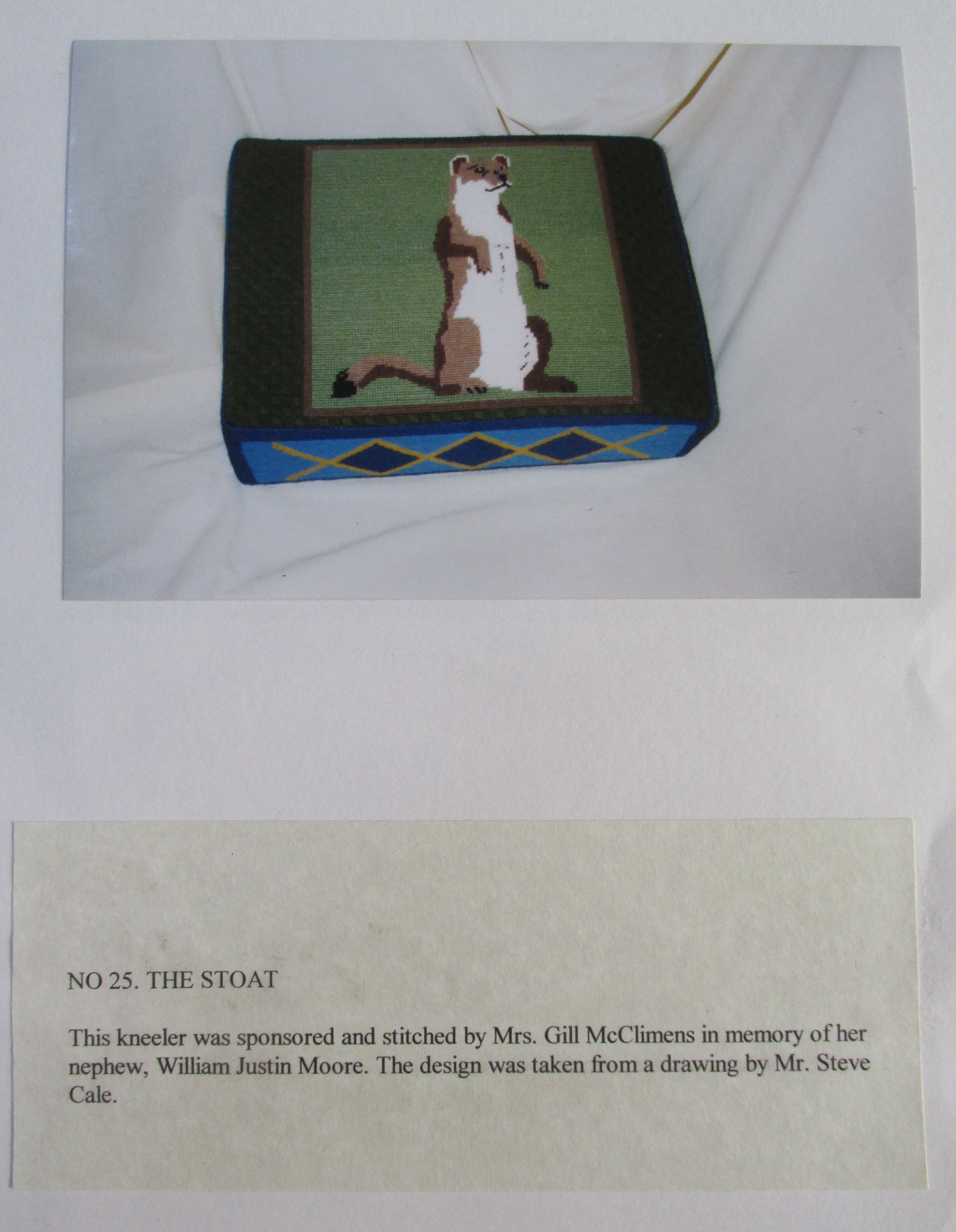 The colourful kneelers in the church as well as being strikingly impressive, hold a special place in the memories and hearts of those that took part in the project. There has long been a boxed book in the church with photographs and details of subject, stitcher and dedicatee. Because the "real thing" occupies the attention, this photographic record is frequently overlooked and so before the photos deteriorate those pages are now reproduced here to perhaps reach a wider audience?