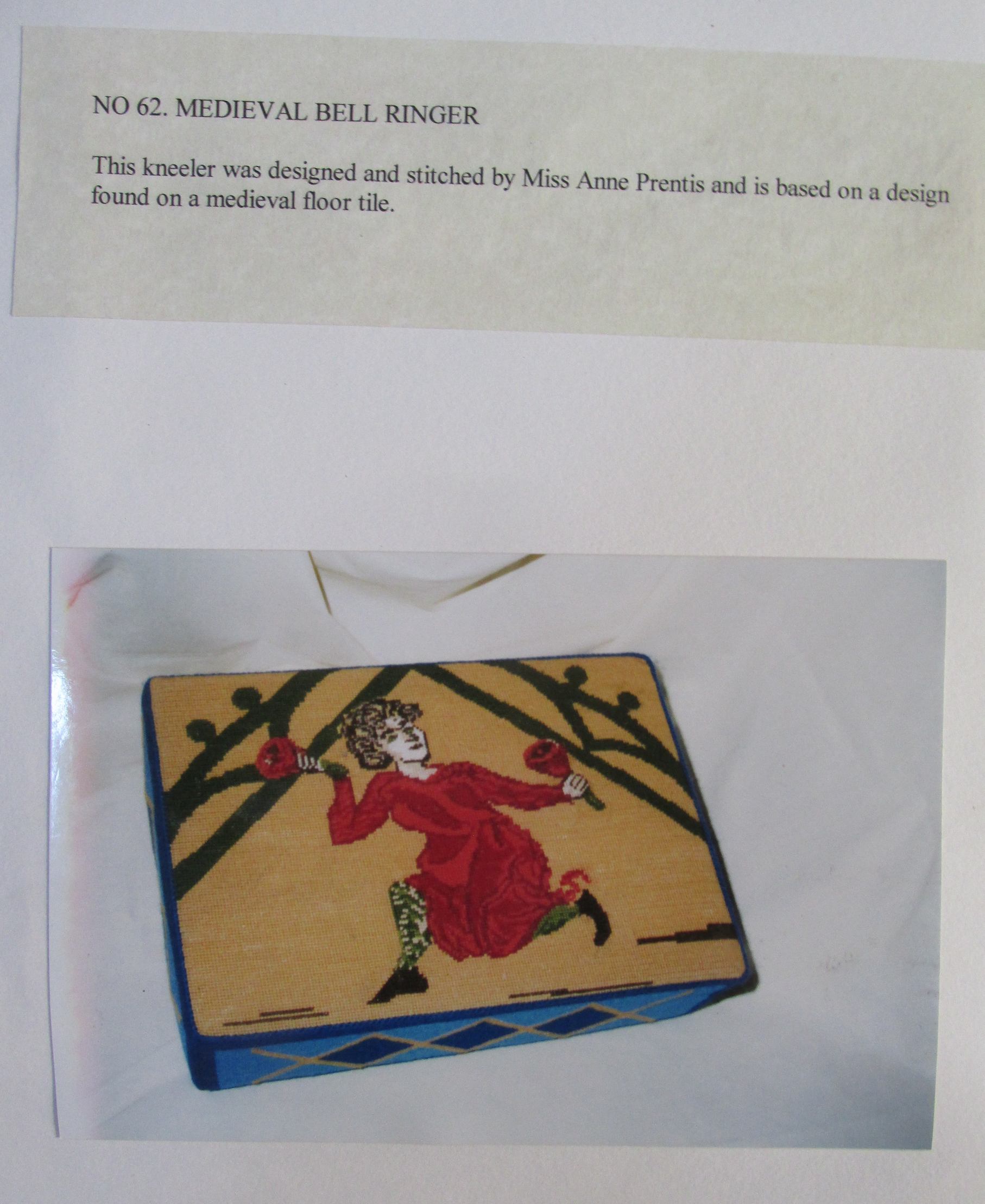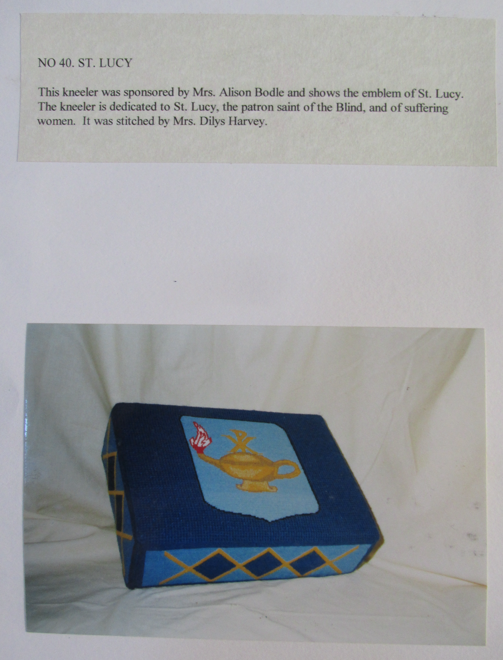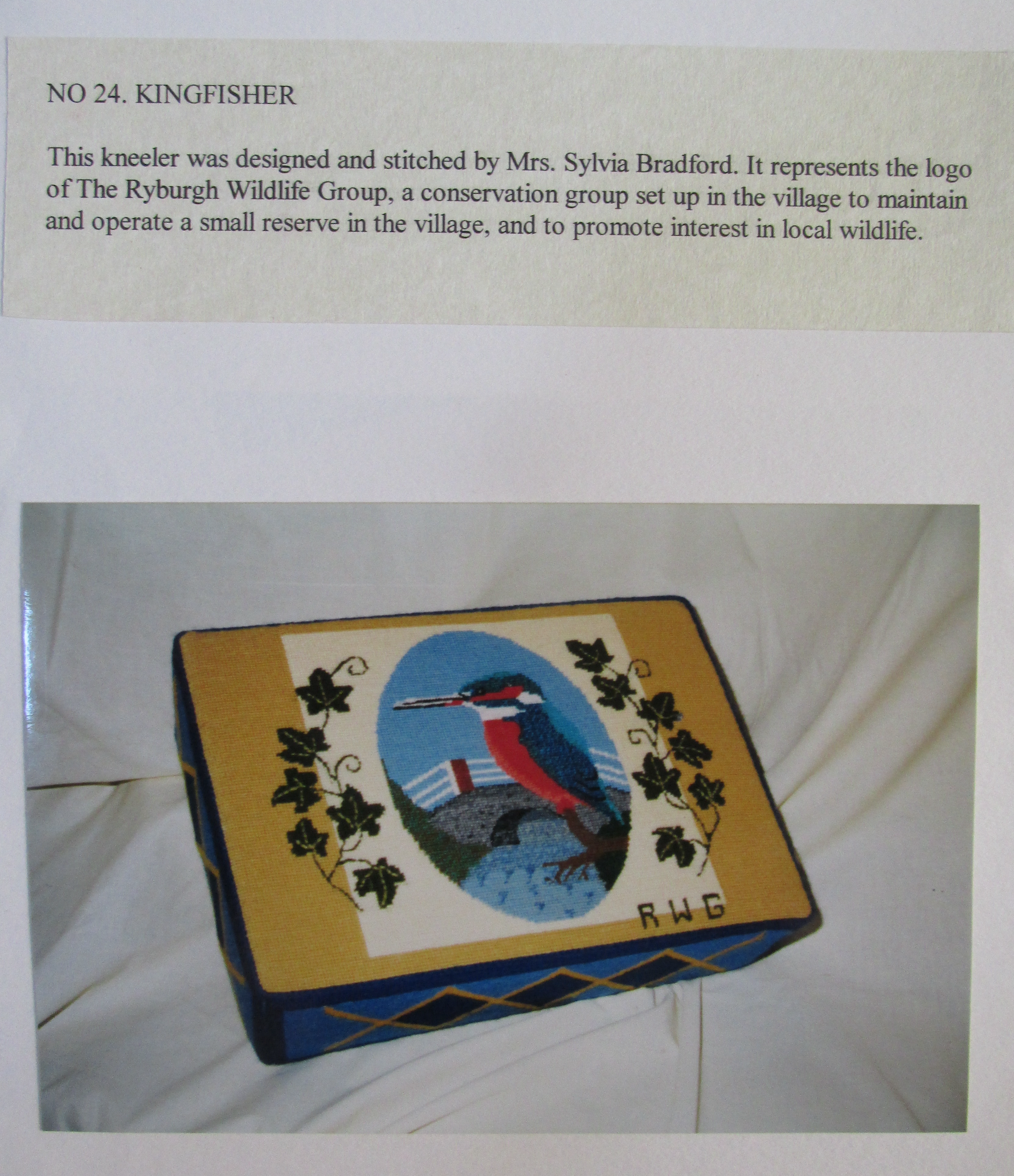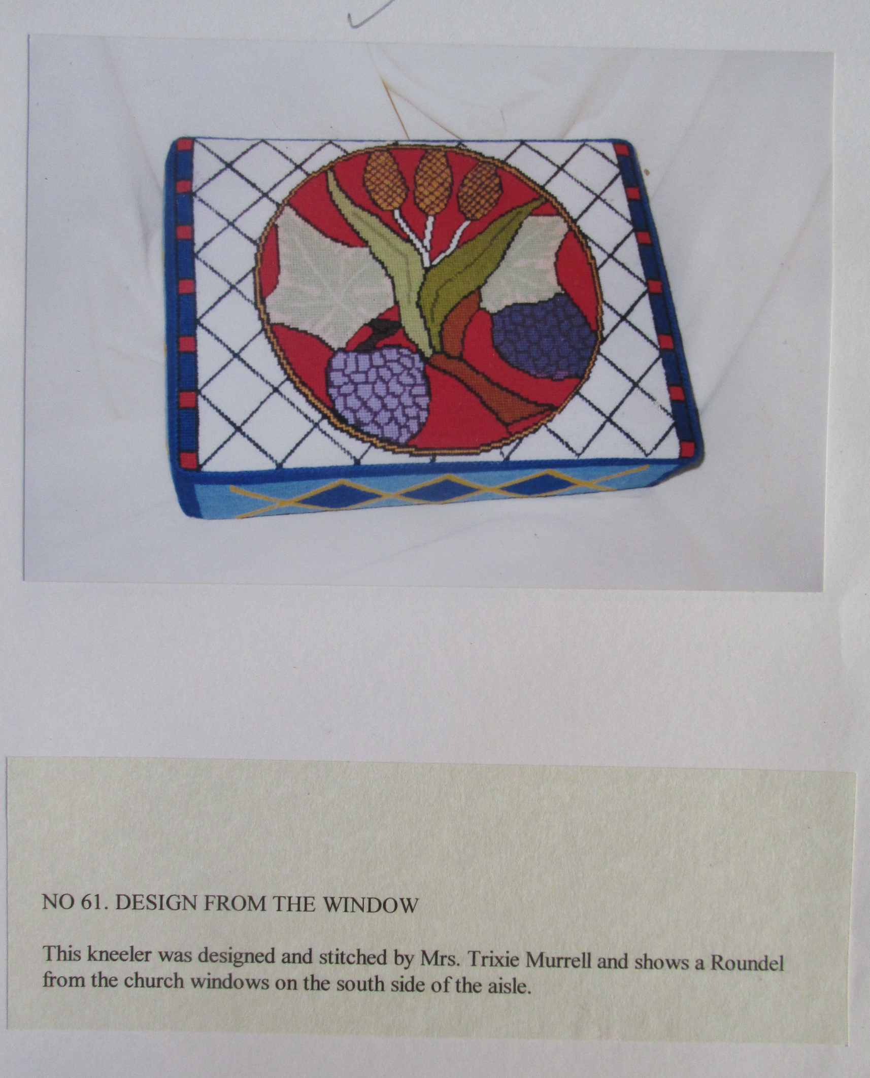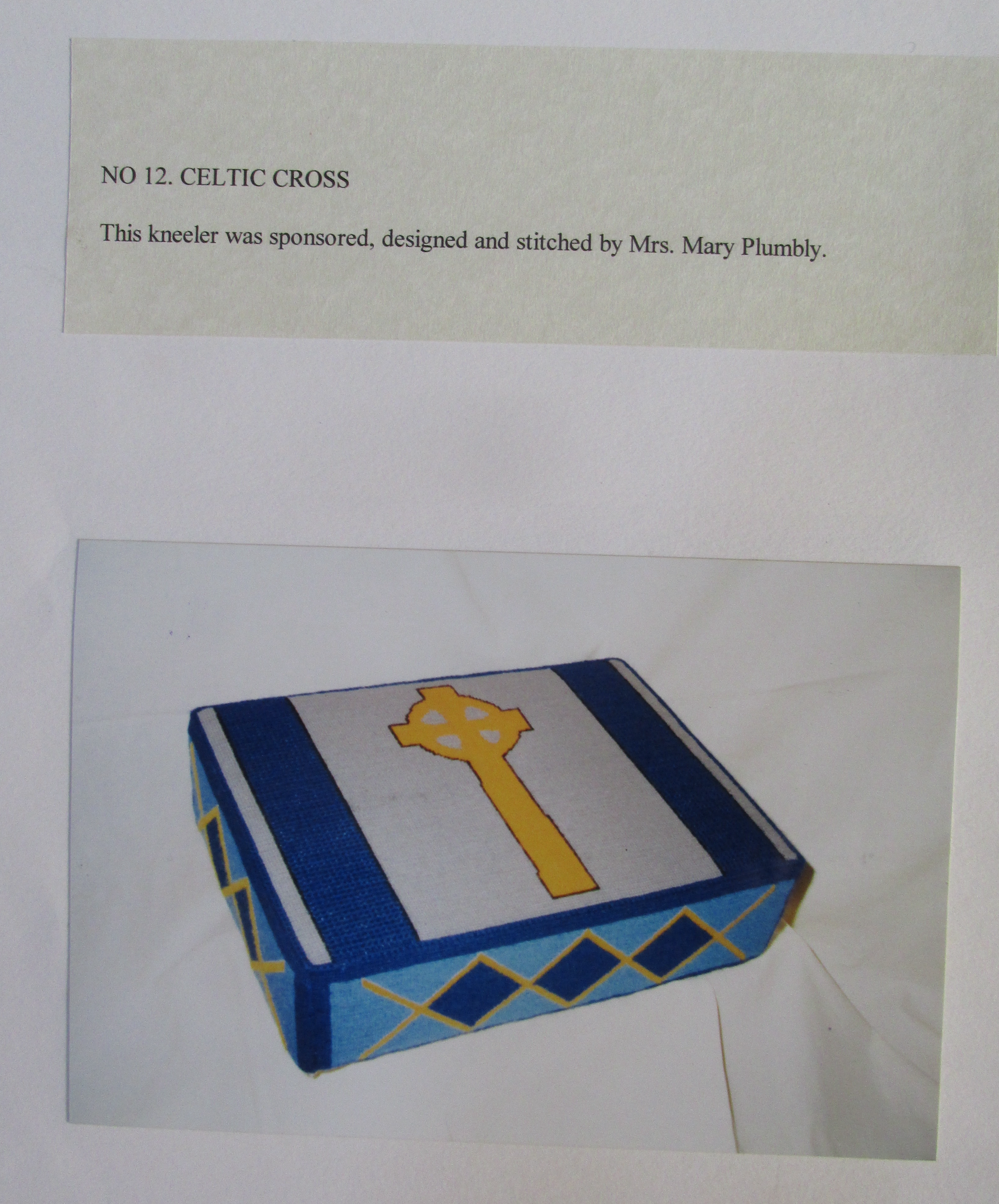 The colourful kneelers in the church as well as being strikingly impressive, hold a special place in the memories and hearts of those that took part in the project. There has long been a boxed book in the church with photographs and details of subject, stitcher and dedicatee. Because the "real thing" occupies the attention, this photographic record is frequently overlooked and so before the photos deteriorate those pages are now reproduced here to perhaps reach a wider audience?