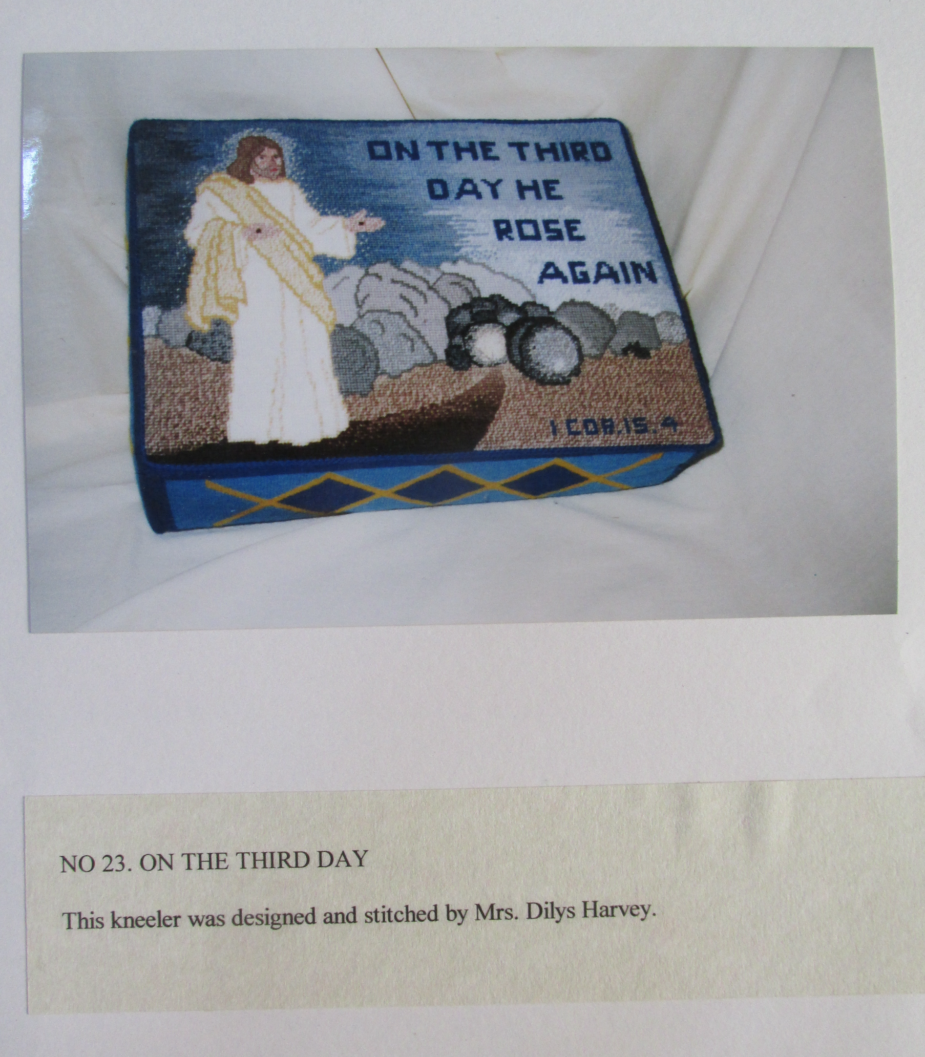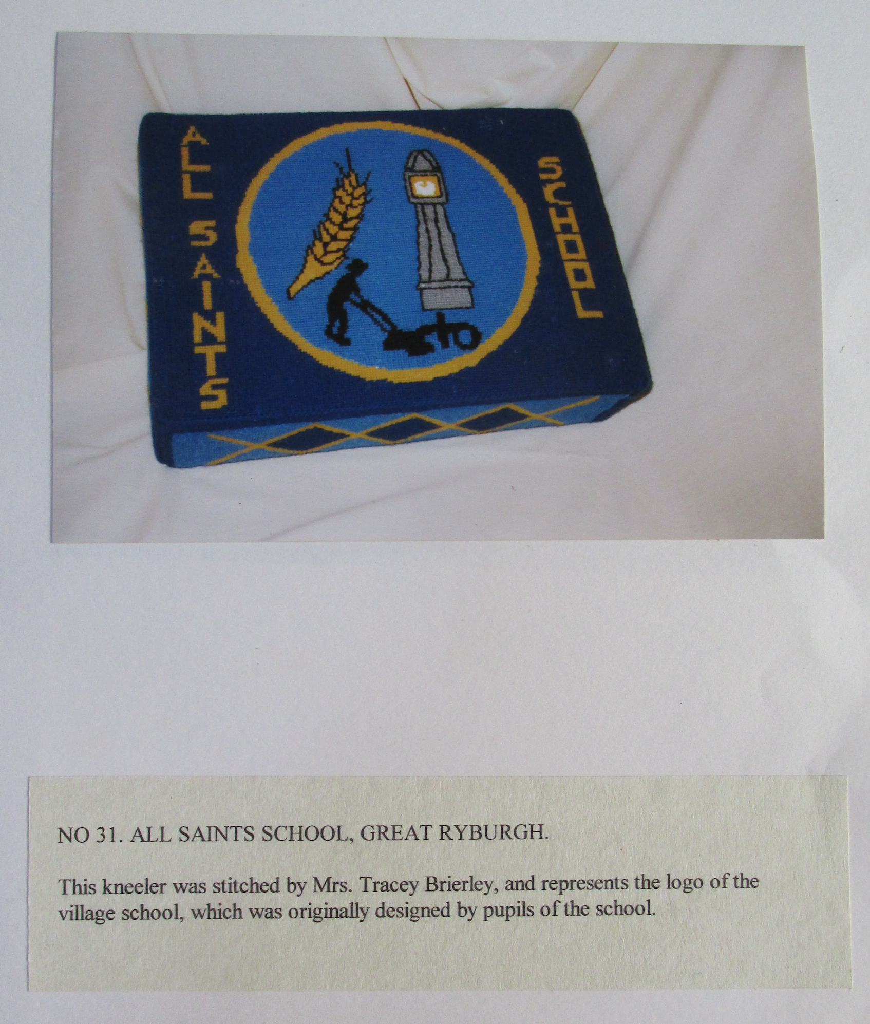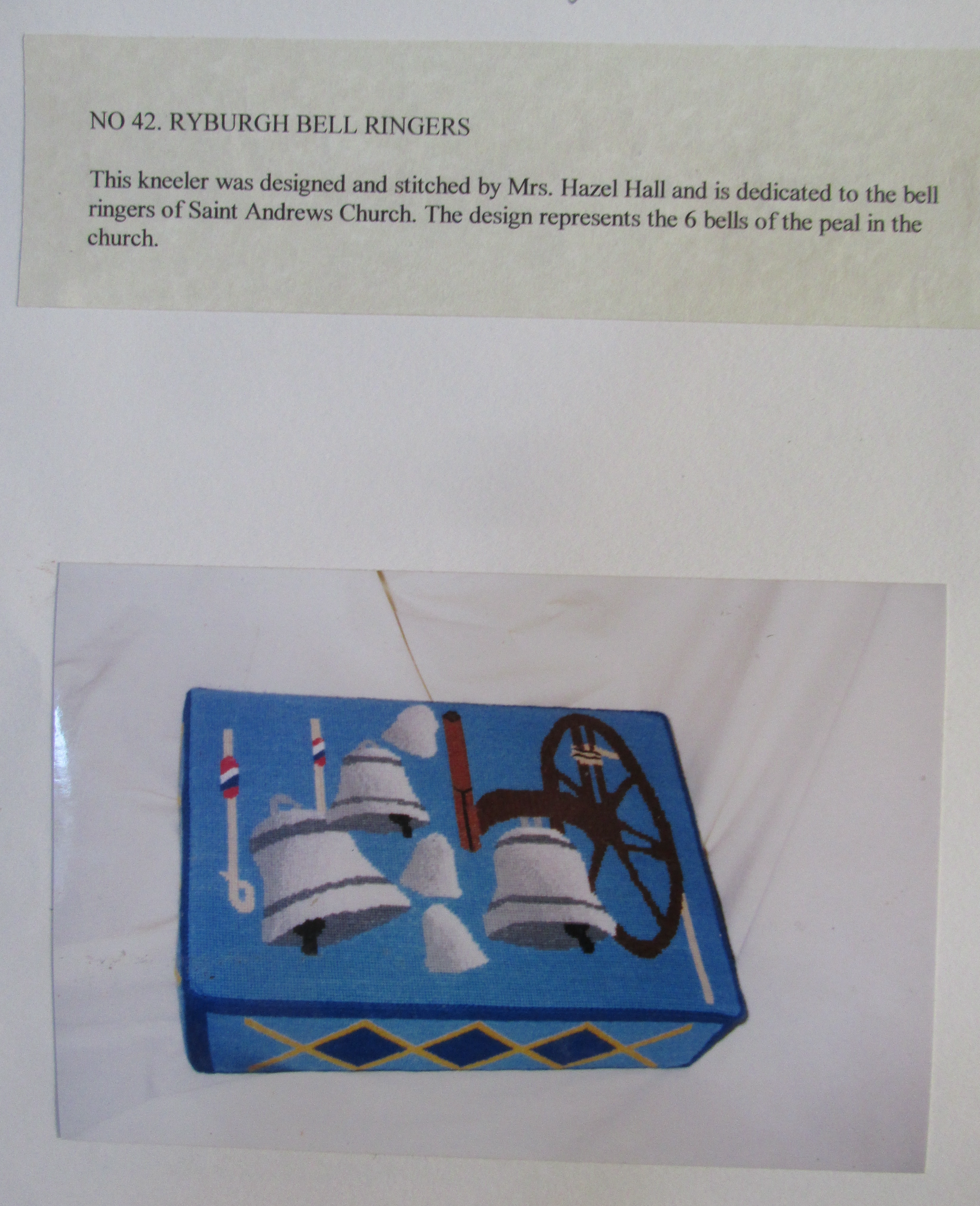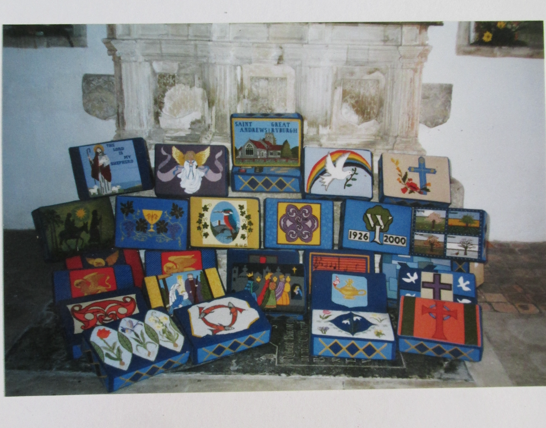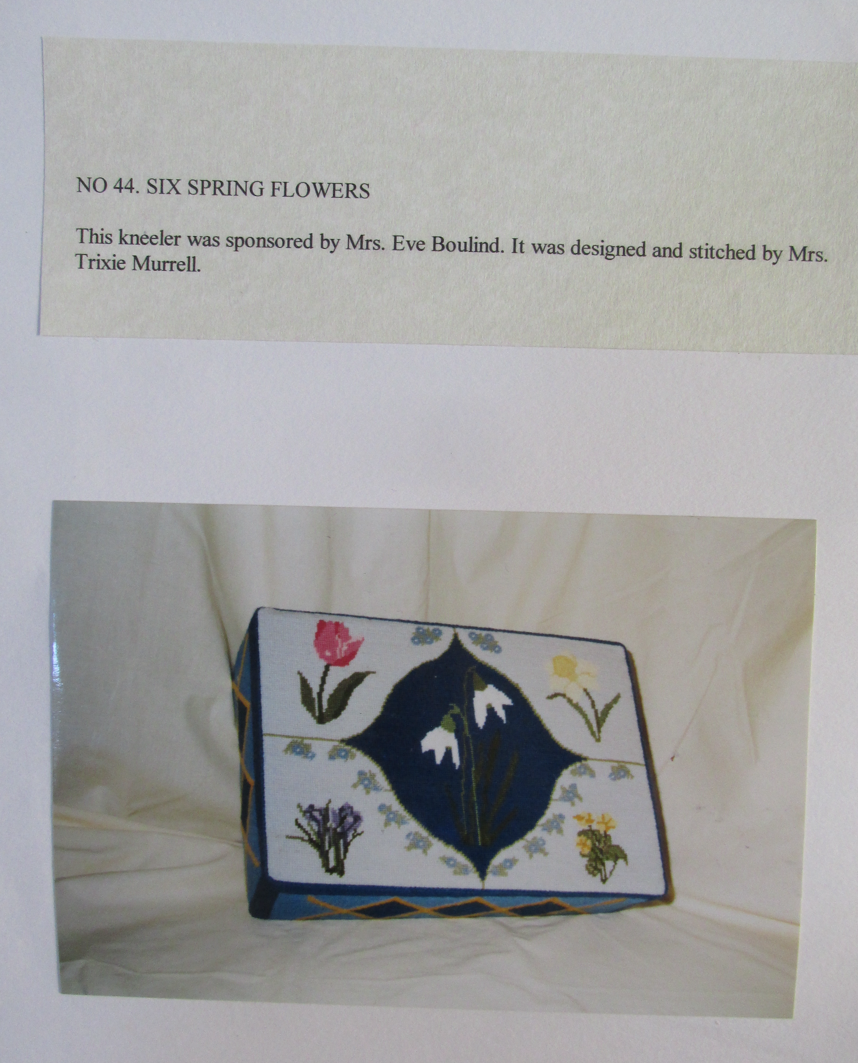 The colourful kneelers in the church as well as being strikingly impressive, hold a special place in the memories and hearts of those that took part in the project. There has long been a boxed book in the church with photographs and details of subject, stitcher and dedicatee. Because the "real thing" occupies the attention, this photographic record is frequently overlooked and so before the photos deteriorate those pages are now reproduced here to perhaps reach a wider audience?