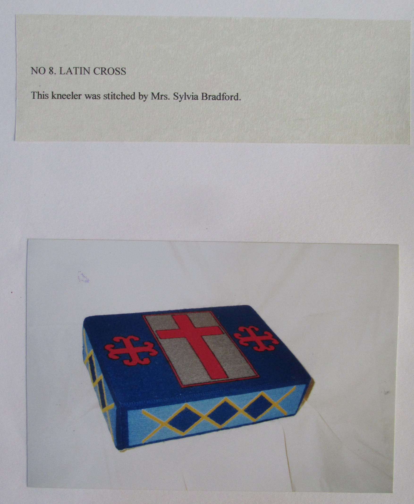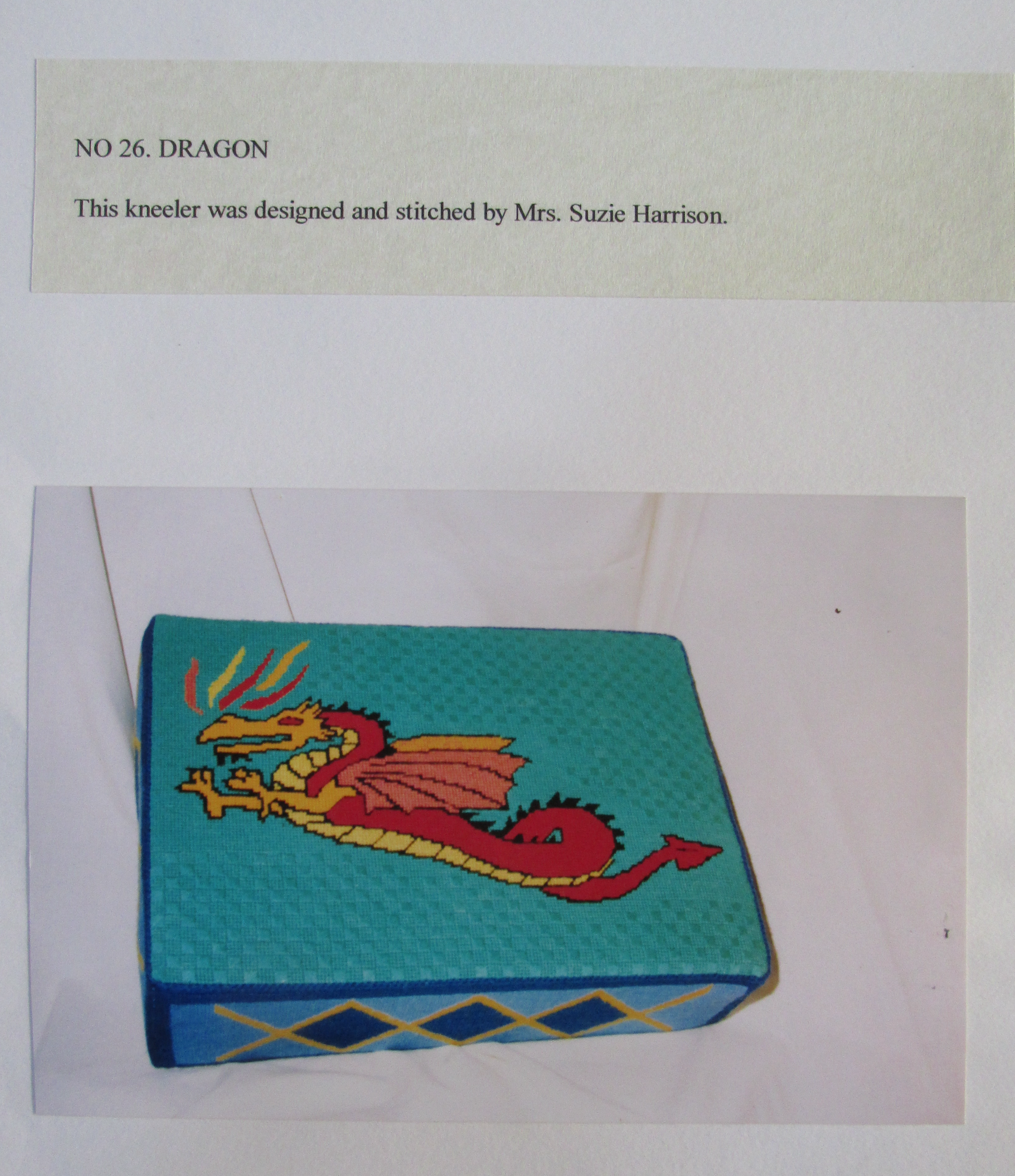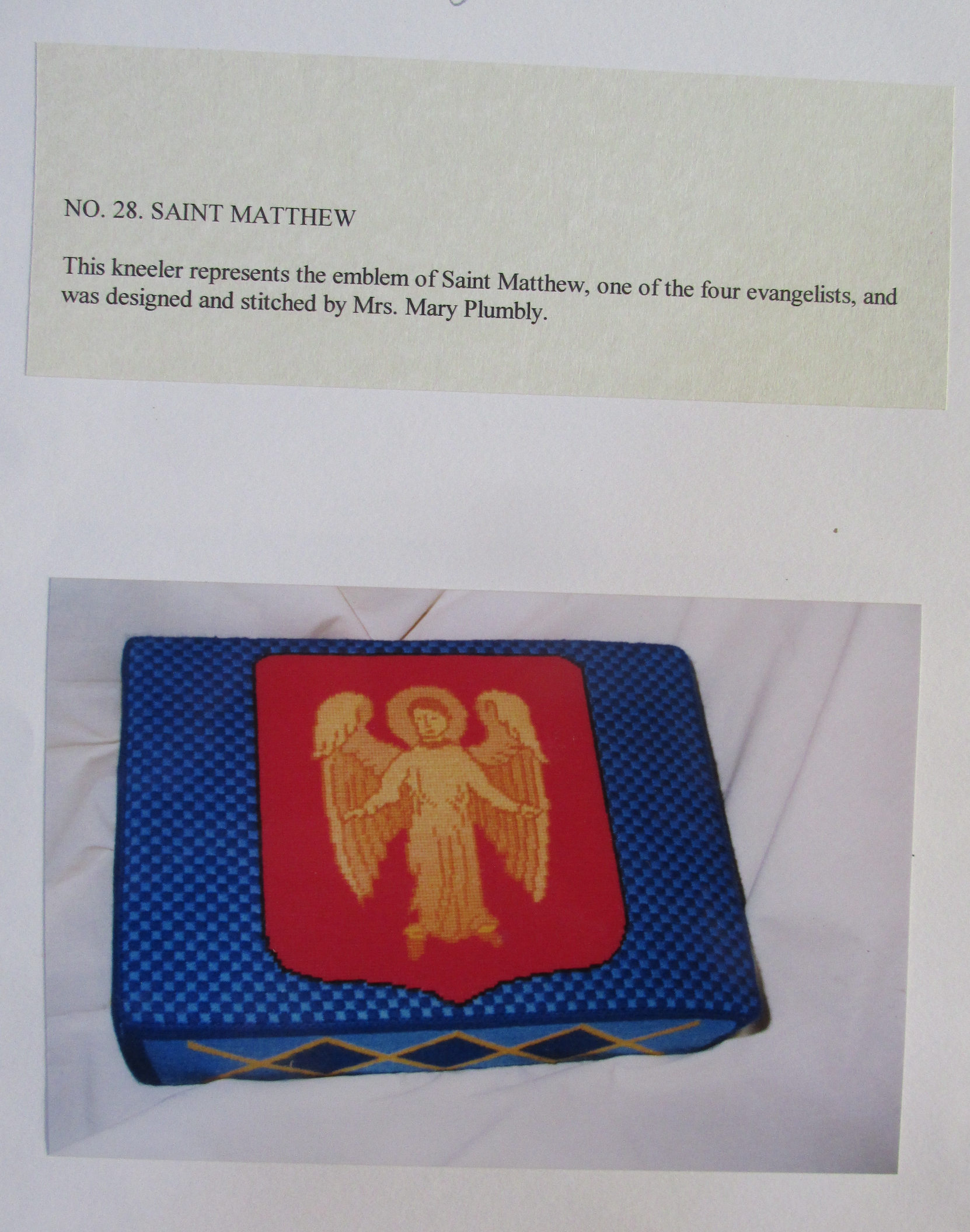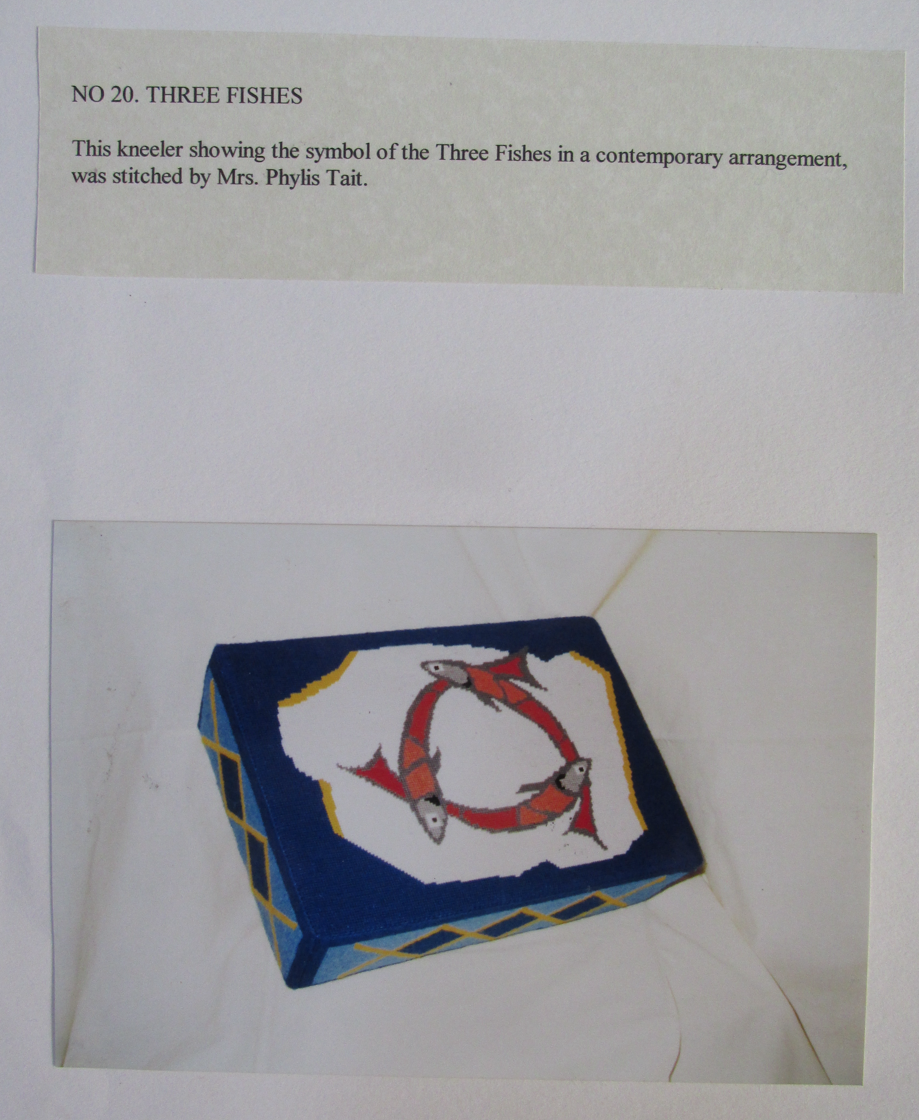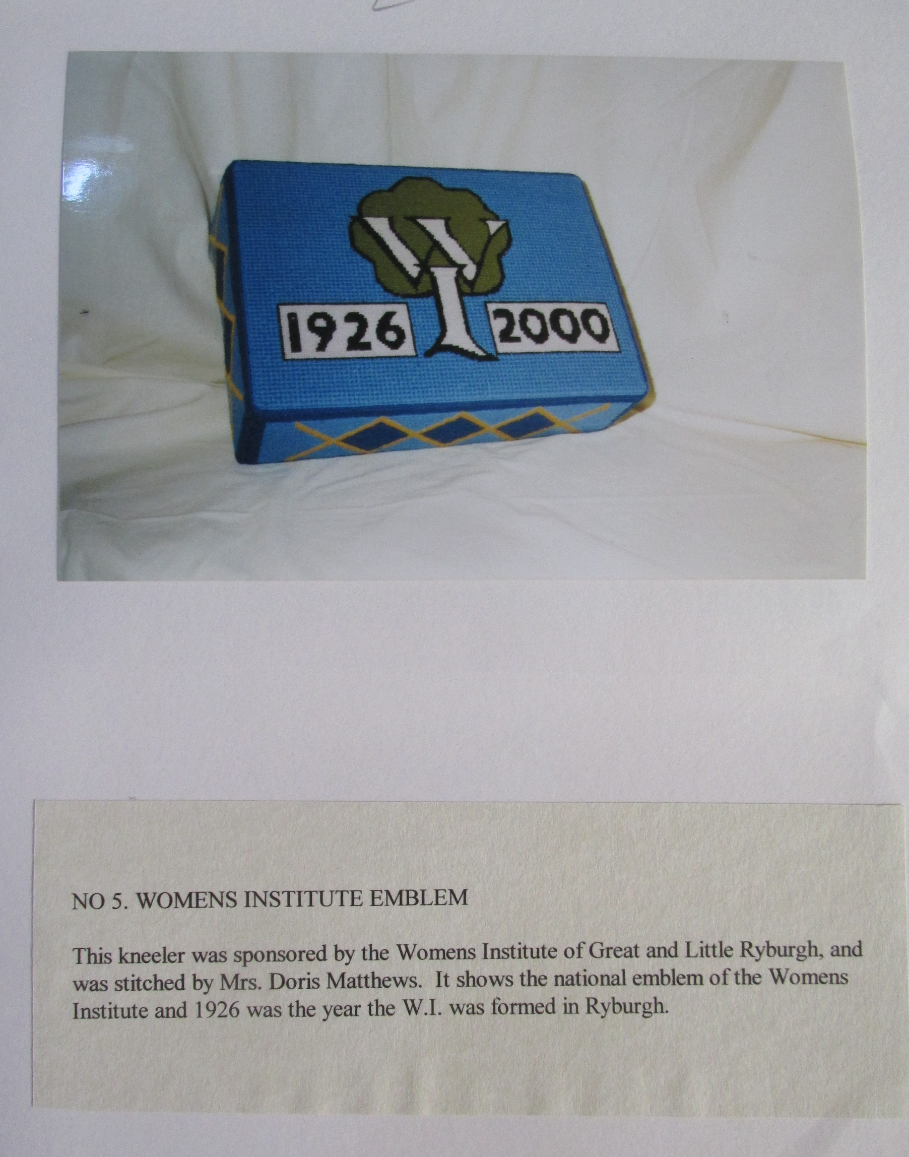 The colourful kneelers in the church as well as being strikingly impressive, hold a special place in the memories and hearts of those that took part in the project. There has long been a boxed book in the church with photographs and details of subject, stitcher and dedicatee. Because the "real thing" occupies the attention, this photographic record is frequently overlooked and so before the photos deteriorate those pages are now reproduced here to perhaps reach a wider audience?