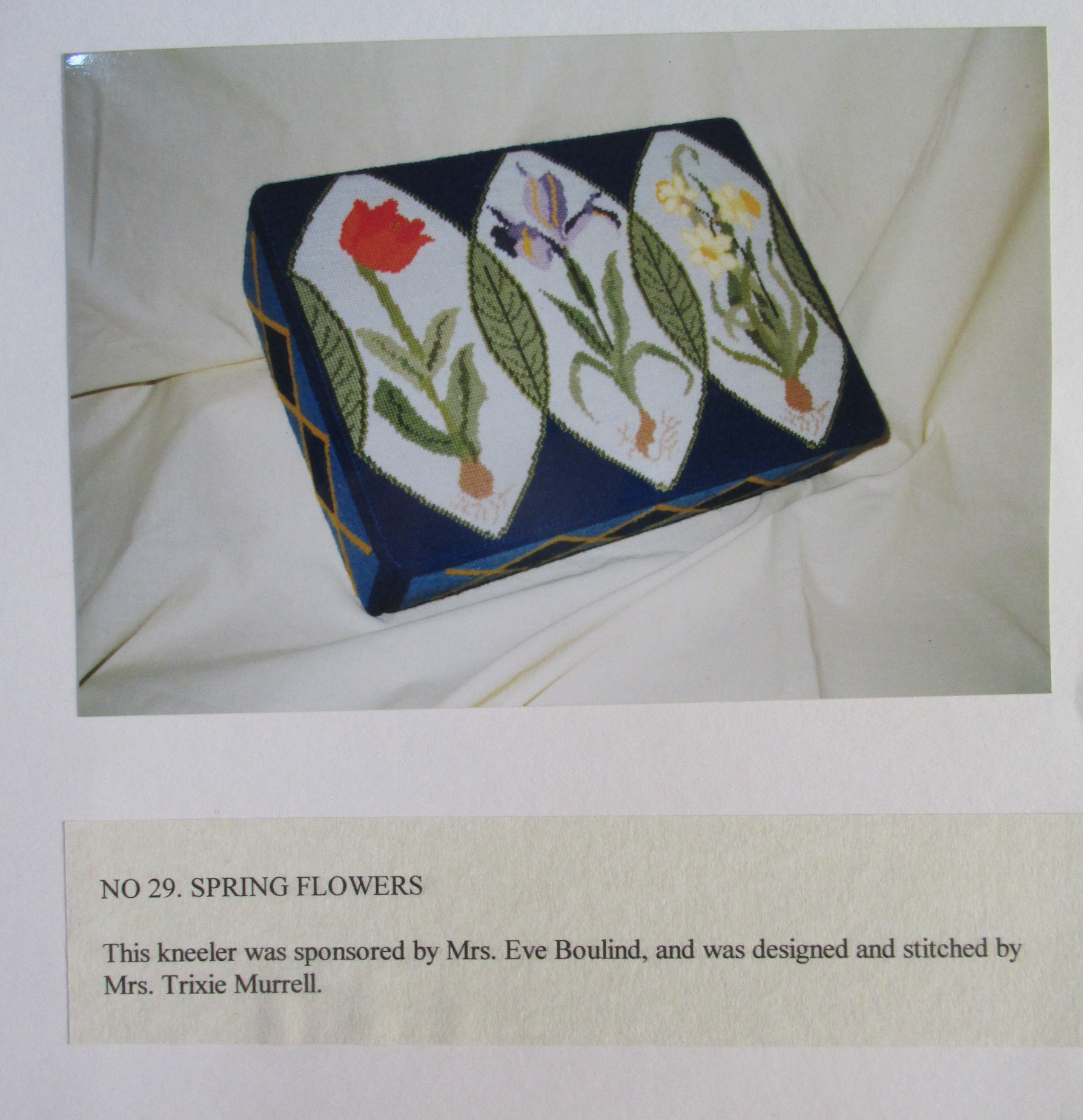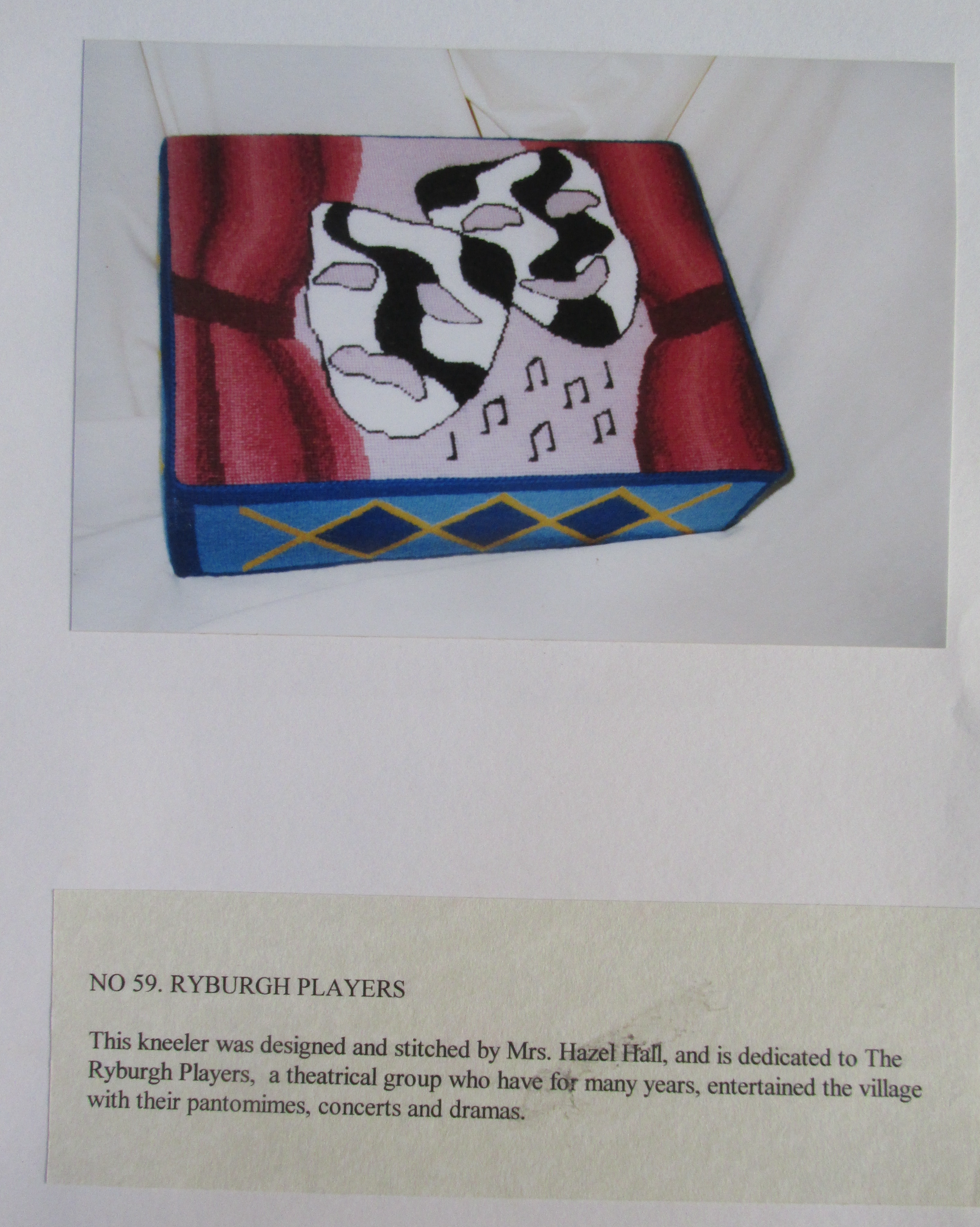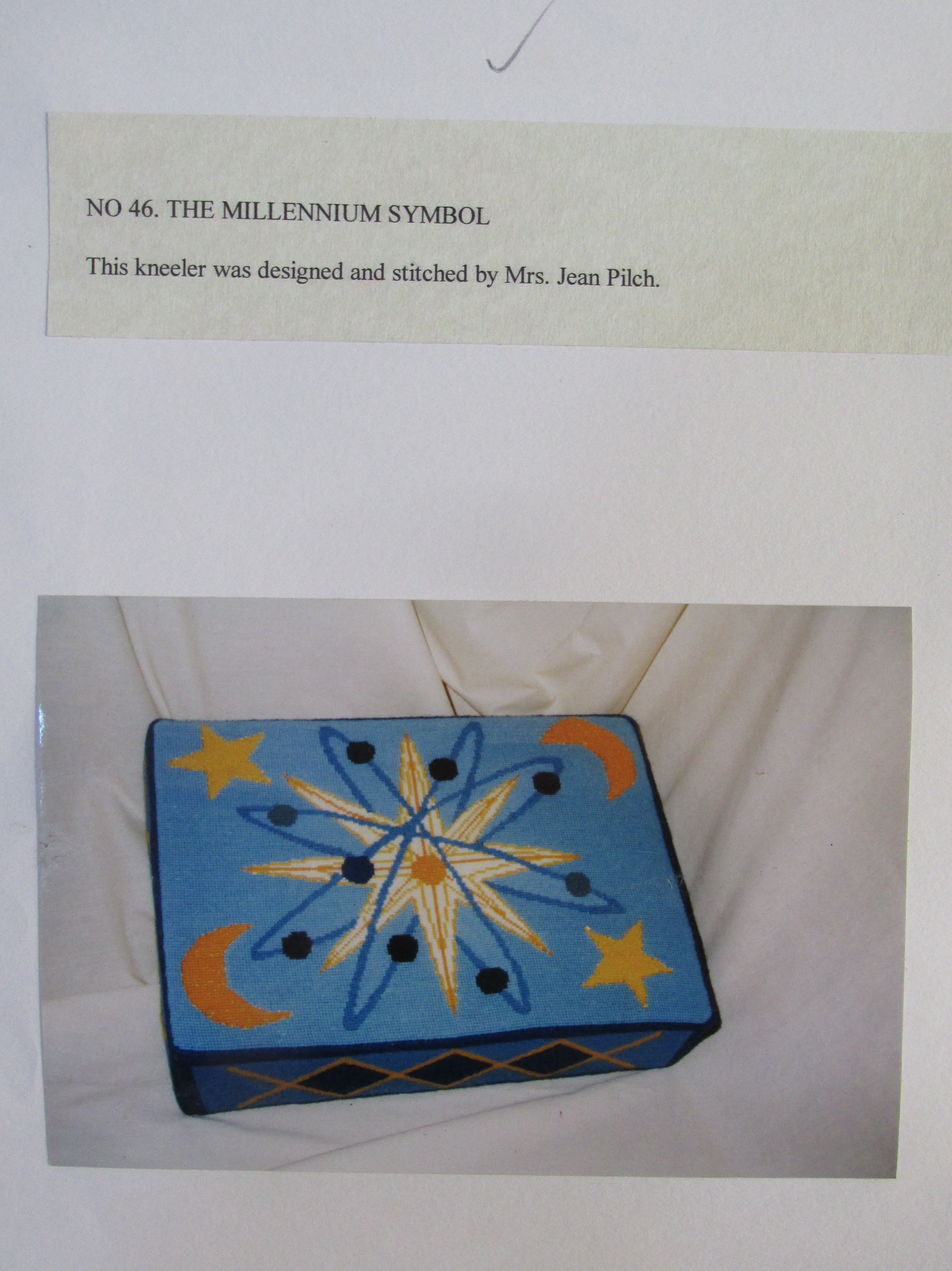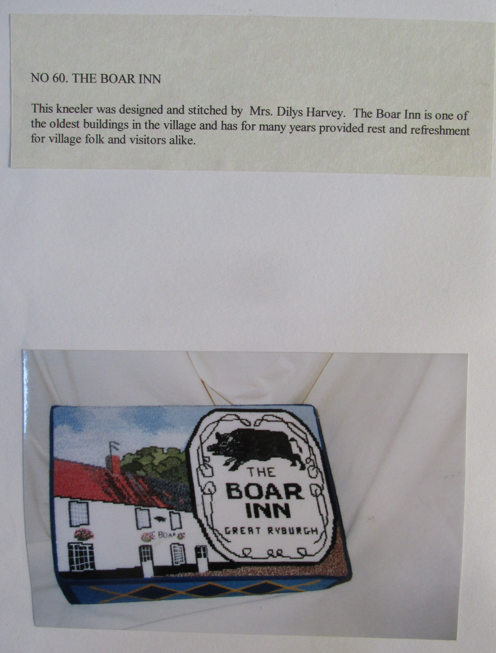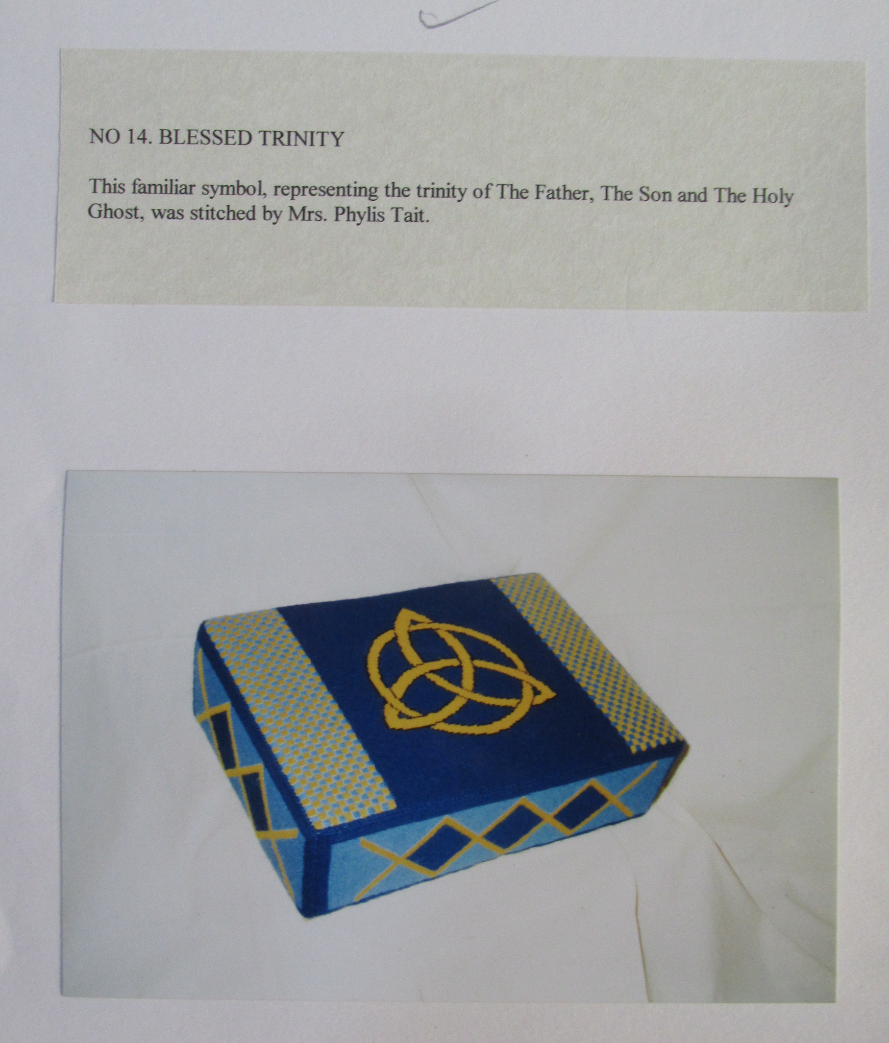 The colourful kneelers in the church as well as being strikingly impressive, hold a special place in the memories and hearts of those that took part in the project. There has long been a boxed book in the church with photographs and details of subject, stitcher and dedicatee. Because the "real thing" occupies the attention, this photographic record is frequently overlooked and so before the photos deteriorate those pages are now reproduced here to perhaps reach a wider audience?
