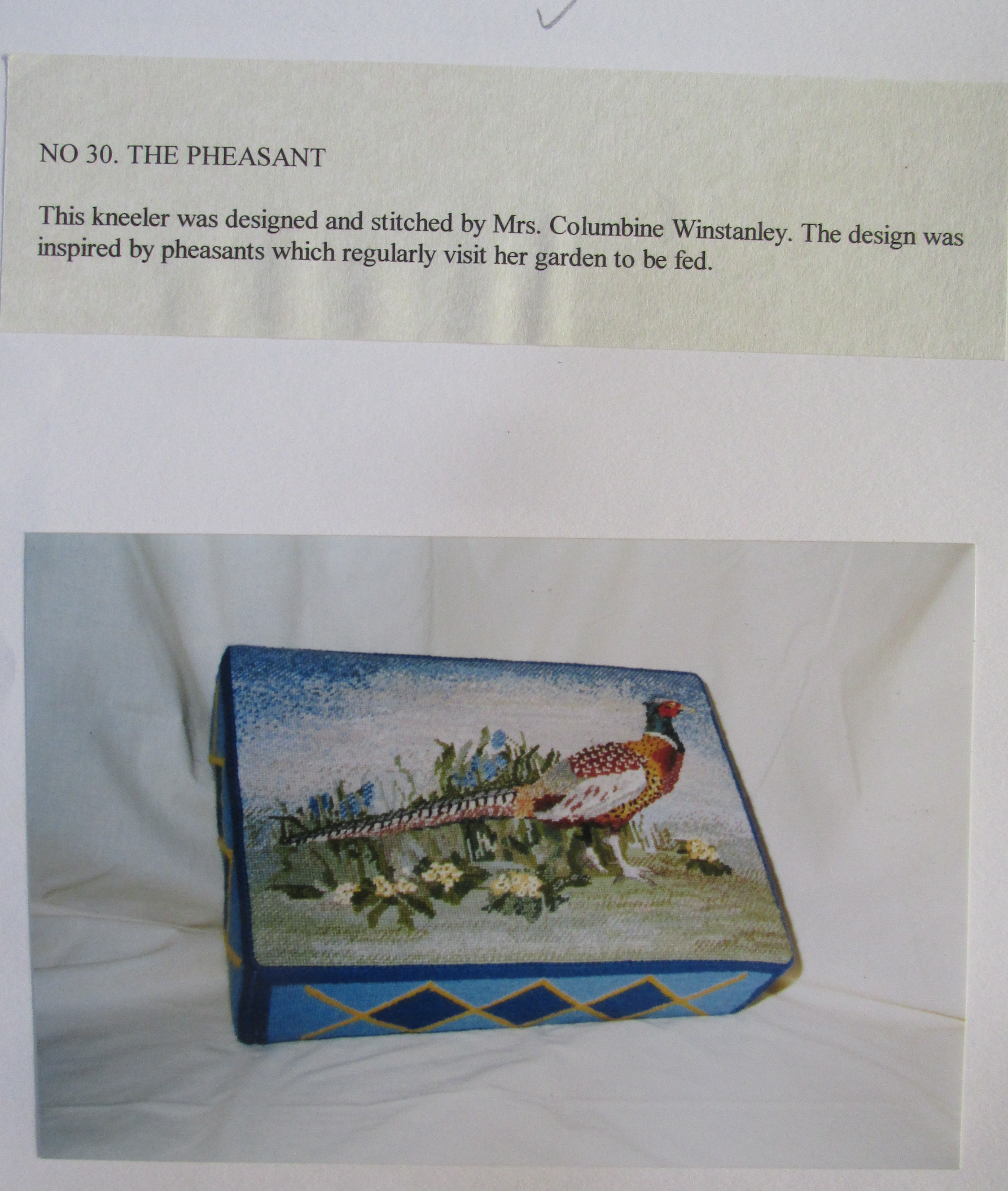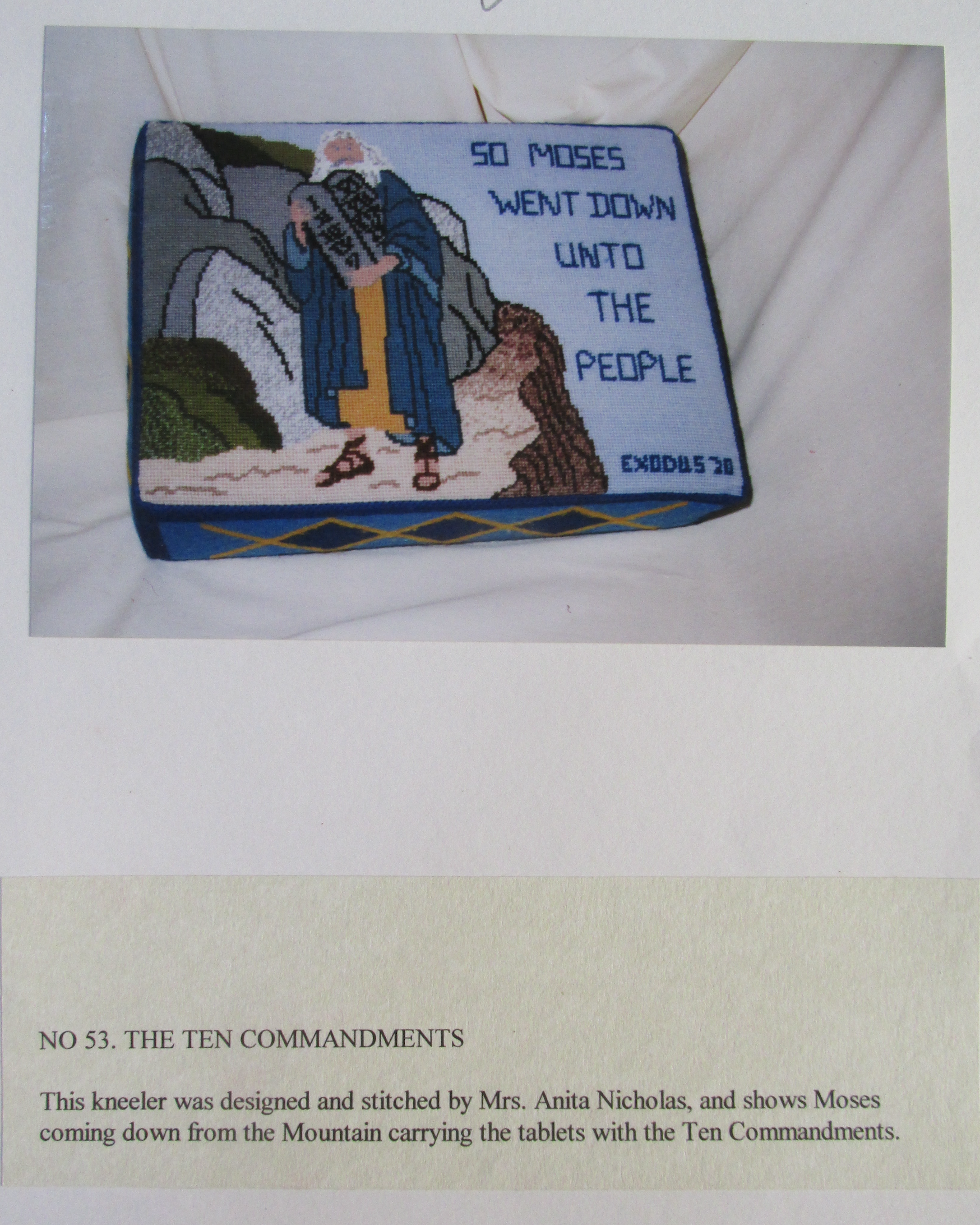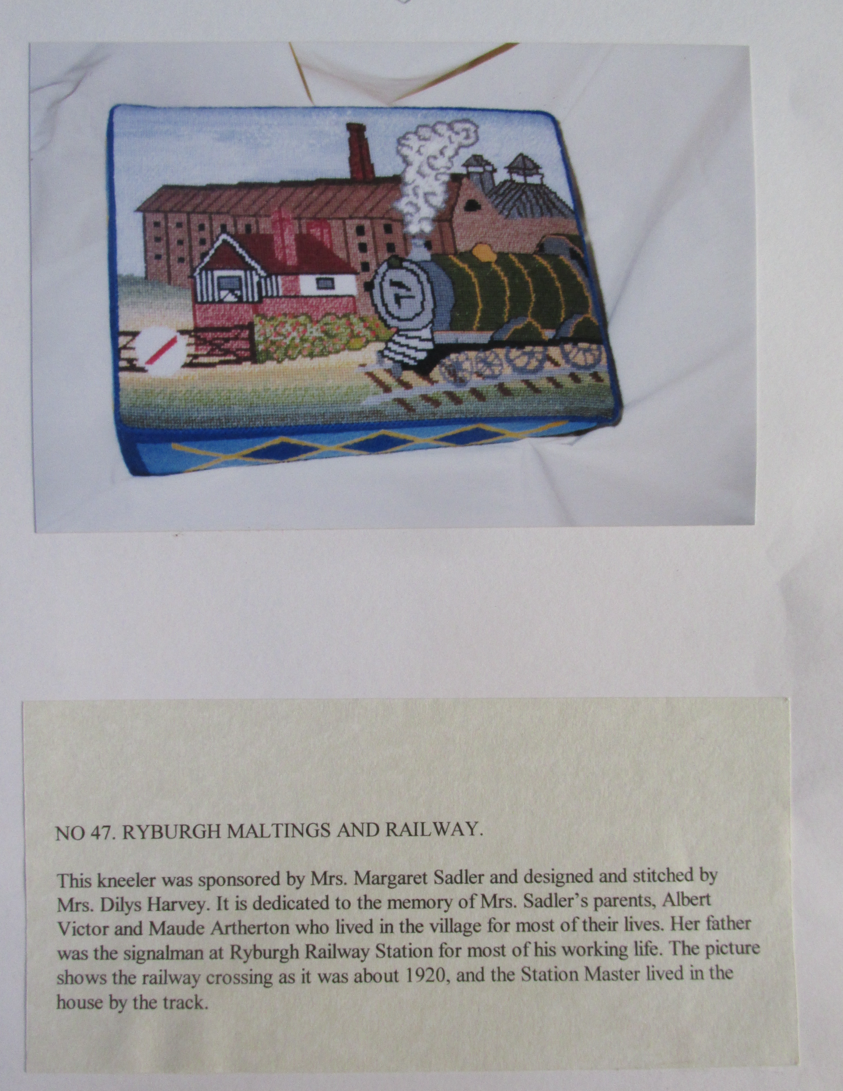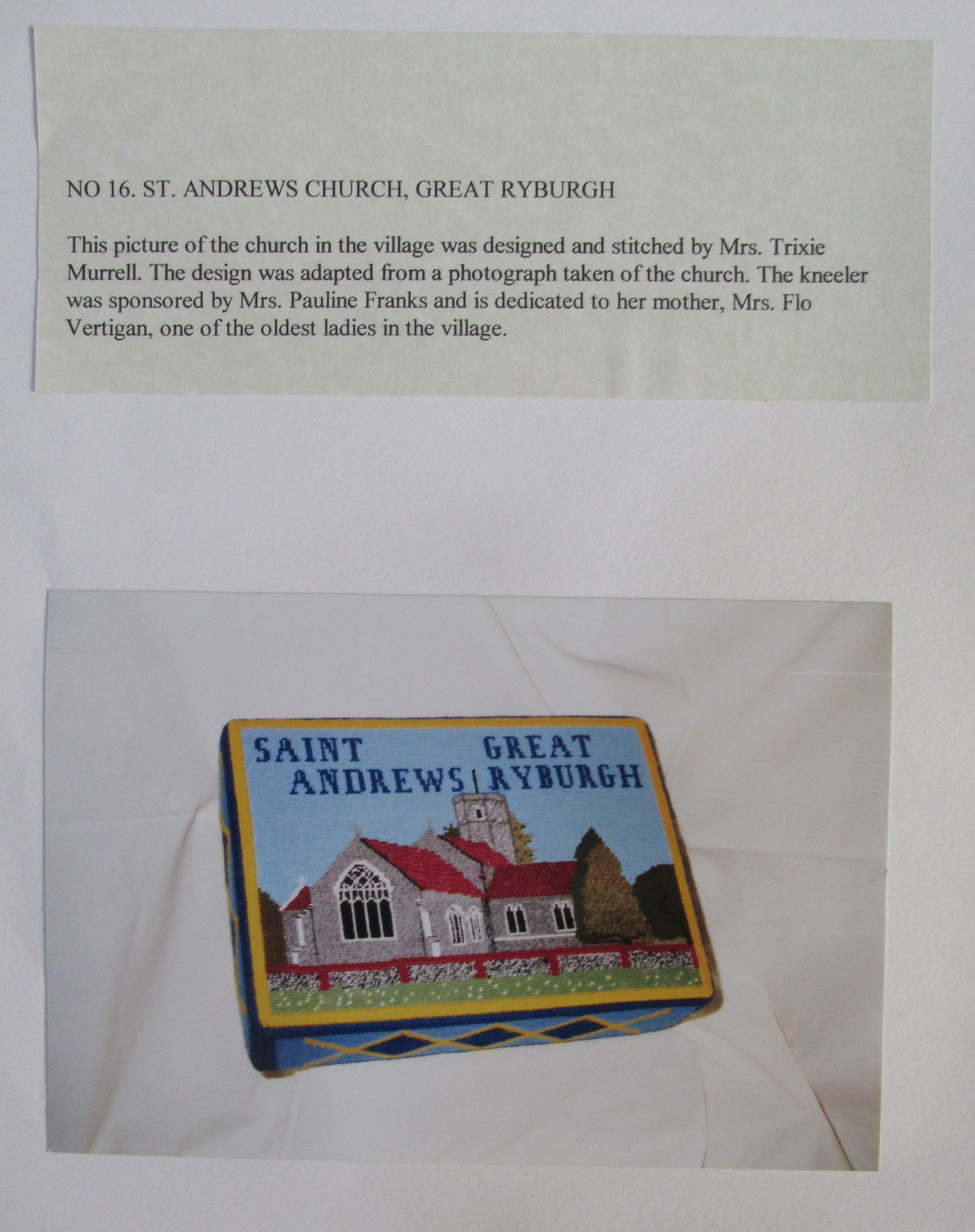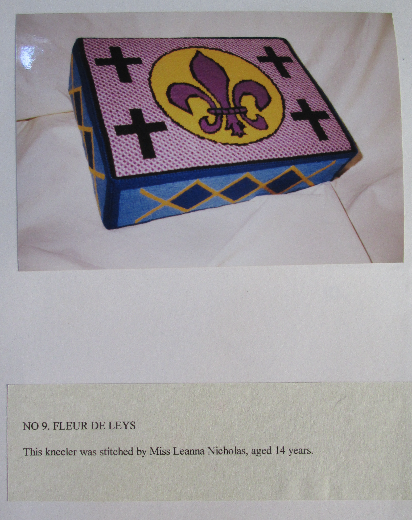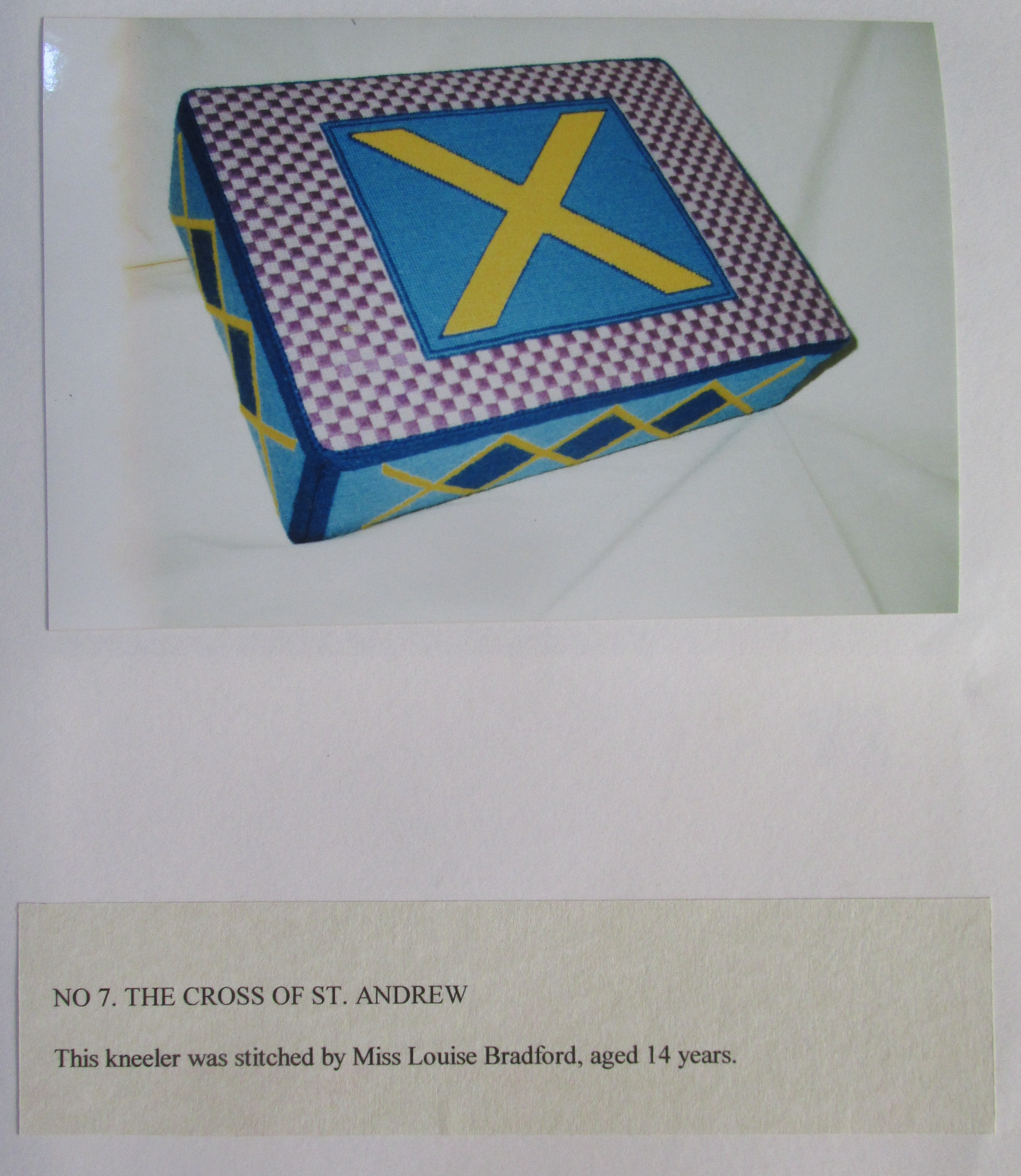 The colourful kneelers in the church as well as being strikingly impressive, hold a special place in the memories and hearts of those that took part in the project. There has long been a boxed book in the church with photographs and details of subject, stitcher and dedicatee. Because the "real thing" occupies the attention, this photographic record is frequently overlooked and so before the photos deteriorate those pages are now reproduced here to perhaps reach a wider audience?