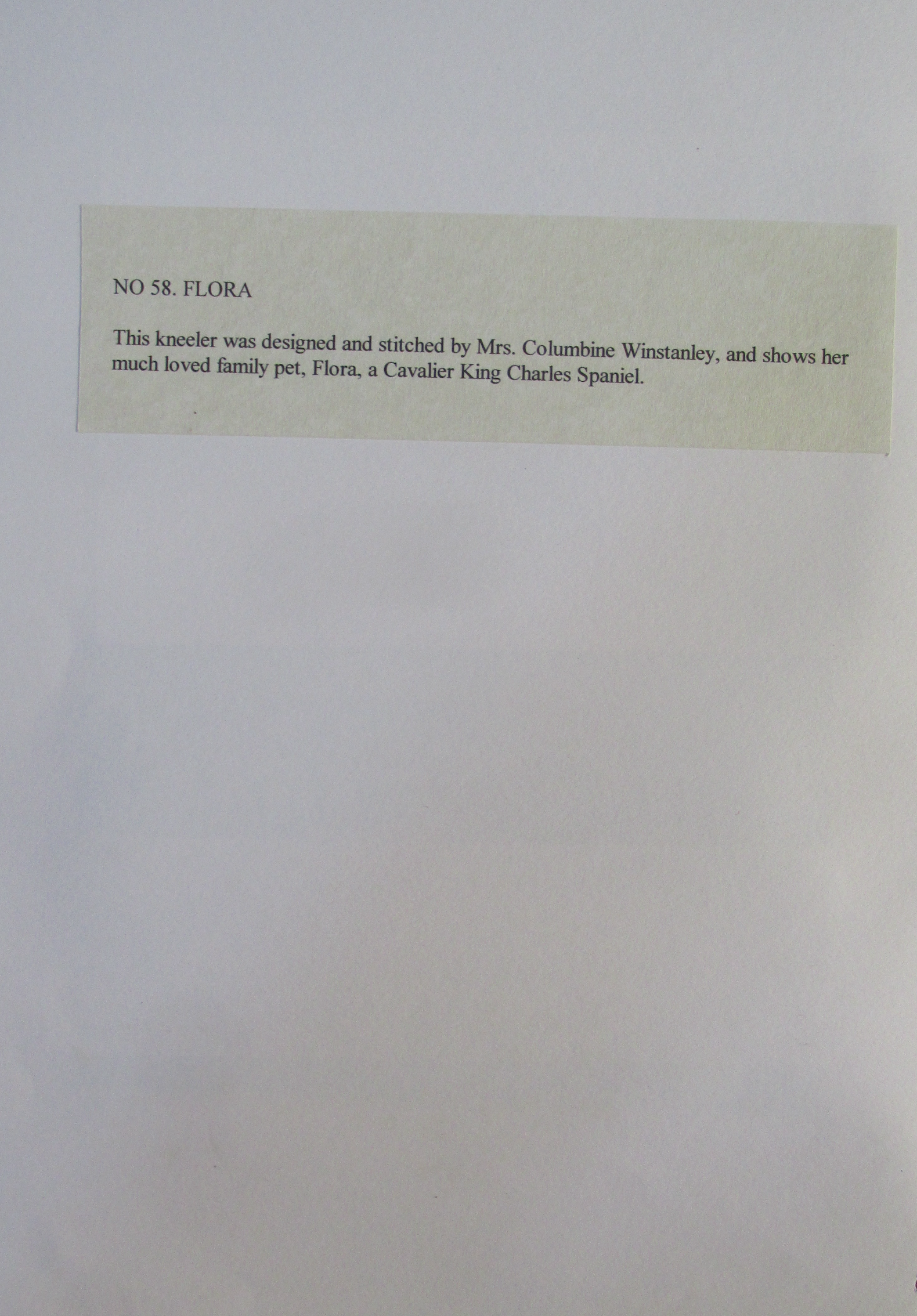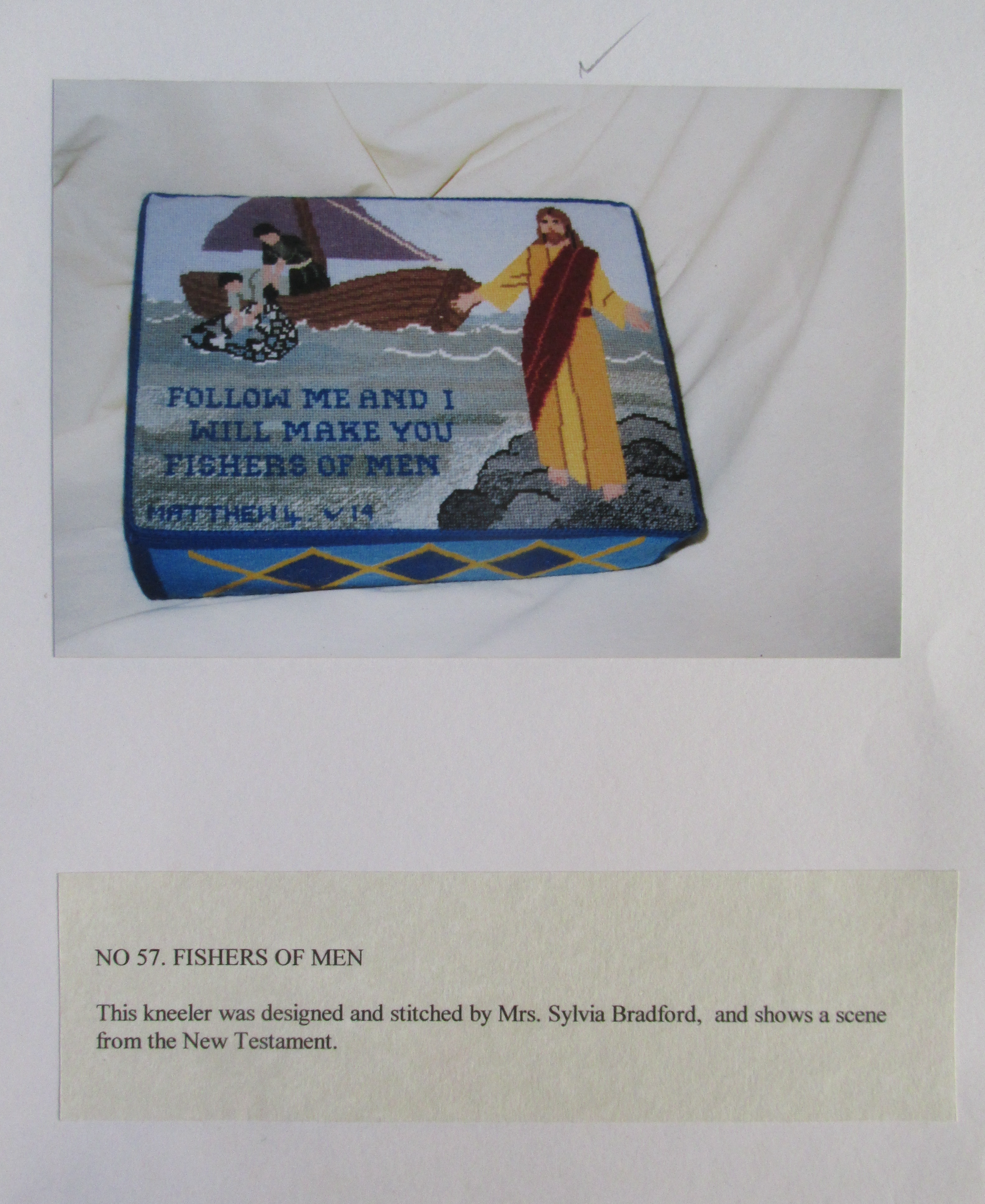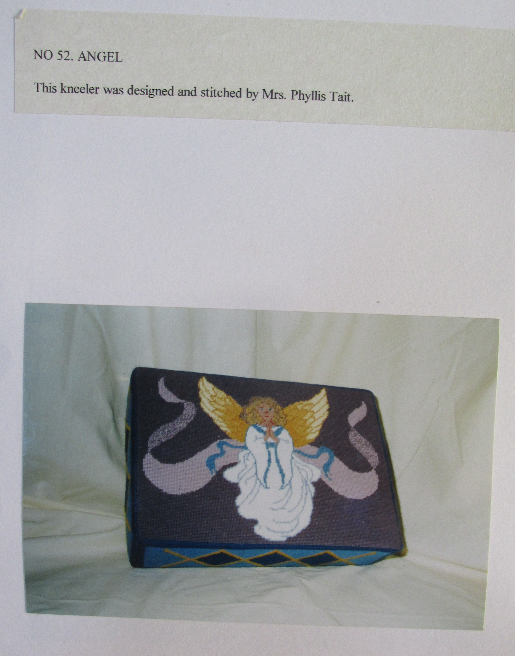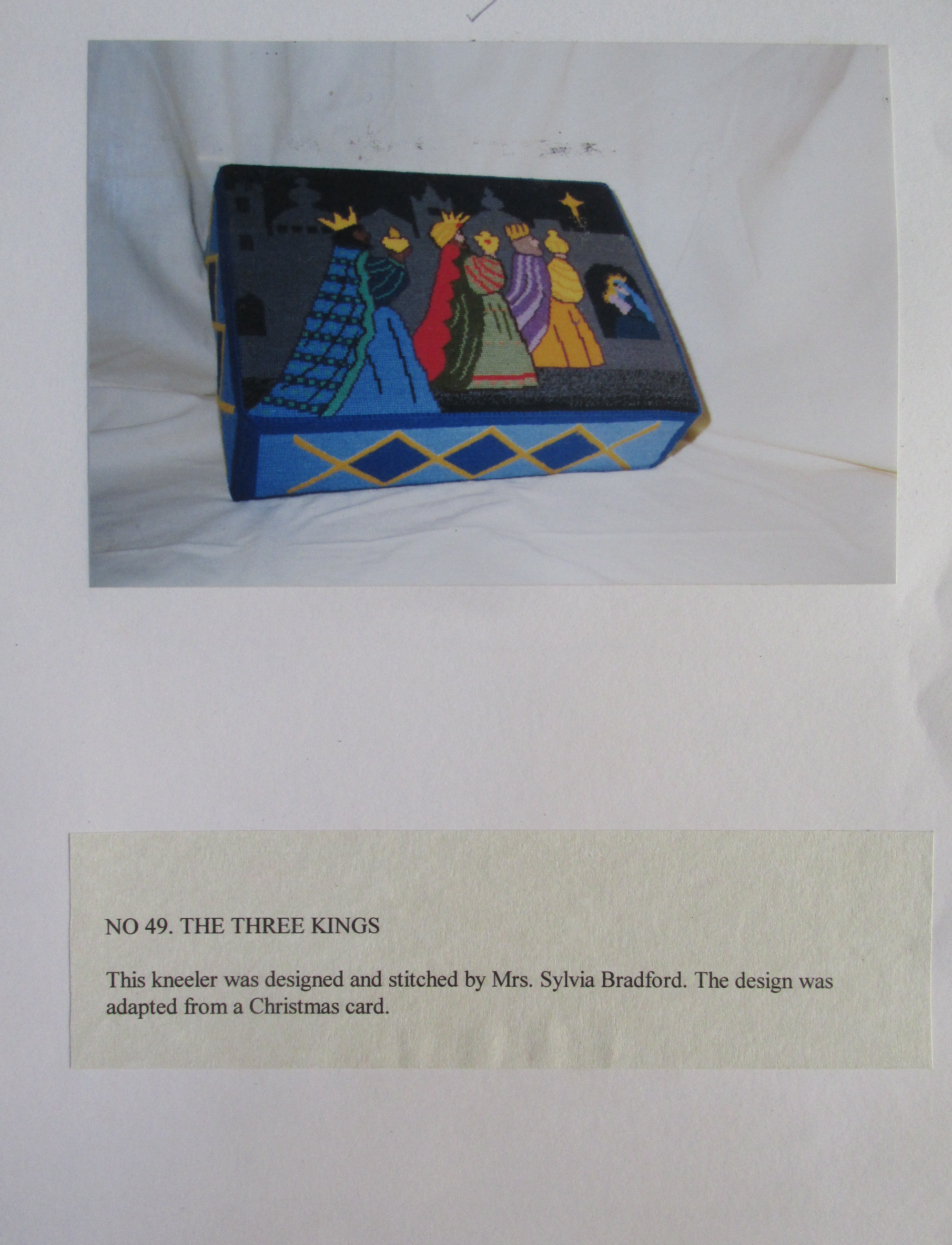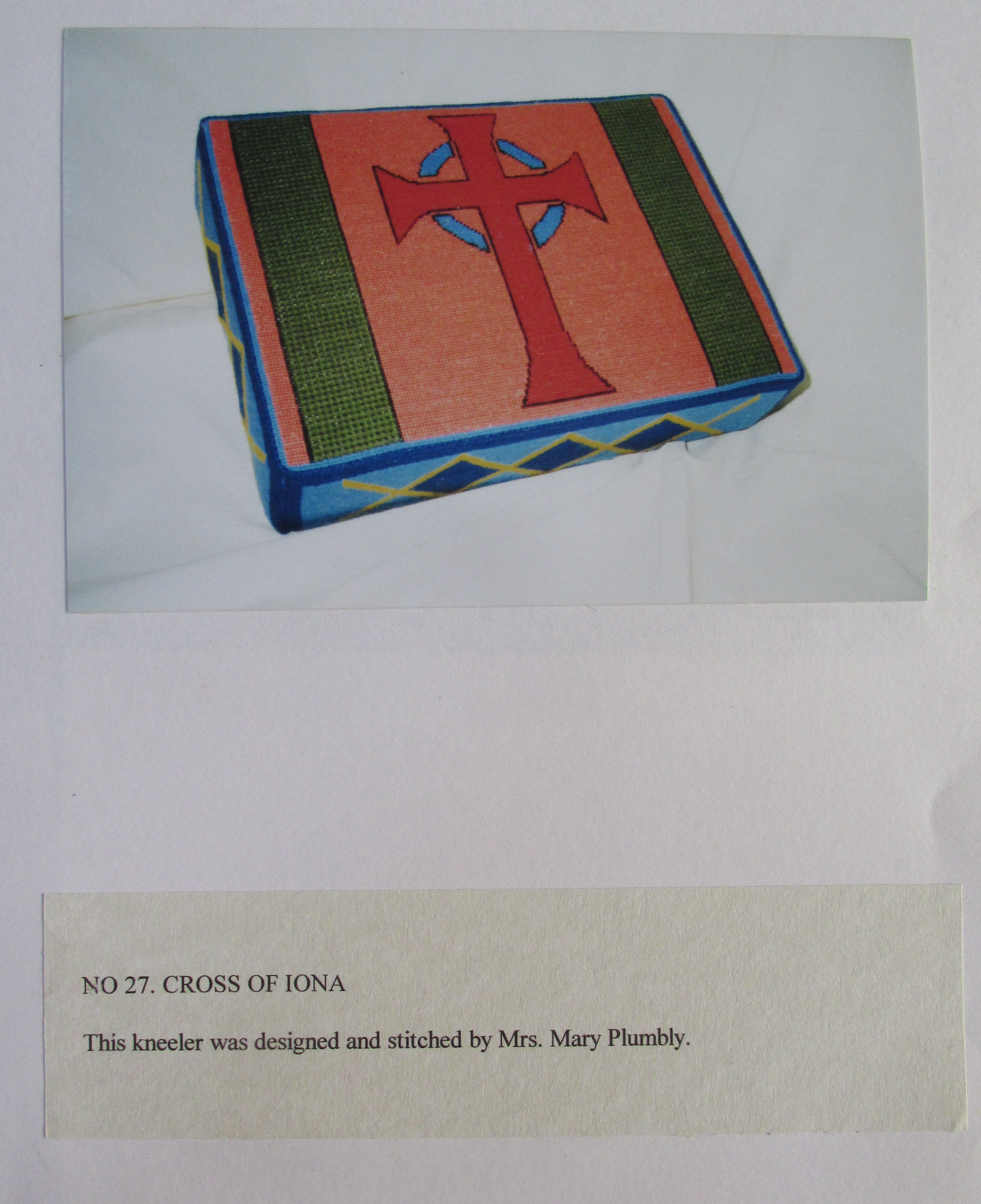 The colourful kneelers in the church as well as being strikingly impressive, hold a special place in the memories and hearts of those that took part in the project. There has long been a boxed book in the church with photographs and details of subject, stitcher and dedicatee. Because the "real thing" occupies the attention, this photographic record is frequently overlooked and so before the photos deteriorate those pages are now reproduced here to perhaps reach a wider audience?