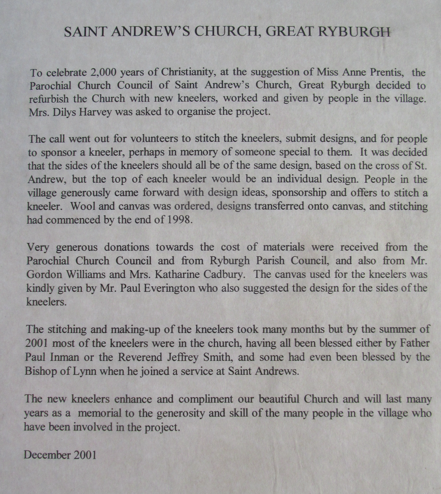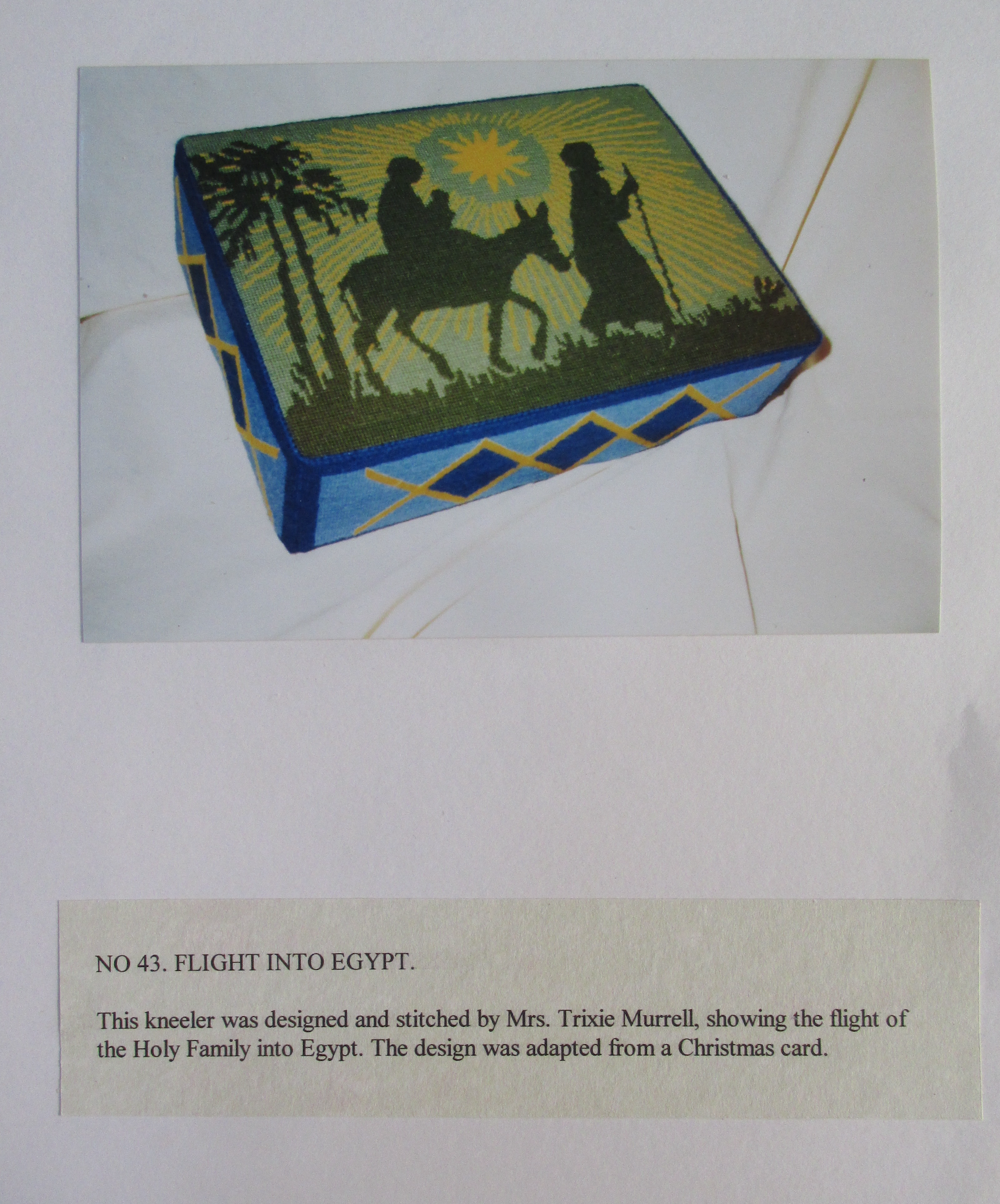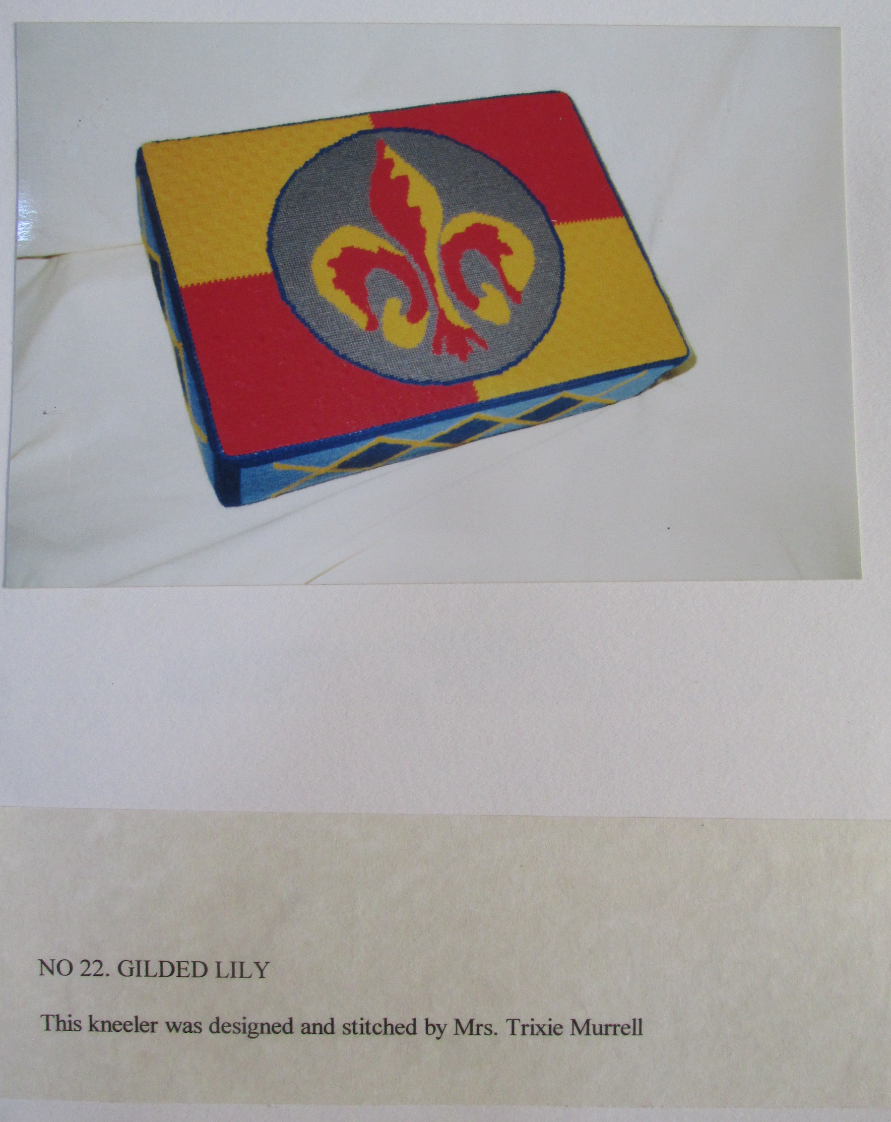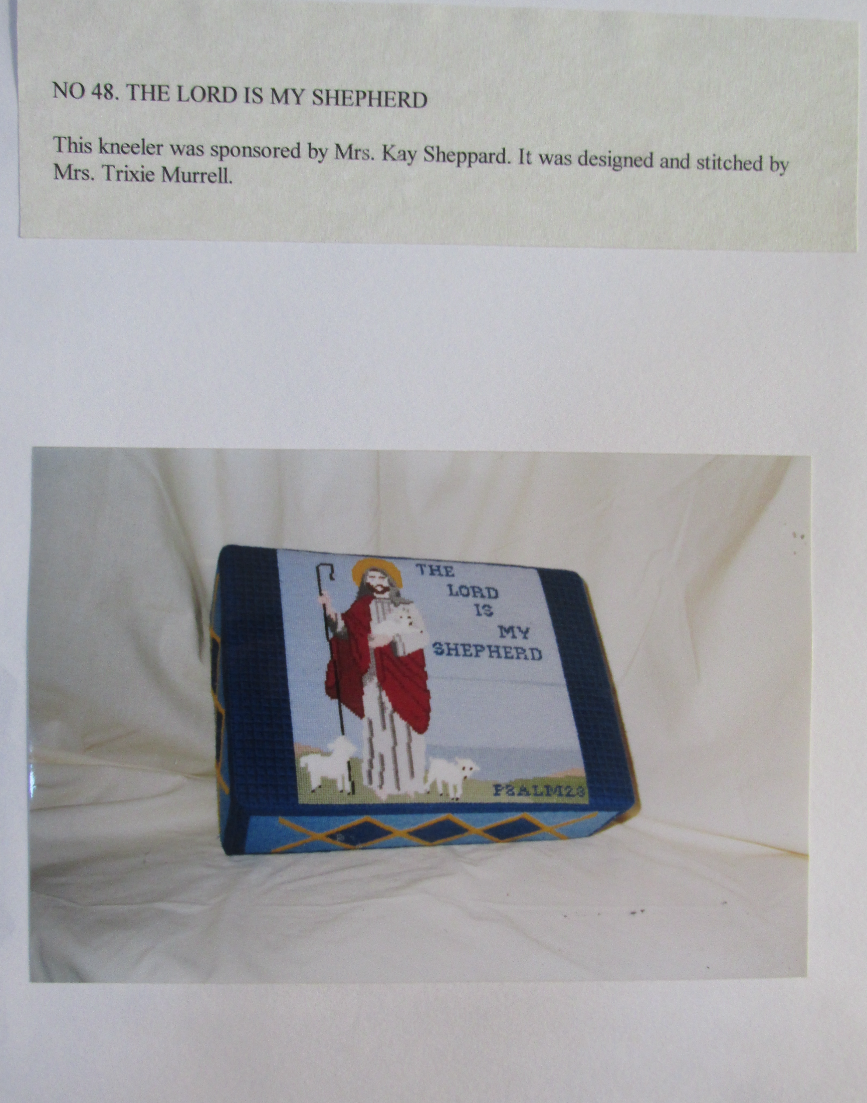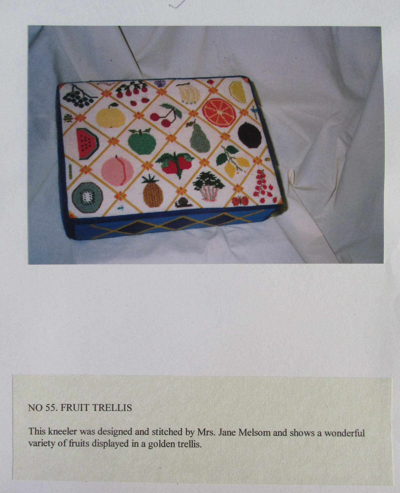 The colourful kneelers in the church as well as being strikingly impressive, hold a special place in the memories and hearts of those that took part in the project. There has long been a boxed book in the church with photographs and details of subject, stitcher and dedicatee. Because the "real thing" occupies the attention, this photographic record is frequently overlooked and so before the photos deteriorate those pages are now reproduced here to perhaps reach a wider audience?