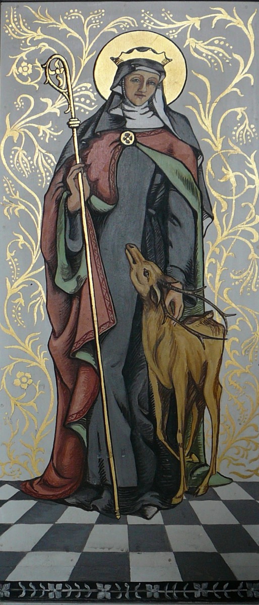 Withburga was the youngest daughter of King Anna of East Anglia. As a girl, she lived with her nurse at Holkham. After her father's death in 654, she built a convent at East Dereham. At times food was short and the community went hungry. One night the Virgin Mary appeared to Withburga, saying 'Send two of your women down to the stream every morning, where two does will stand to be milked'. This they did, and after that there was always butter and cheese for all.